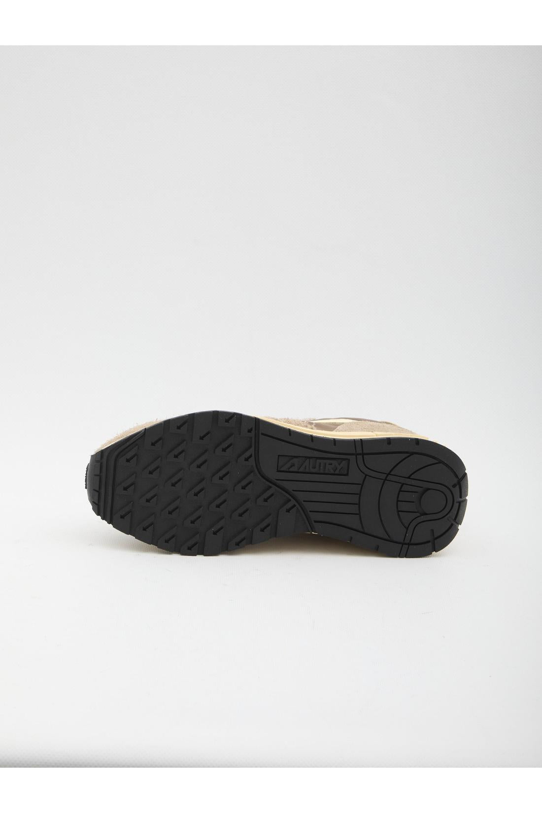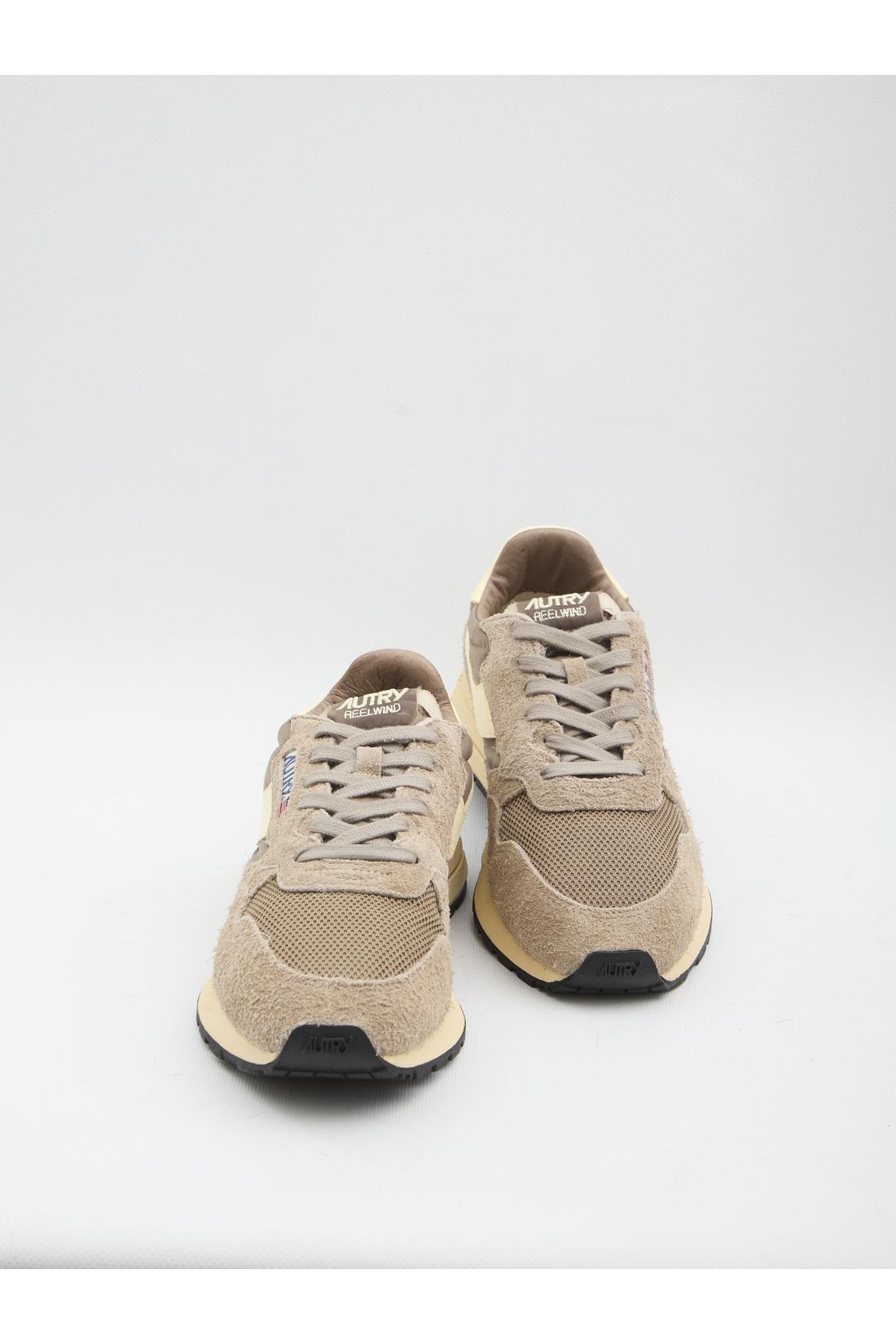 Beige nylon and suede Reelwind Low sneakers with smooth cream-colored leather inserts on the heel and sides. They feature a round toe with a mesh insert, lace-up closure, a tongue with a branded tag, a side logo, an embossed signature on the heel patch, and a rubber sole. Dust bag included. Any leather imperfections should not be considered manufacturing defects, but a characteristic of the material.