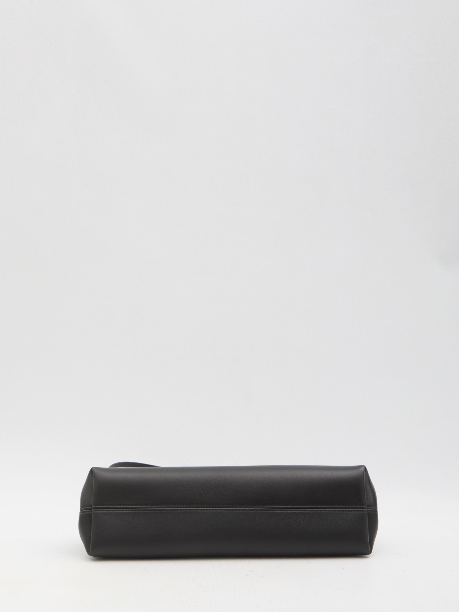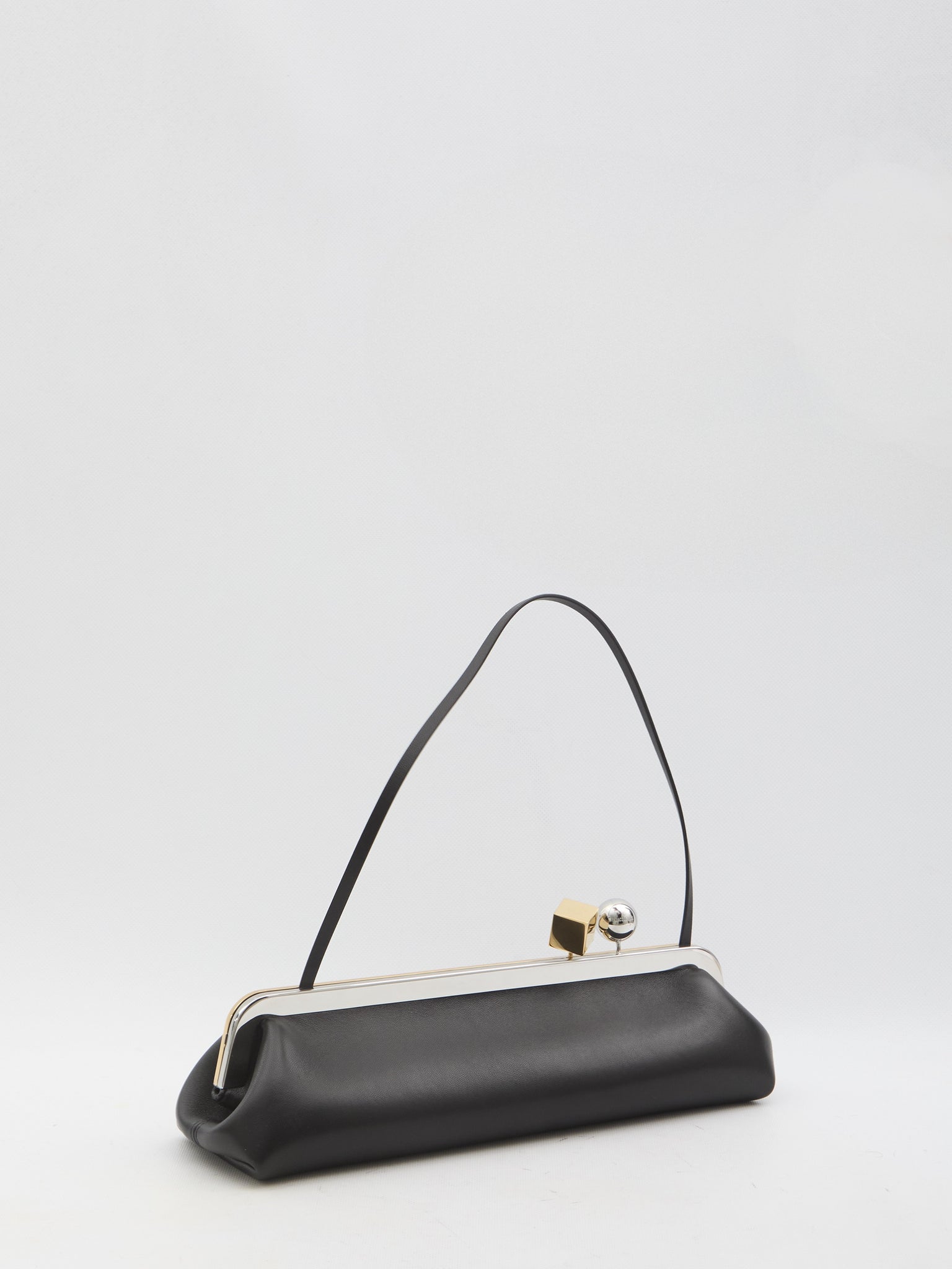 Salon long pouch in ultra-soft black lamb leather. It features a snap closure with round and square knobs, engraved logo in silver and gold-tone metal, a removable thin shoulder strap, one main internal compartment, and an internal flat pocket, with a cotton lining. Dust bag included. Any imperfections in the leather should not be considered manufacturing defects, but rather a characteristic of the material.