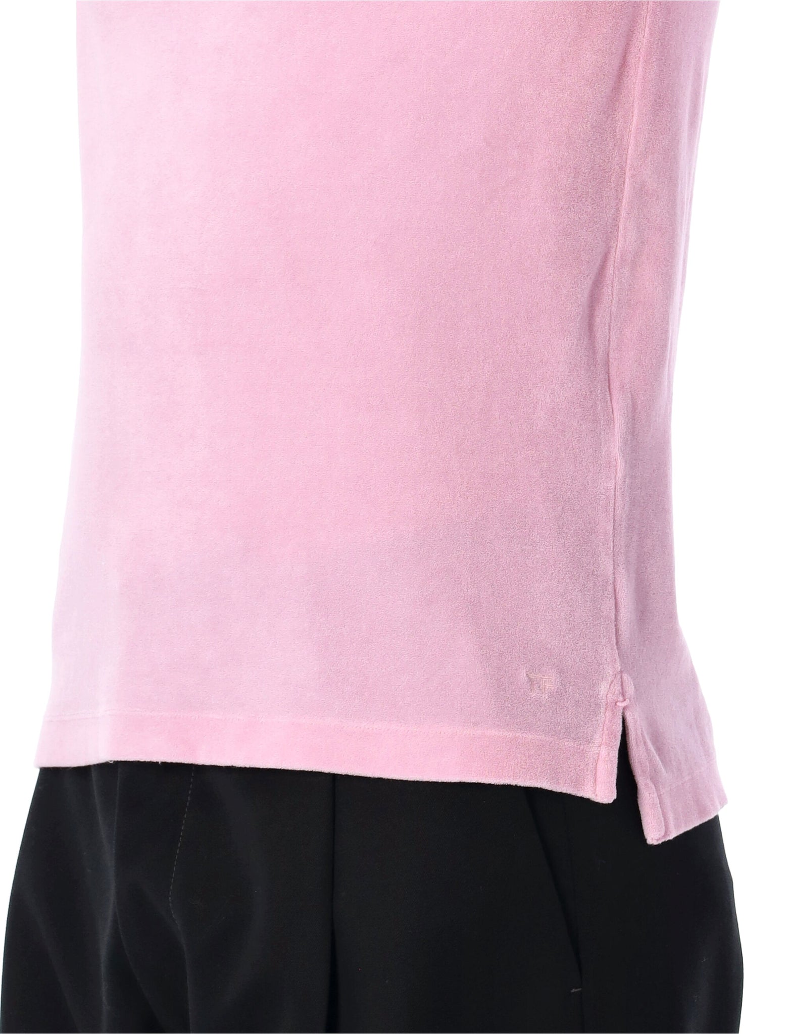 This Tom Ford towelling polo combines luxury and comfort with its soft cotton blend. Features include a pointed collar, two-button placket, short sleeves, and side slits for easy movement. Ideal for casual outings.