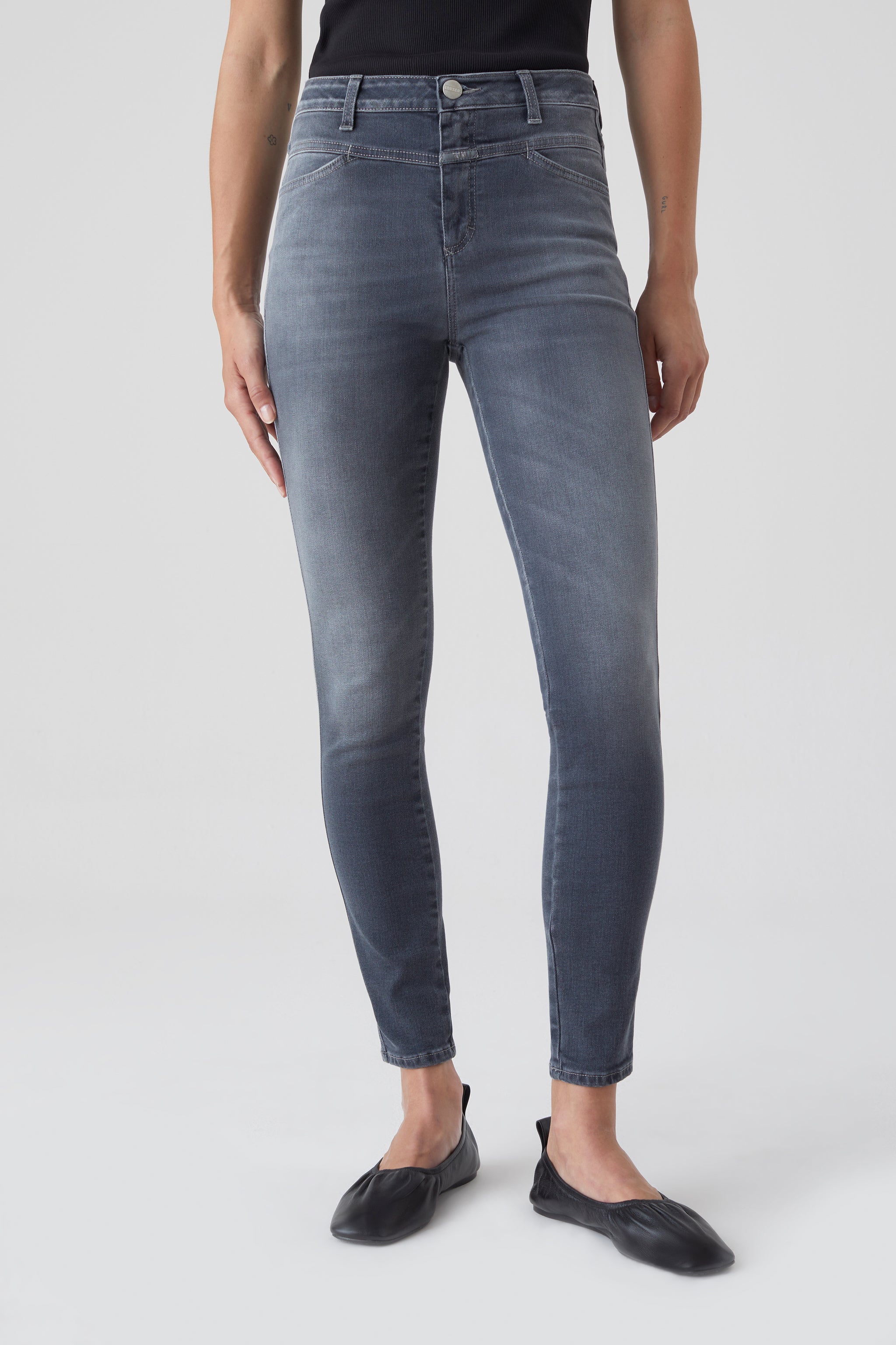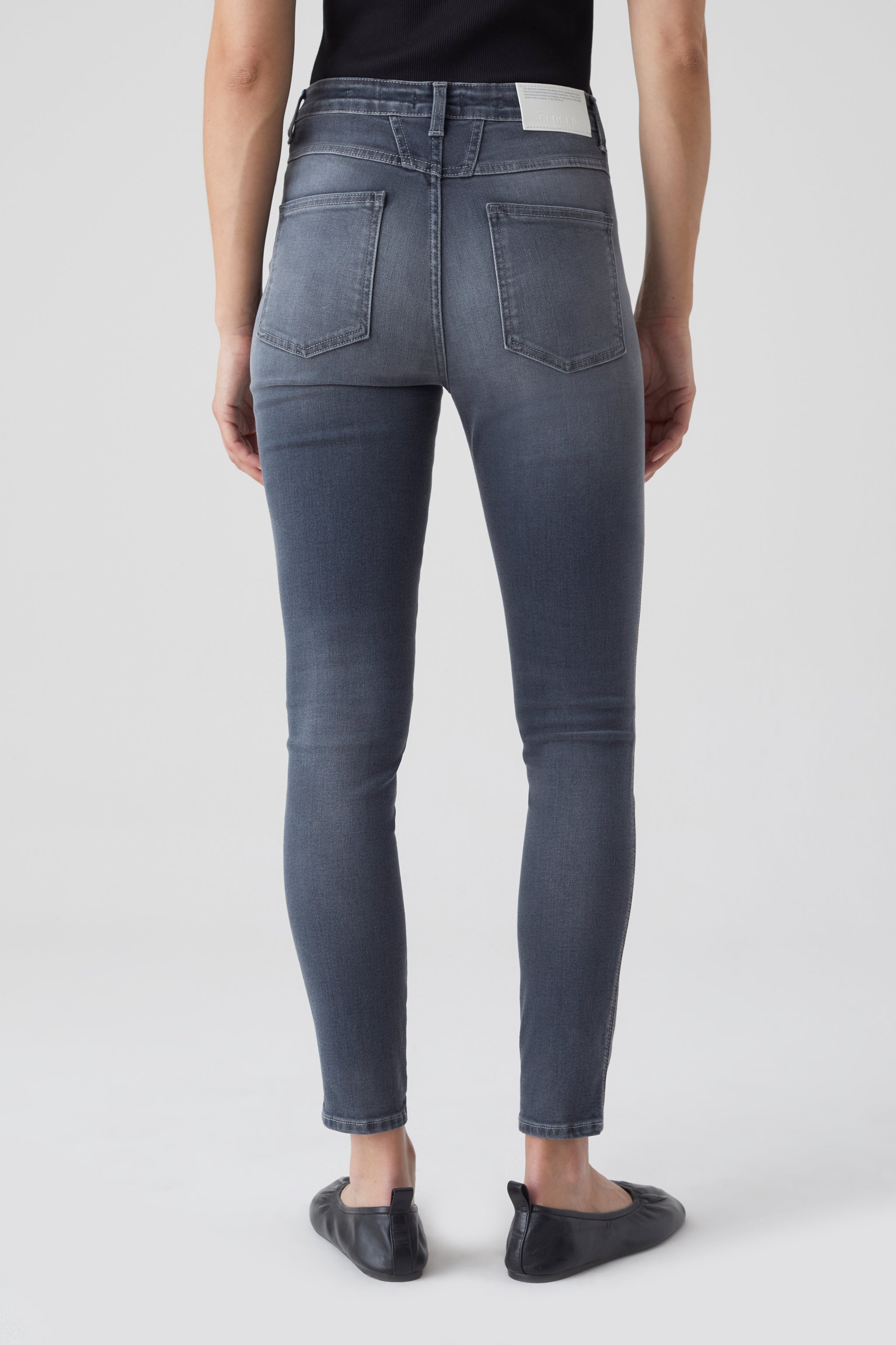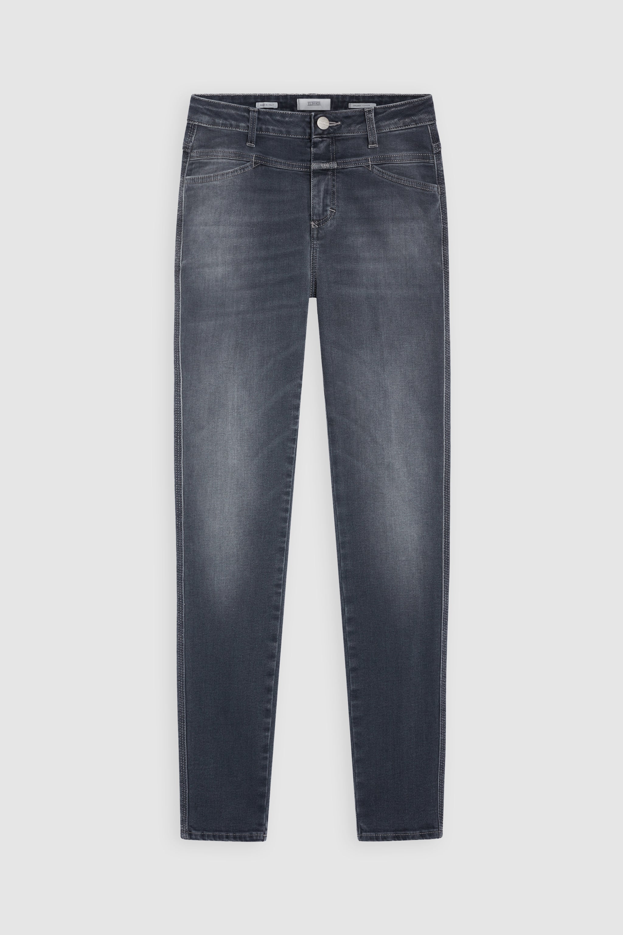 Teil Unserer Nachhaltigen Denim-Linie A Better Blue: Style Skinny Pusher Mit Hohem Bund Aus Italienischem Super Stretch Denim Mit Bio-Baumwolle. Diese Jeans Wurde Unter Ressourcen- Und Umweltschonenden Bedingungen Zu 100 Prozent In Italien Gefertigt.