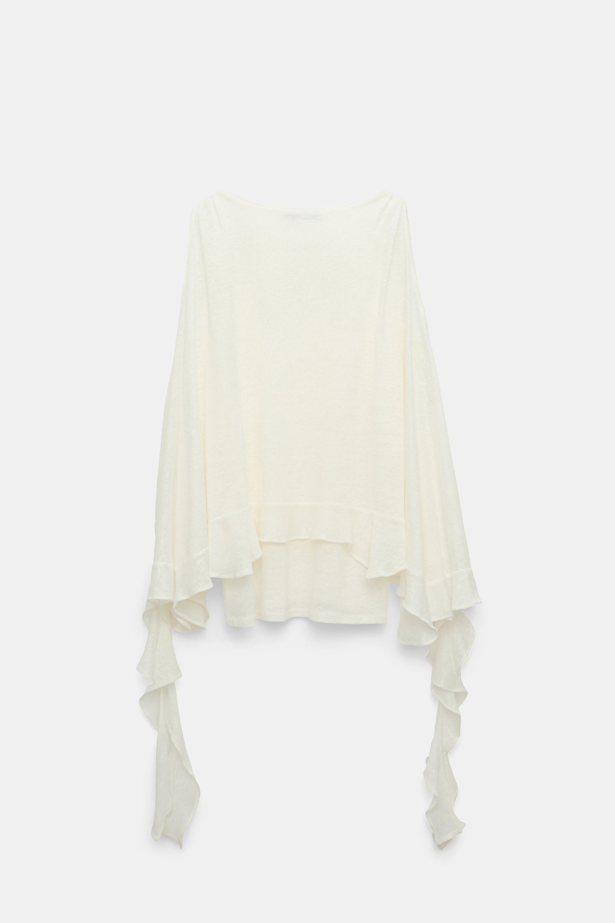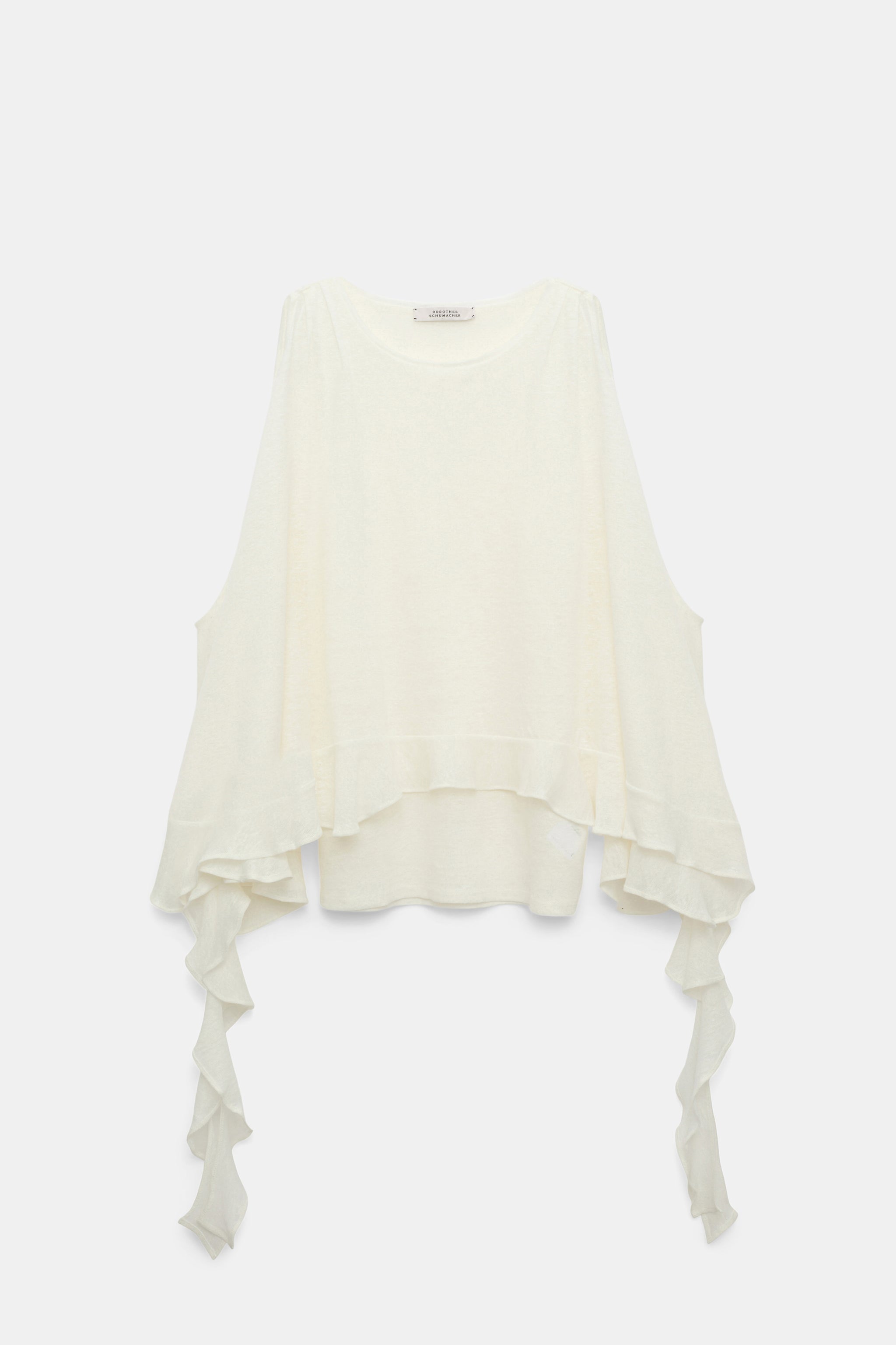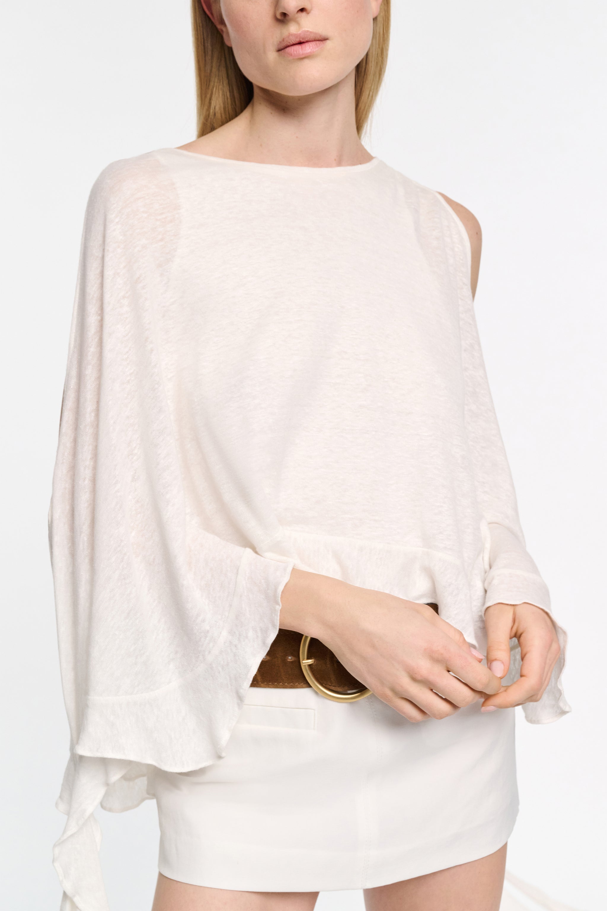 Das Top aus Hanf überzeugt durch Volants und ein Falten-Detail an der Schulternaht. Der ausgestellte Saum mit längeren Seitenvolants verleiht dem Top eine besondere Dynamik.