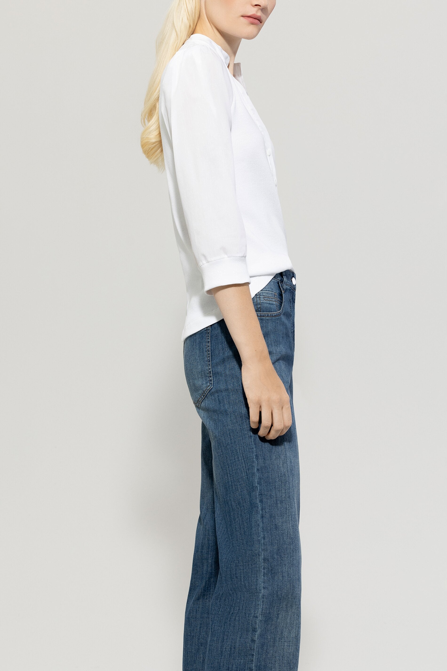 Blusenshirt aus geripptem, elastischem Baumwoll-Jersey mit leicht verkürzten Ärmeln und einer Blende aus Blusenstoff. Raffungsdetails an den Schultern sowie eine halblange Knopfleiste auf der Vorderseite und gerippte Ärmelbündchen kombinieren einen lässigen Look mit eleganten Details.