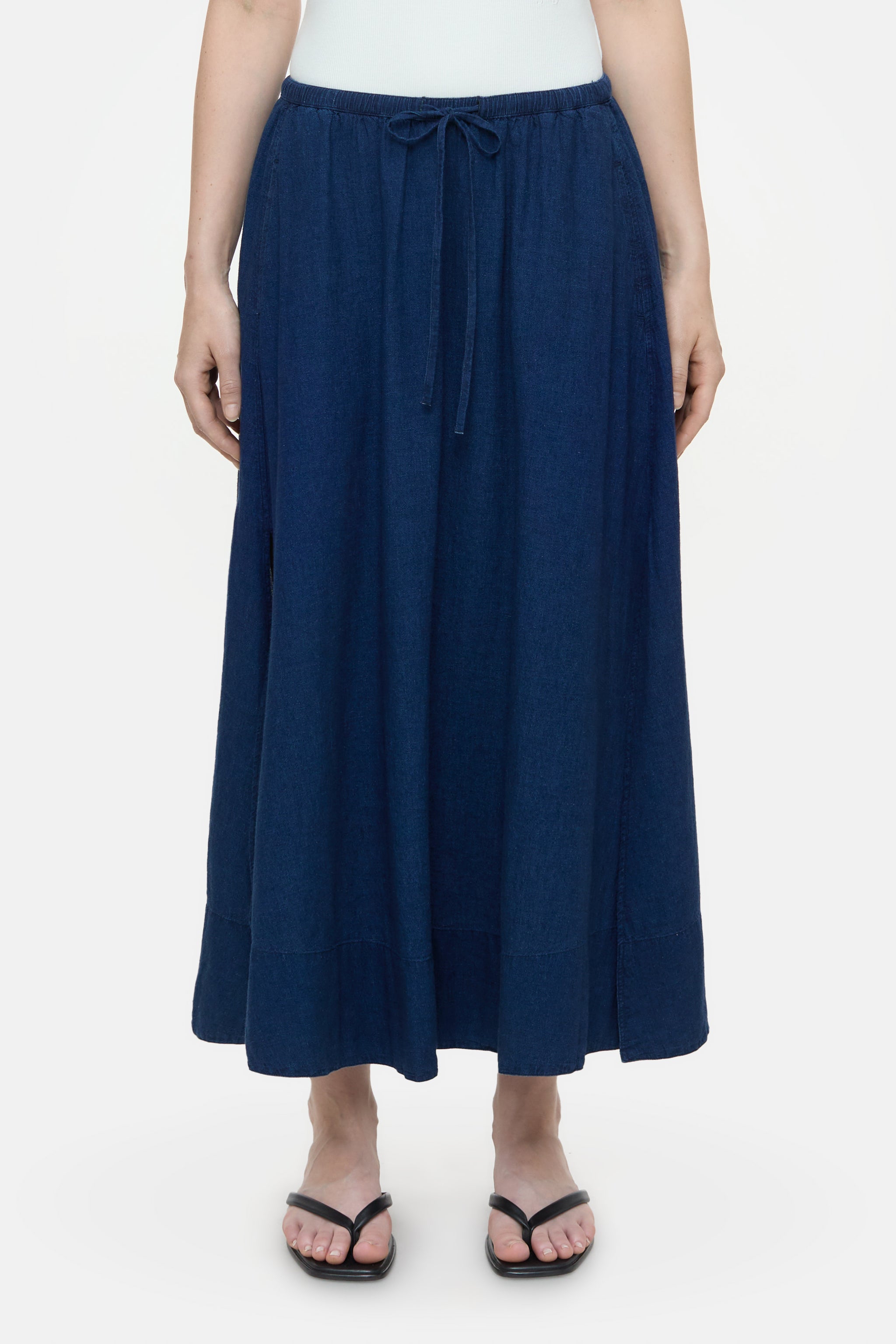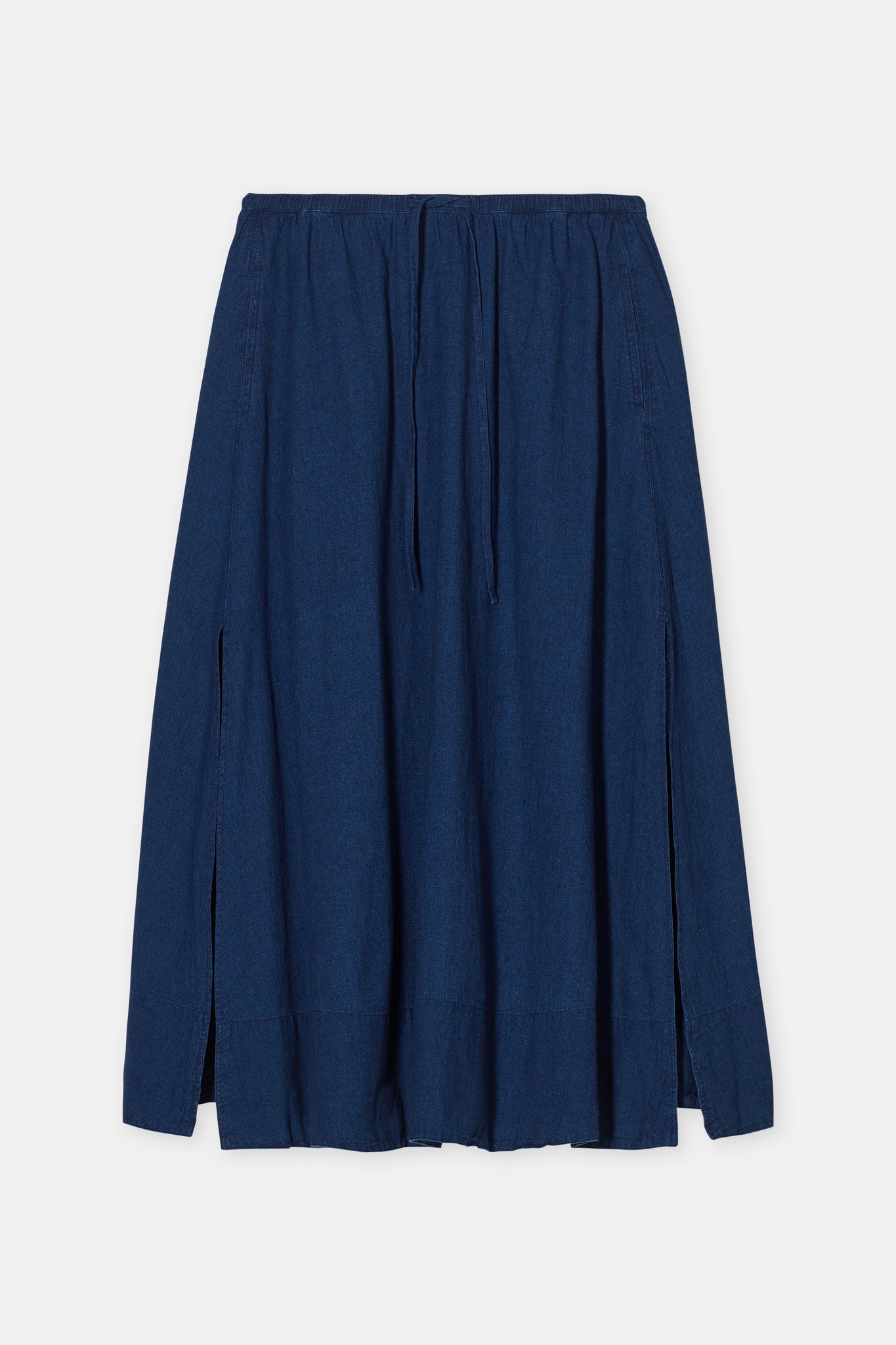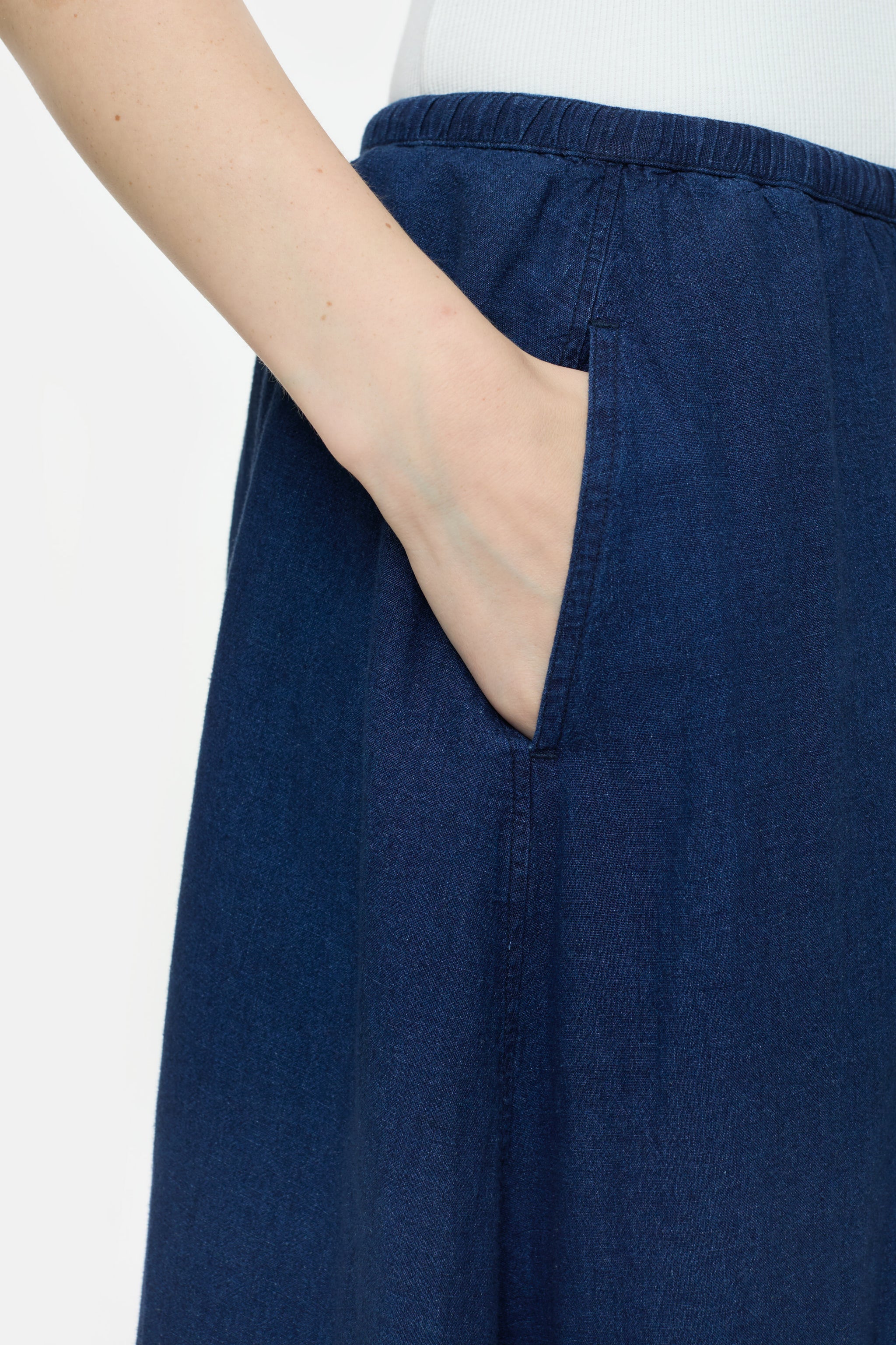 indigoblaue, luftige Leinen-Baumwoll-Mischung, seitliche Schlitze und elastischer Bund