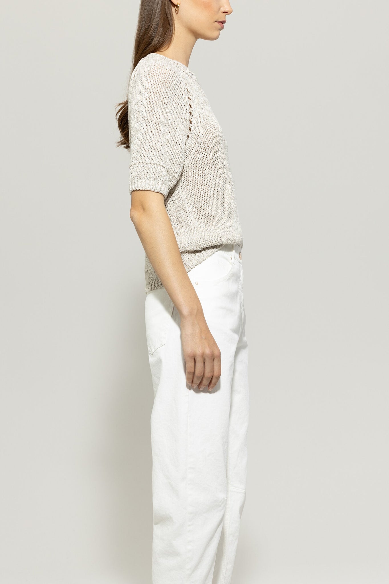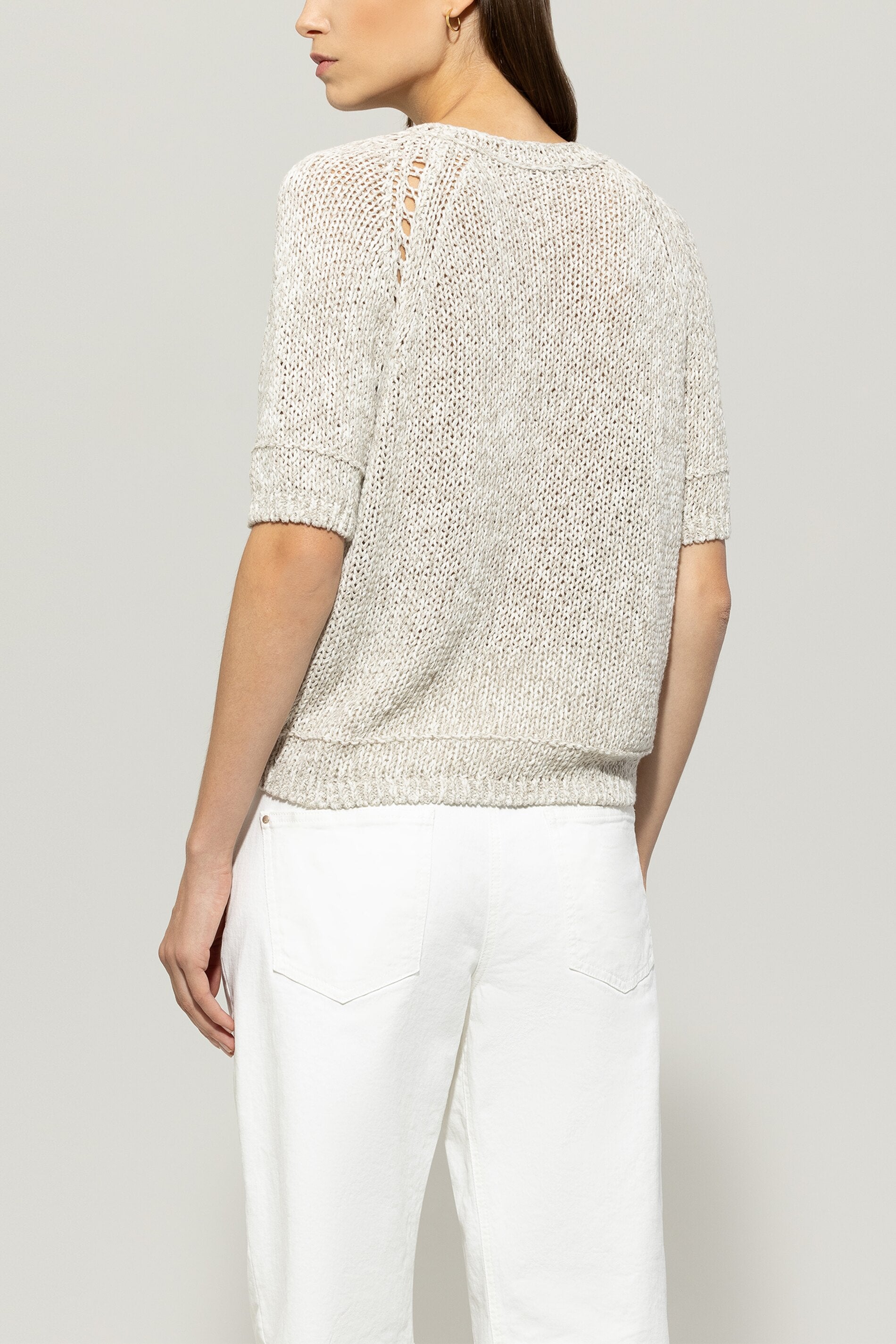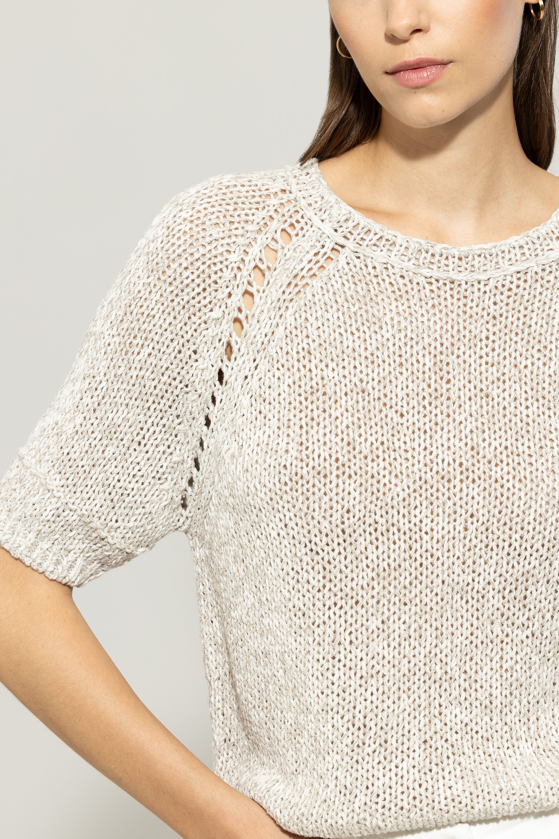 Etwas kürzer geschnittener Pullover aus italienischem Leinen-Baumwoll-Garn in dezenter Two-Tone-Optik mit Rundhalsausschnitt. Die kurzen Raglan-Ärmel erhalten durch das Ajour-Lochmuster einen raffinierten Akzent.