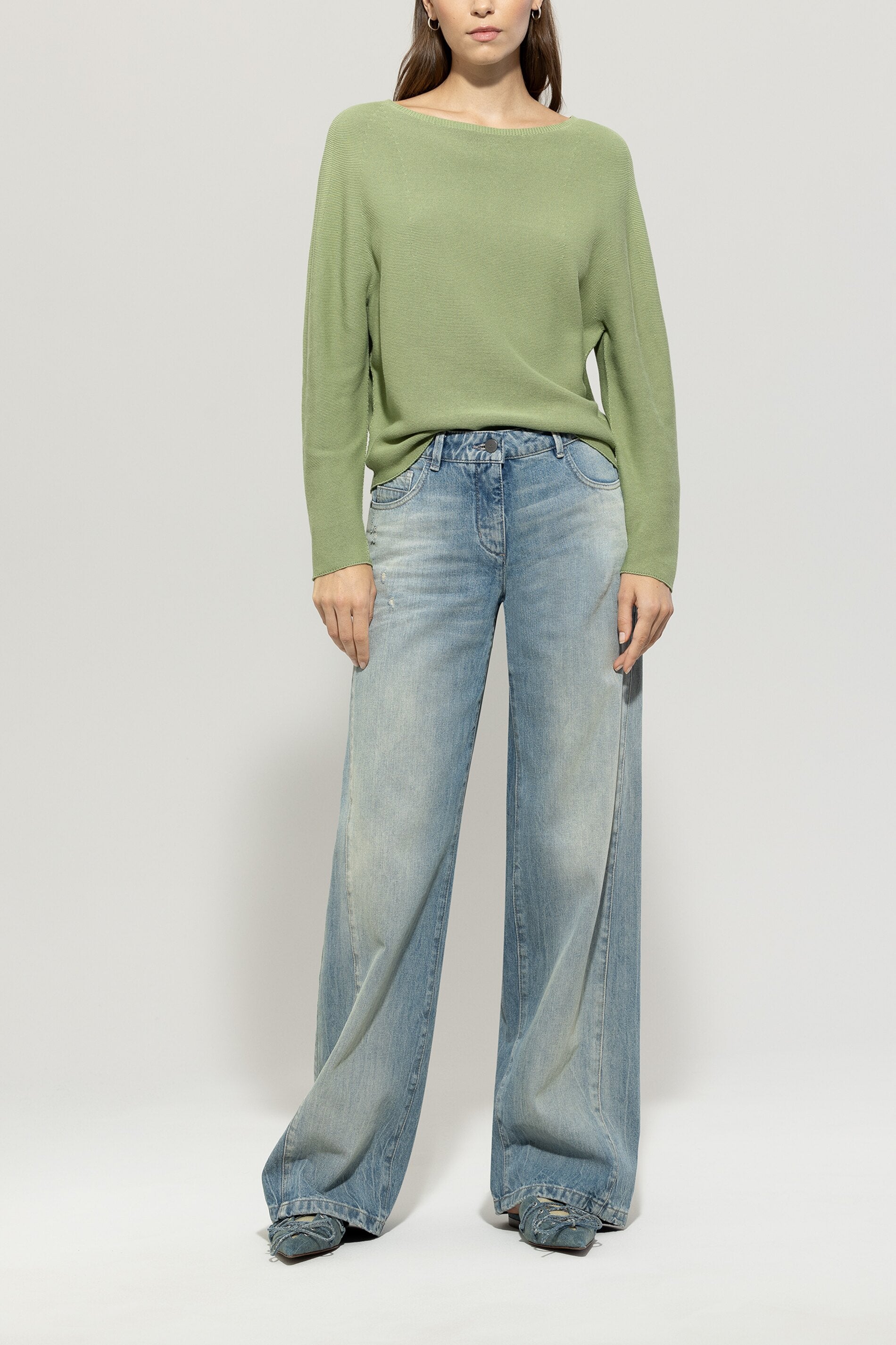 Strickpullover in Links-Struktur aus dünnem Baumwollgarn. Minderungsdetails im Schulterbereich betonen die Passform und ein gerippter Rundhalsausschnitt vollendet das Design.