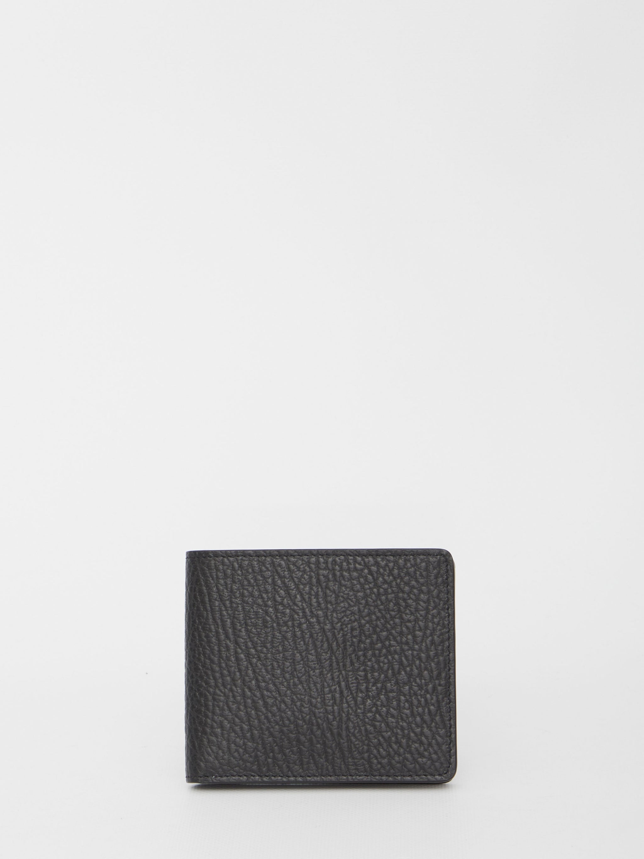 Bi-fold wallet in black grained leather with four seams detailing at the back and embossed numerical logo on the inside. It features two bill compartments, eight card slots and two additional slip pockets. Dust bag included. Any leather imperfections are not to be considered manufacturing defects, but a peculiarity of the material.