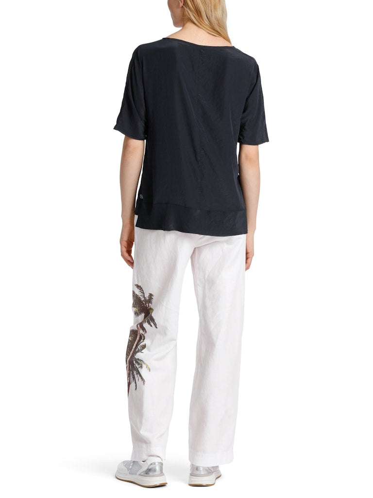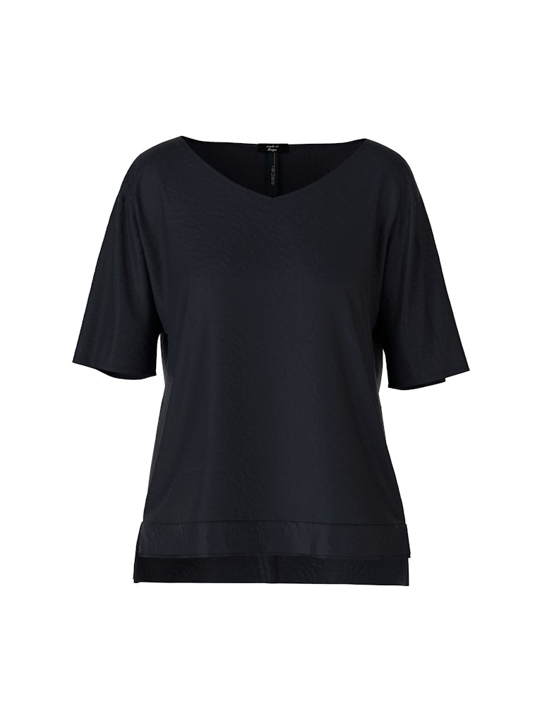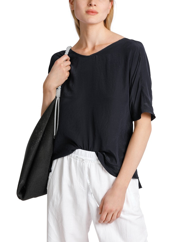 Diese unifarbene Bluse überzeugt mit ihrem fließenden, zum Teil recycelten Material. Sie kommt mit weiter Silhouette und verlängertem Rücken. Die Ärmel sind angeschnitten. Ihren lässigen Stil erhöhen die offenkantige Einsätze am Ärmelsaum und dem großen Rundhalsausschnitt.