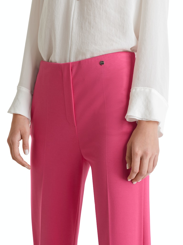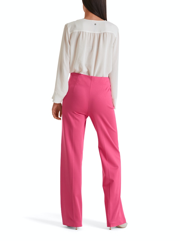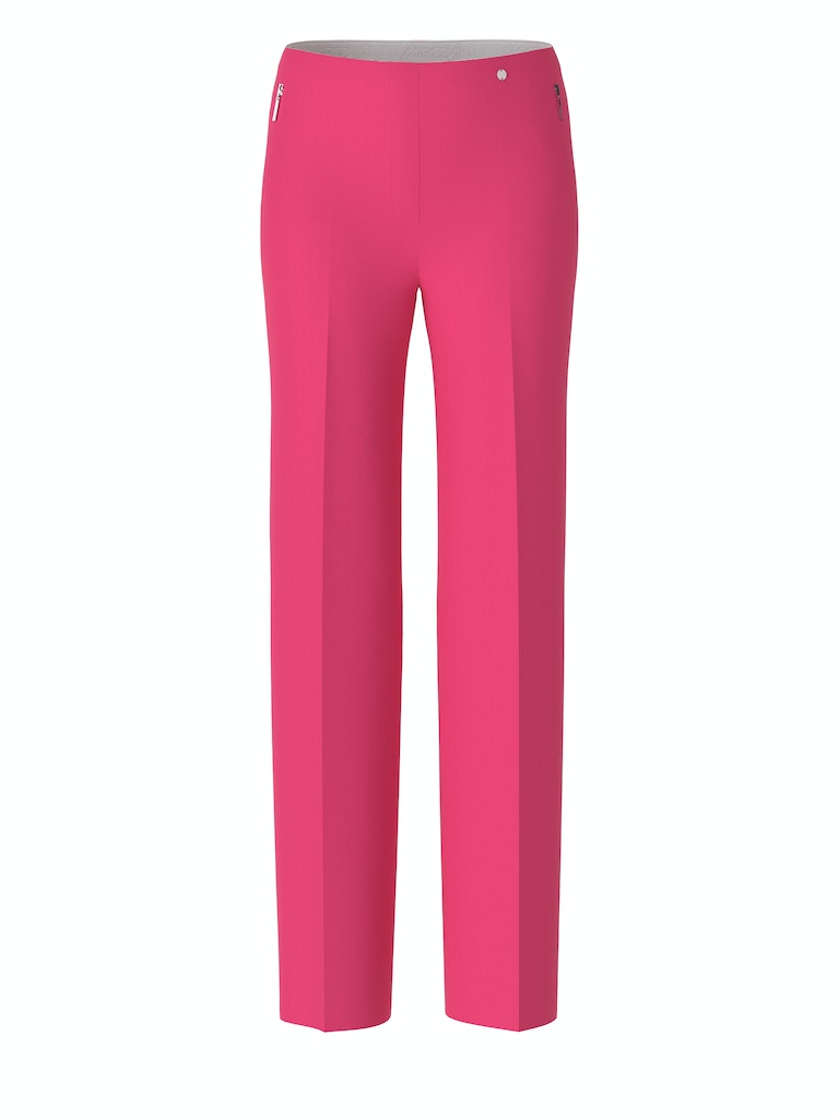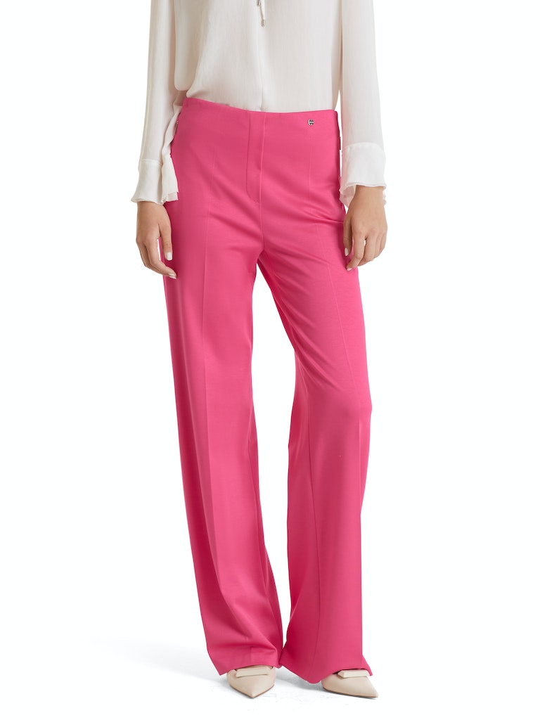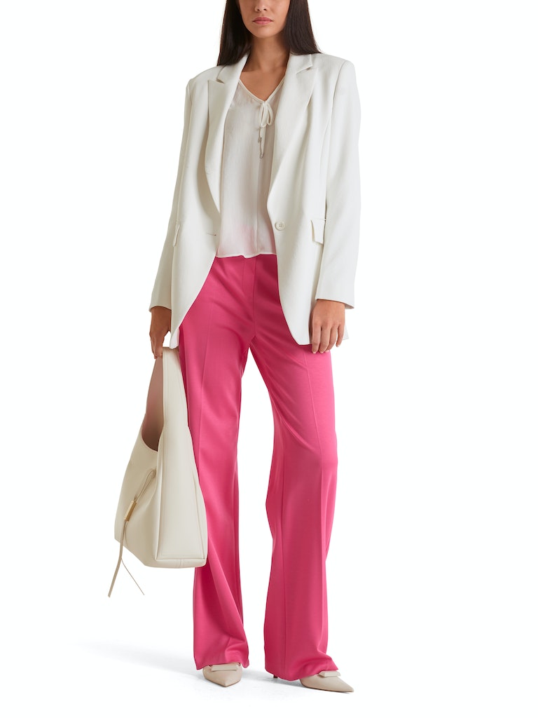 Gefertigt im Material-Mix mit Viskose und Elasthan präsentiert diese Hose einen weiten Schnitt. Die Bügelfalte sorgt für eine Business-Note, während die Reißverschlusstaschen an den Seiten einen sportiven Touch bringen. Die Hose besitzt innenliegend einen elastischen Bund und wird per Reißverschluss sowie Knopf geschlossen.