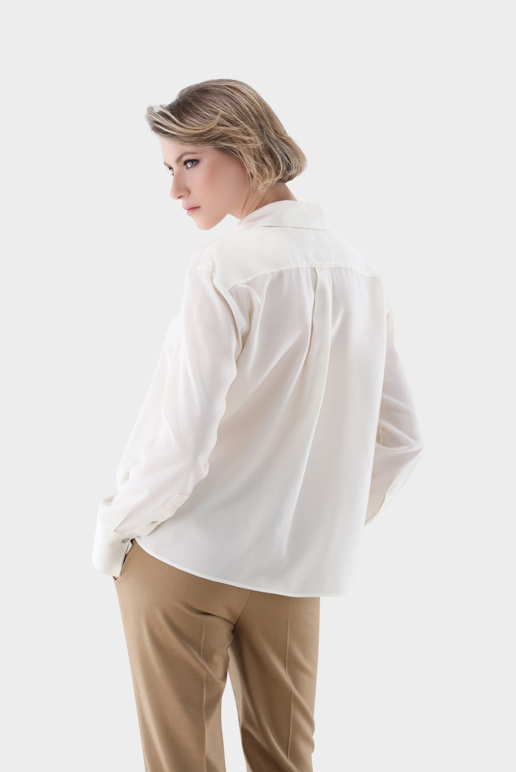 Boxy geschnittene Hemdbluse mit langen Ärmeln, Rüschen und eingelegten Falten entlang der Knopfleiste, aus einem leichten Flanell aus Lyocell und Wolle gefertigt. Die Bluse hat eine verdeckte Knopfleiste, eine Rückenpasse mit einer Falte und einen klassischen Boxy-Schnitt.