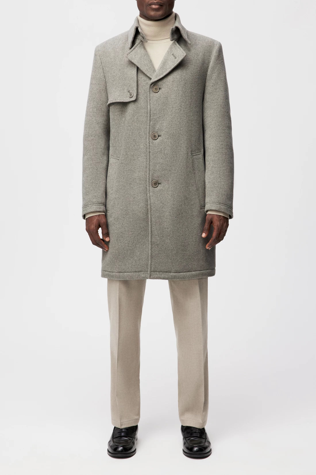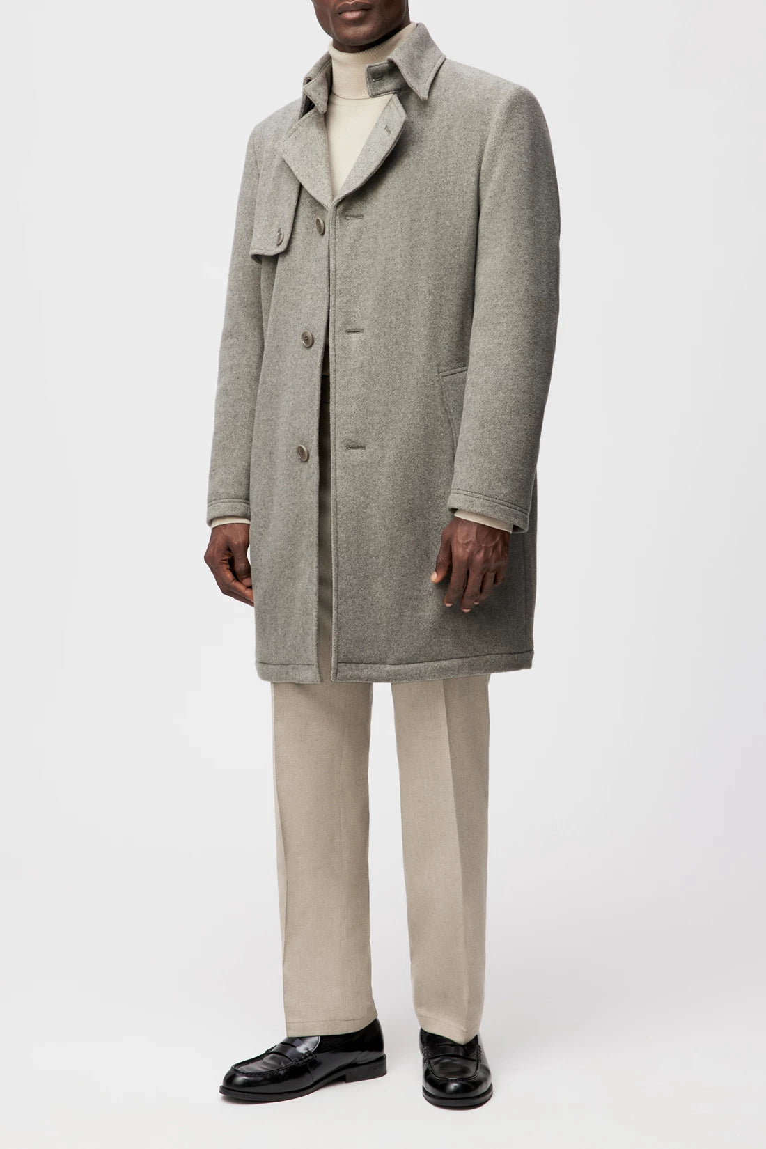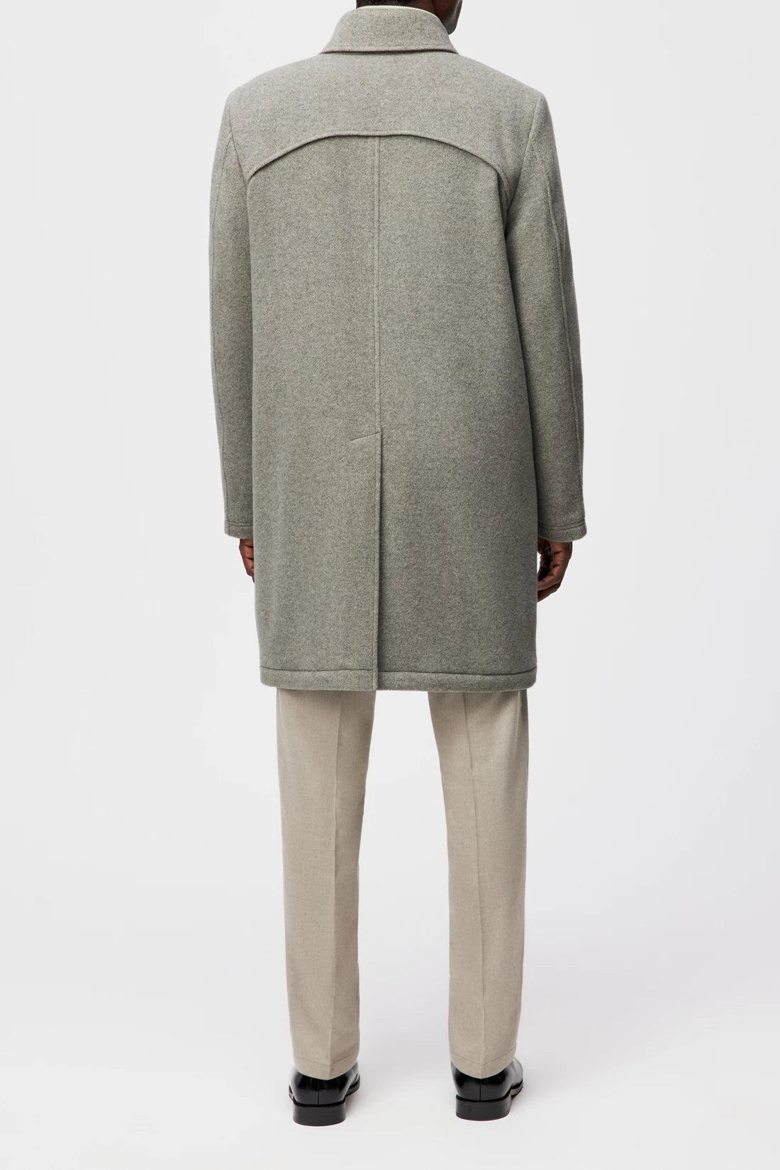 SKOPJE_C is a straight-cut short coat with a classic lapel collar. A buttoned shoulder yoke and concealed button placket emphasise the structured look. Slanted welt pockets complement the functional design. The soft wool blend with a herringbone structure combines a classic look with pleasant comfort. The slightly mottled surface gives the material depth and warmth.