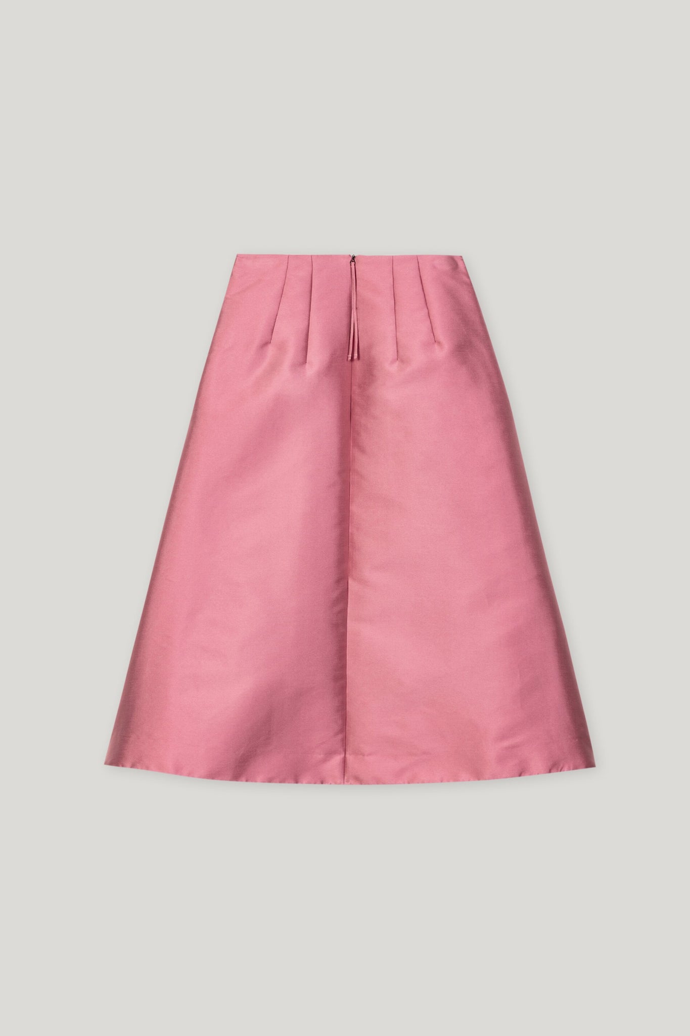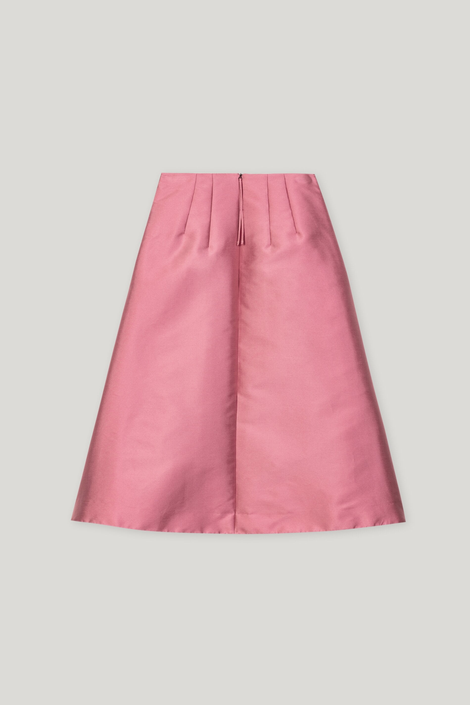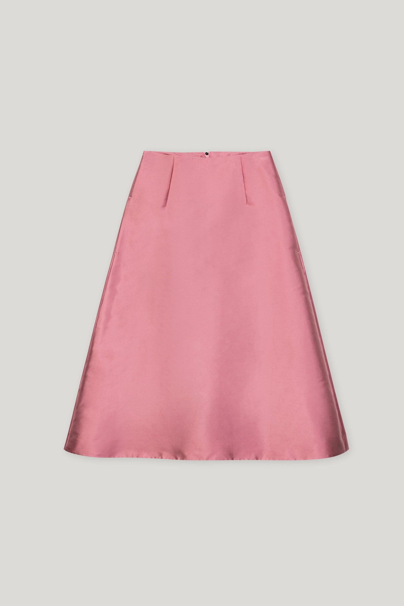 Mittellanger, ausgestellter Rock in edler Seidentwill-Qualität mit mattem Glanz. Der elegante Rock hat zwei Seitentaschen und wird auf der Rückseite mit einem Reißverschluss geschlossen.