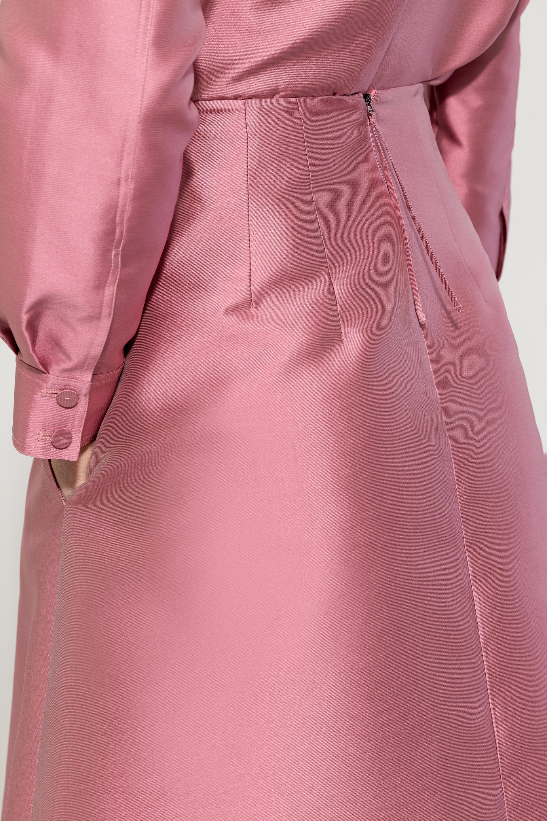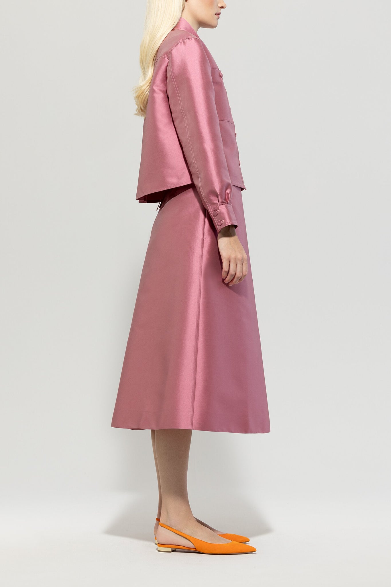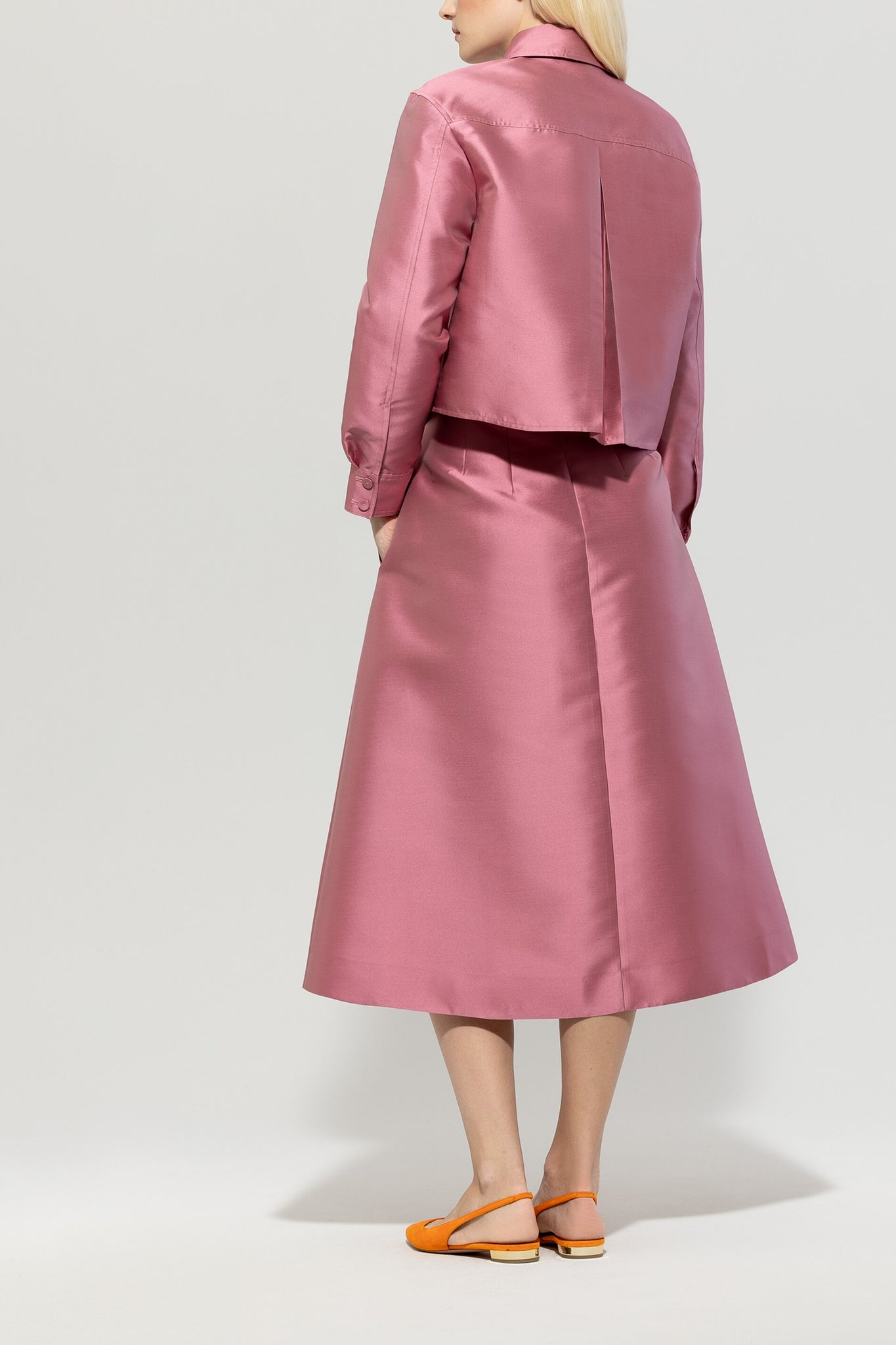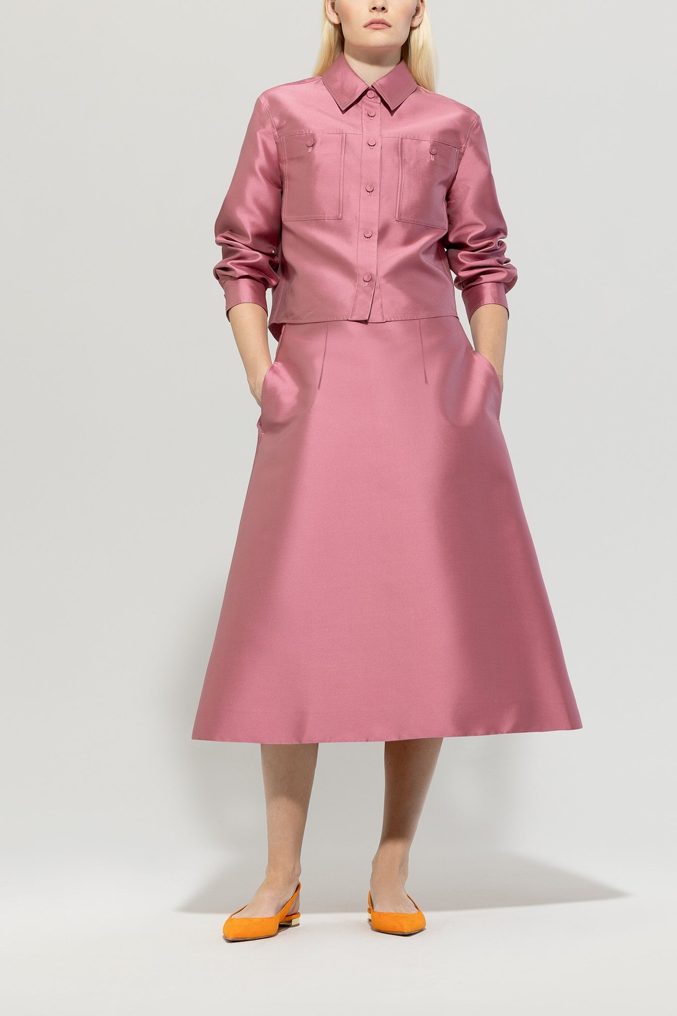 Mittellanger, ausgestellter Rock in edler Seidentwill-Qualität mit mattem Glanz. Der elegante Rock hat zwei Seitentaschen und wird auf der Rückseite mit einem Reißverschluss geschlossen.