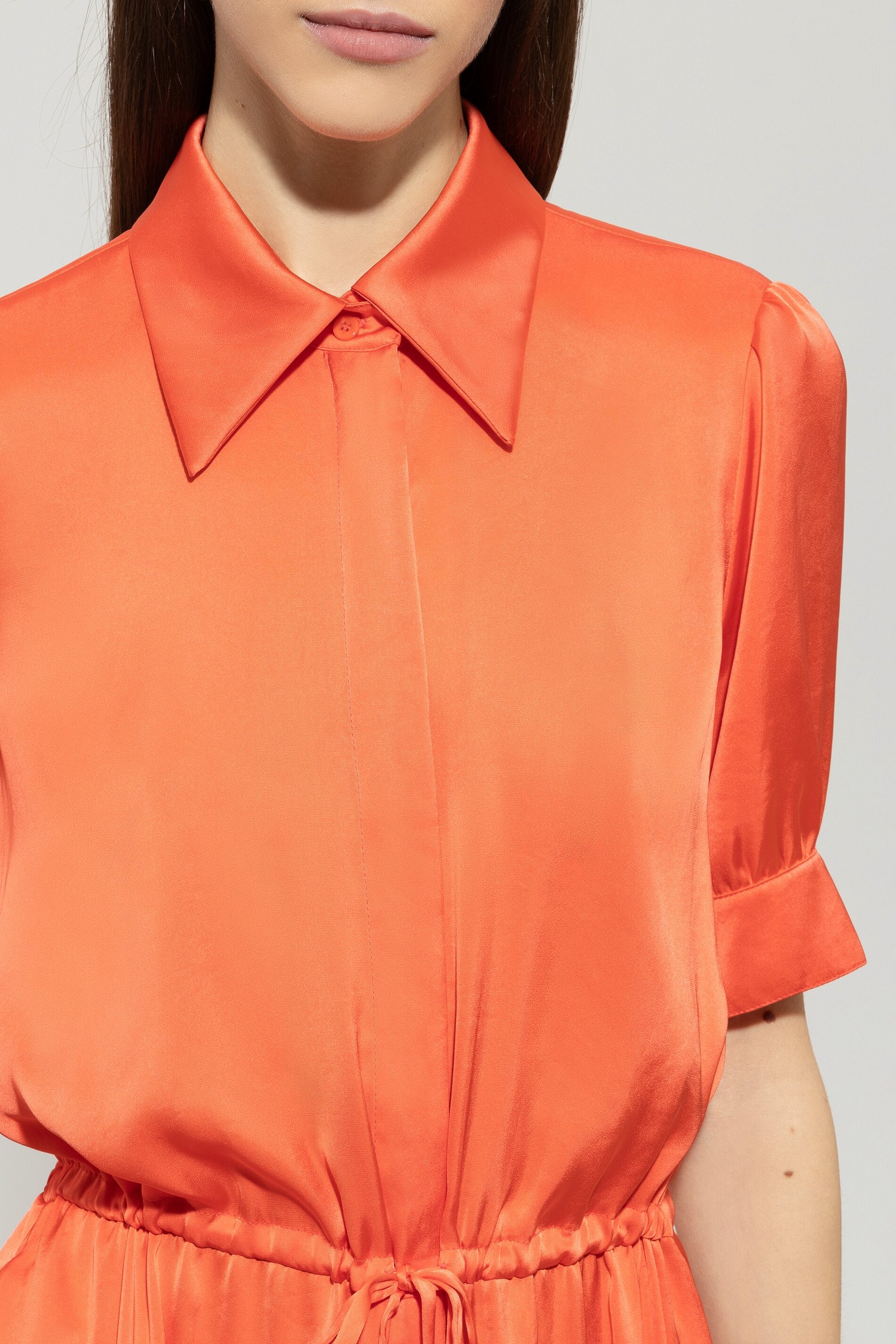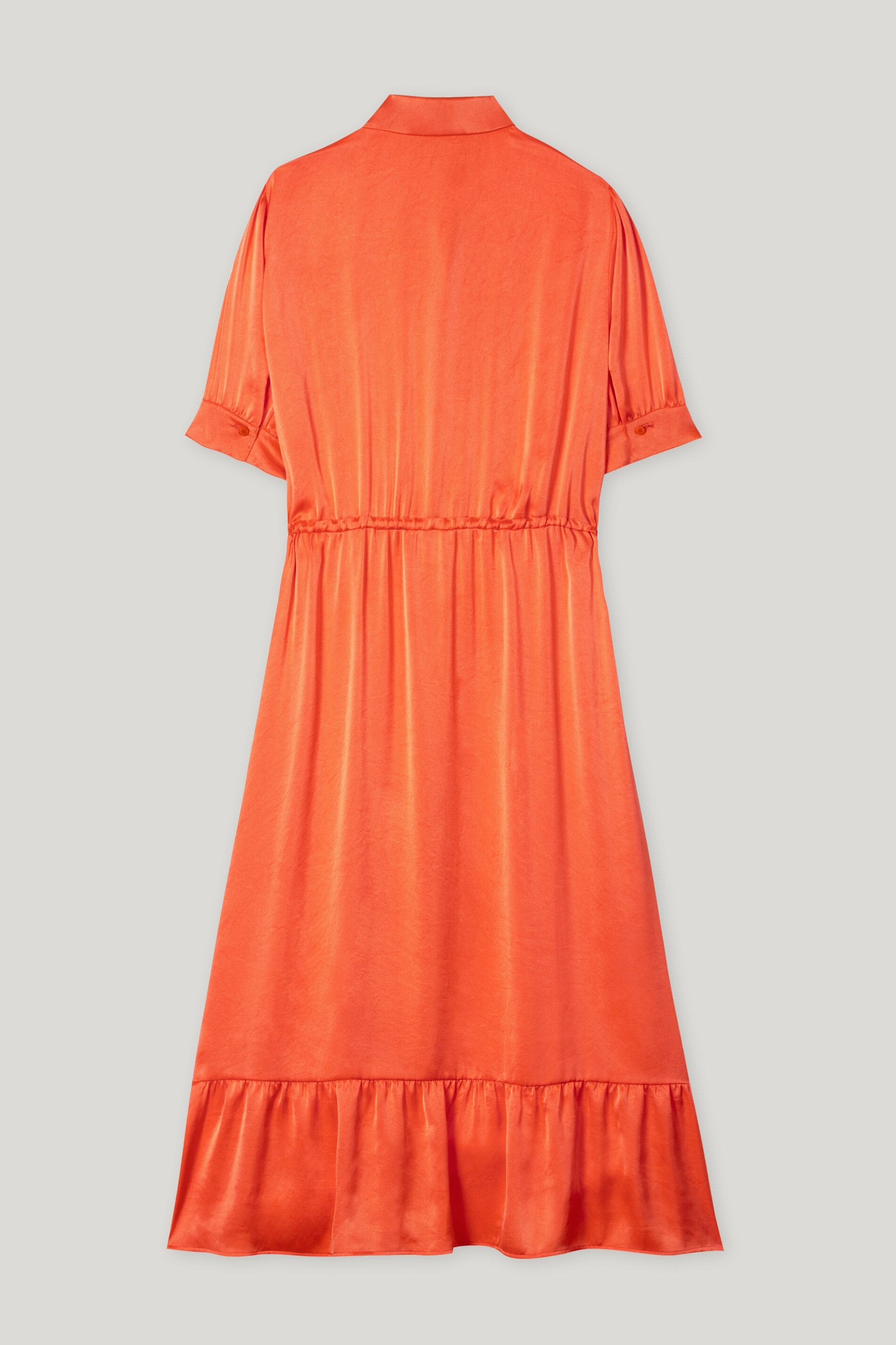 Langes Hemdblusenkleid aus schwer fallender Techno-Seide mit verdeckter Knopfleiste und rückseitigem Volantsaum. Der Kordelzug in der Taille setzt die feminine Silhouette gekonnt in Szene.