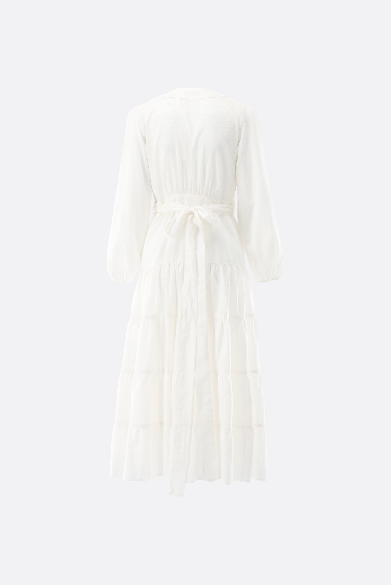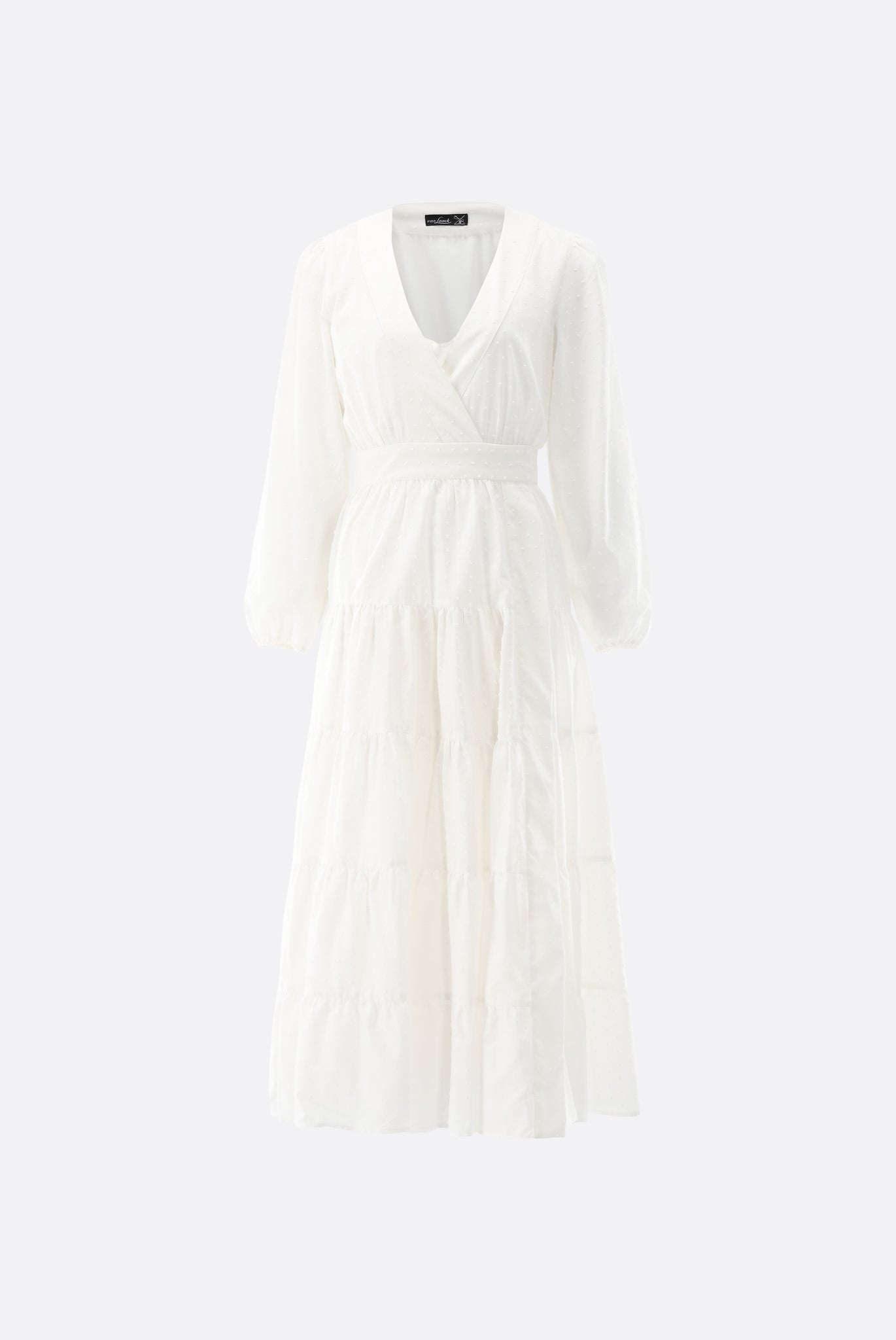 Das mittellange Sommerkleid ist aus einem besonder leichten Baumwoll-Plumetis gefertigt und ist ausgestellt geschnitten. Plumetis ist ein leichter Baumwoll Batist mit kleinen, erhabenen Punkten die an Federn oder Wolken erinnern. Das Kleid zeigt sich im Stufen-Look mit 5 Volants und ist somit besonder aufwändig in der Verarbeitung. Der V-Ausschnitt, die Ballonärmel und ein Wickelband runden den eleganten Look ab. Ein auffallend schönes Sommerkleid – lässig elegant und mit dem luftig leichten Tragekomfort.