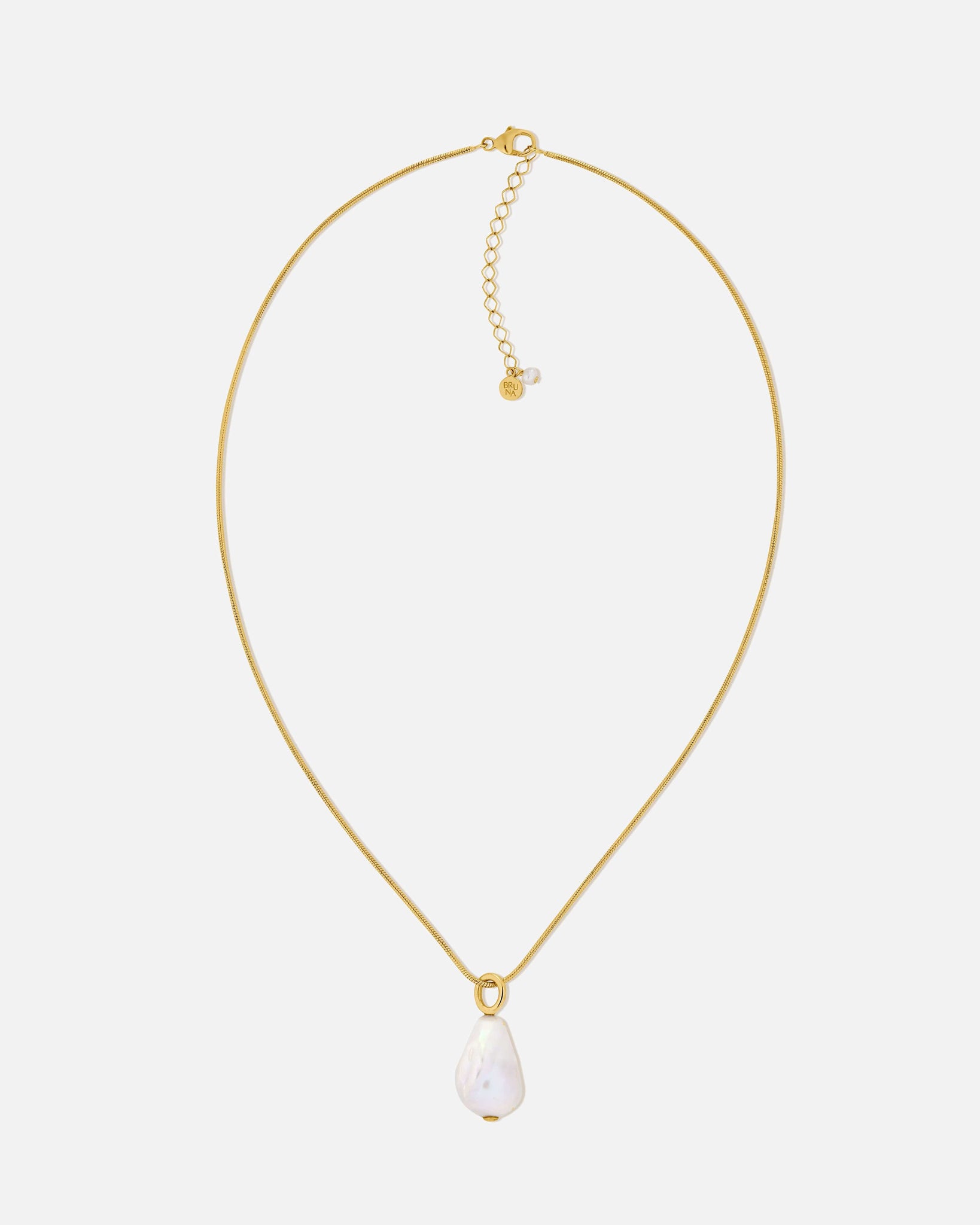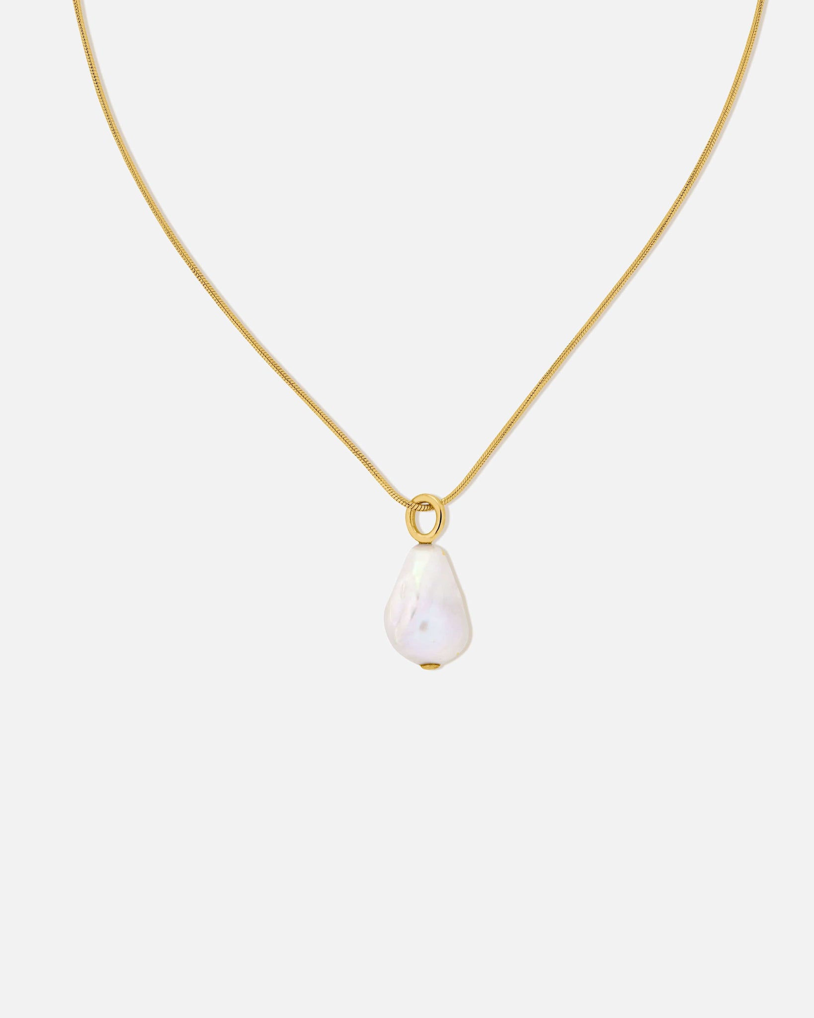 Unsere Rocher Halskette ist eine auffällige Interpretation der klassischen Schlangenkette. Sie wird durch einen Anhänger mit einer großen Barockperle vollendet und verleiht deinen Looks eine dramatische Note.