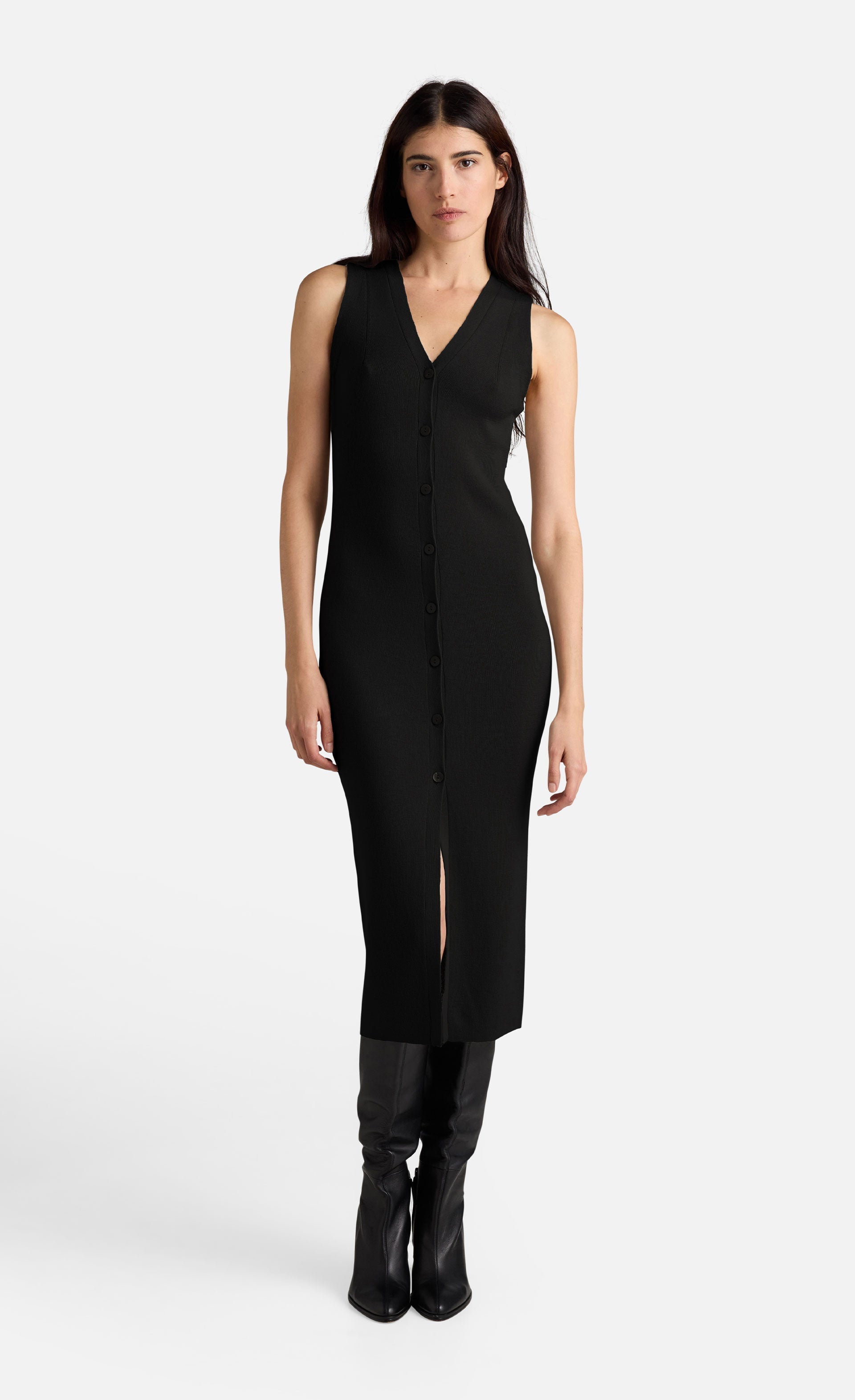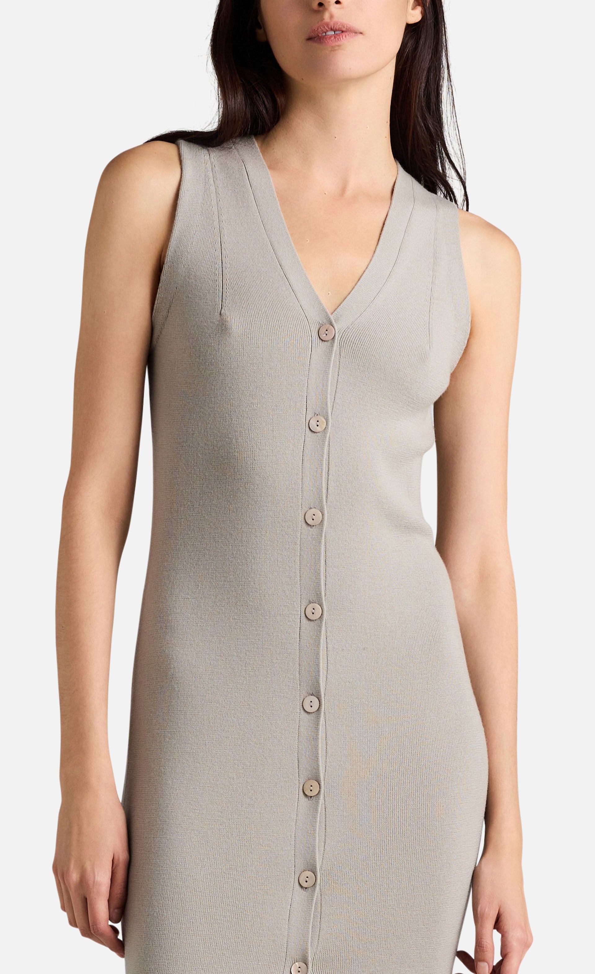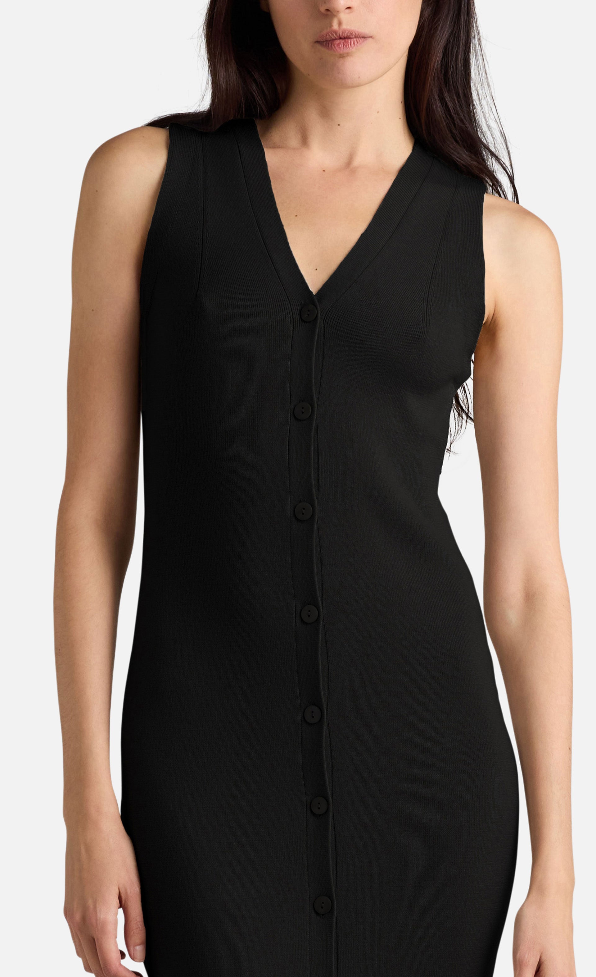 Sie präsentiert sich in figurbetonter Silhouette mit geknöpfter Vorderseite und V-Ausschnitt und kann auch als Kleid getragen werden, wodurch sich viele Stylingmöglichkeiten ergeben.
