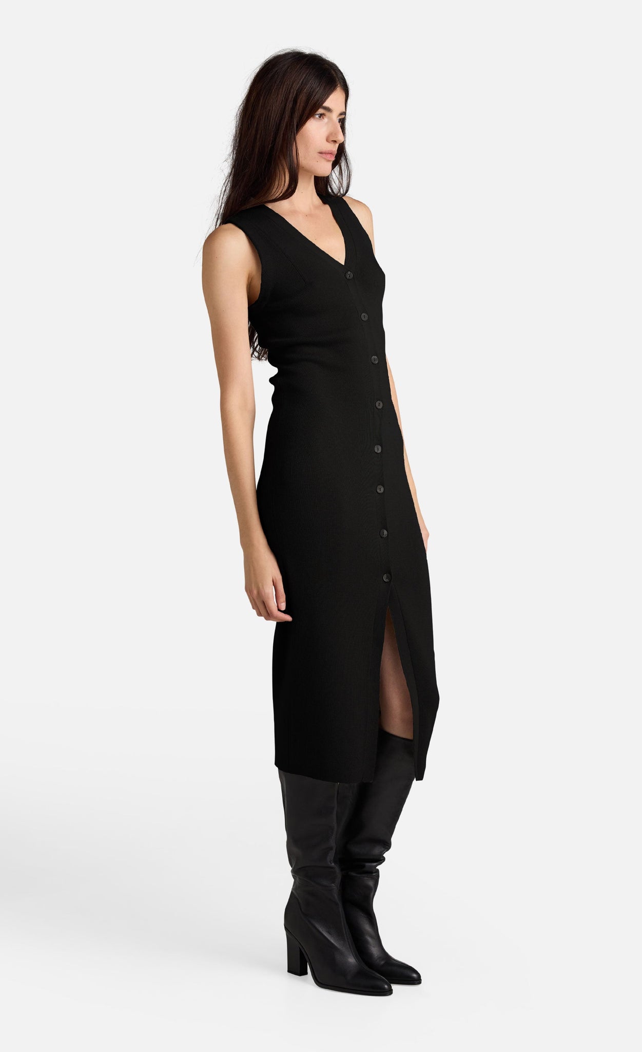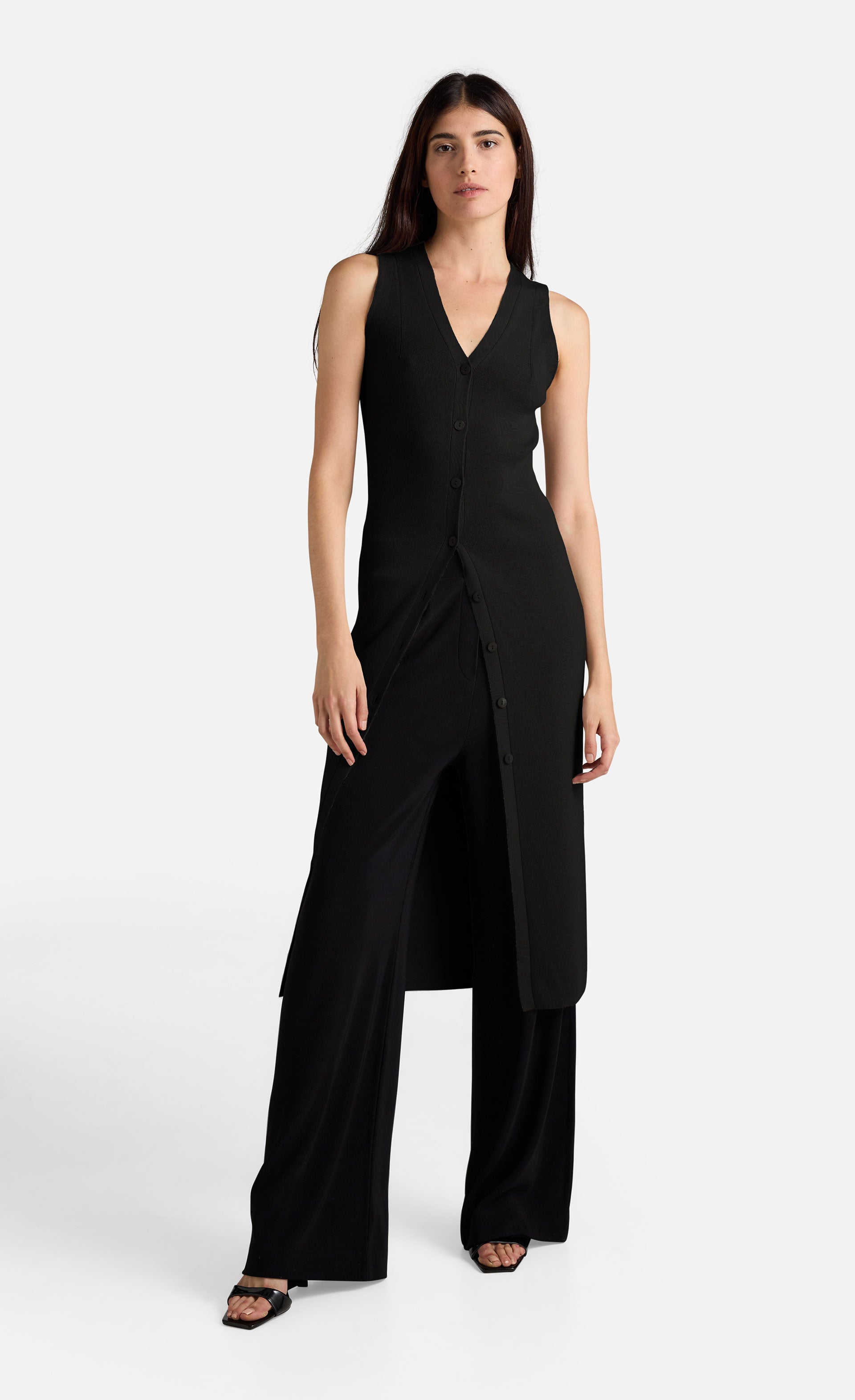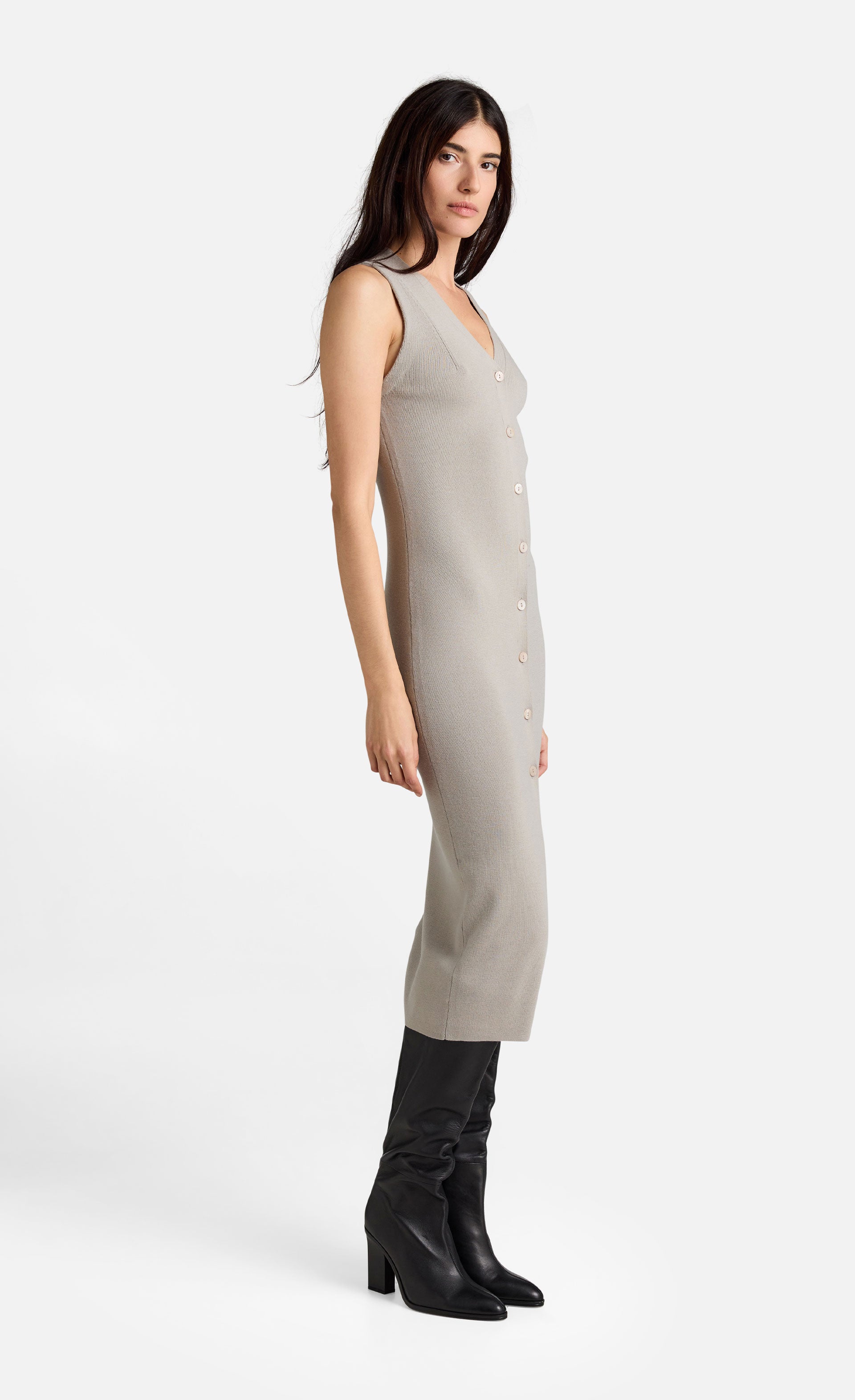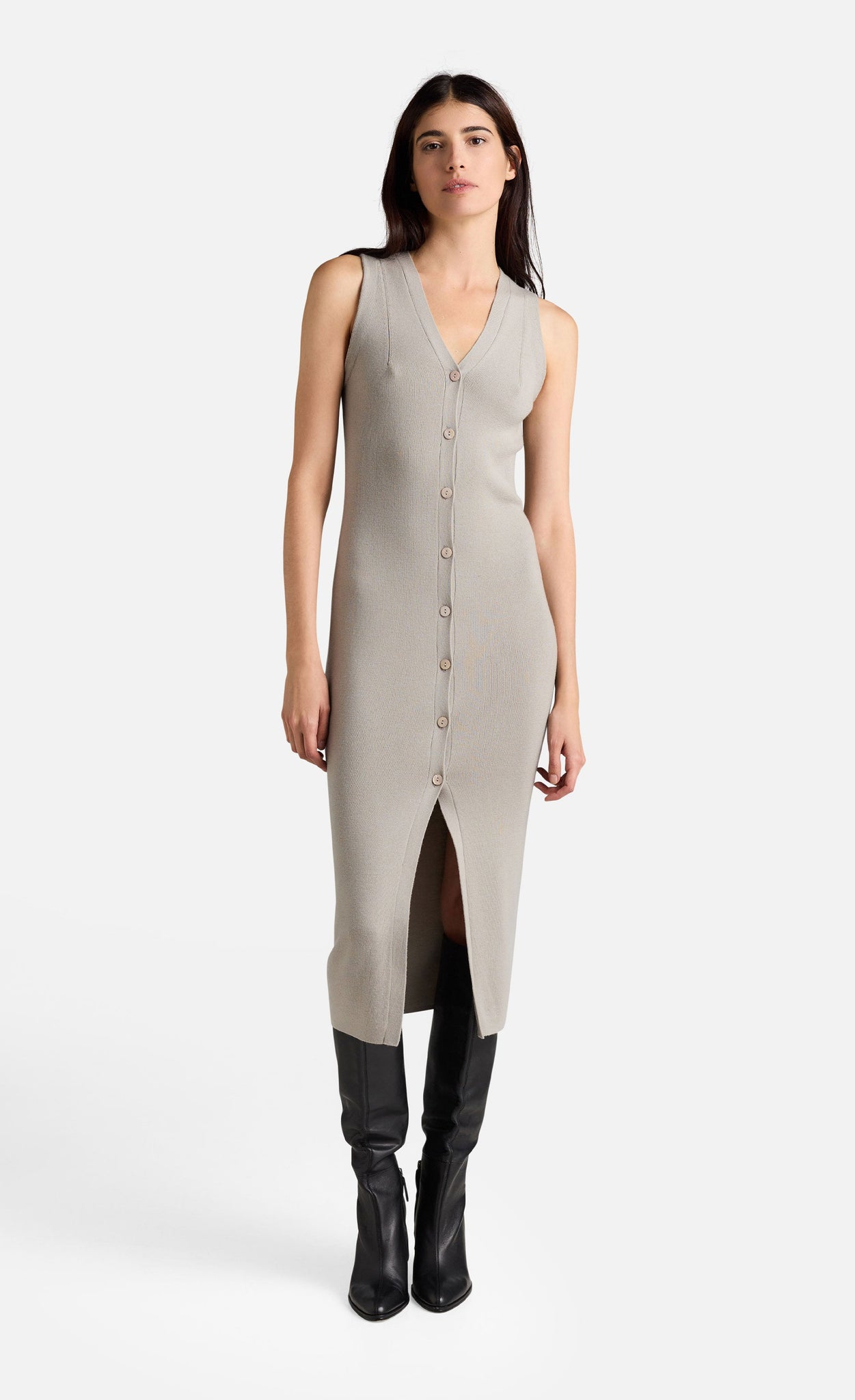 Sie präsentiert sich in figurbetonter Silhouette mit geknöpfter Vorderseite und V-Ausschnitt und kann auch als Kleid getragen werden, wodurch sich viele Stylingmöglichkeiten ergeben.
