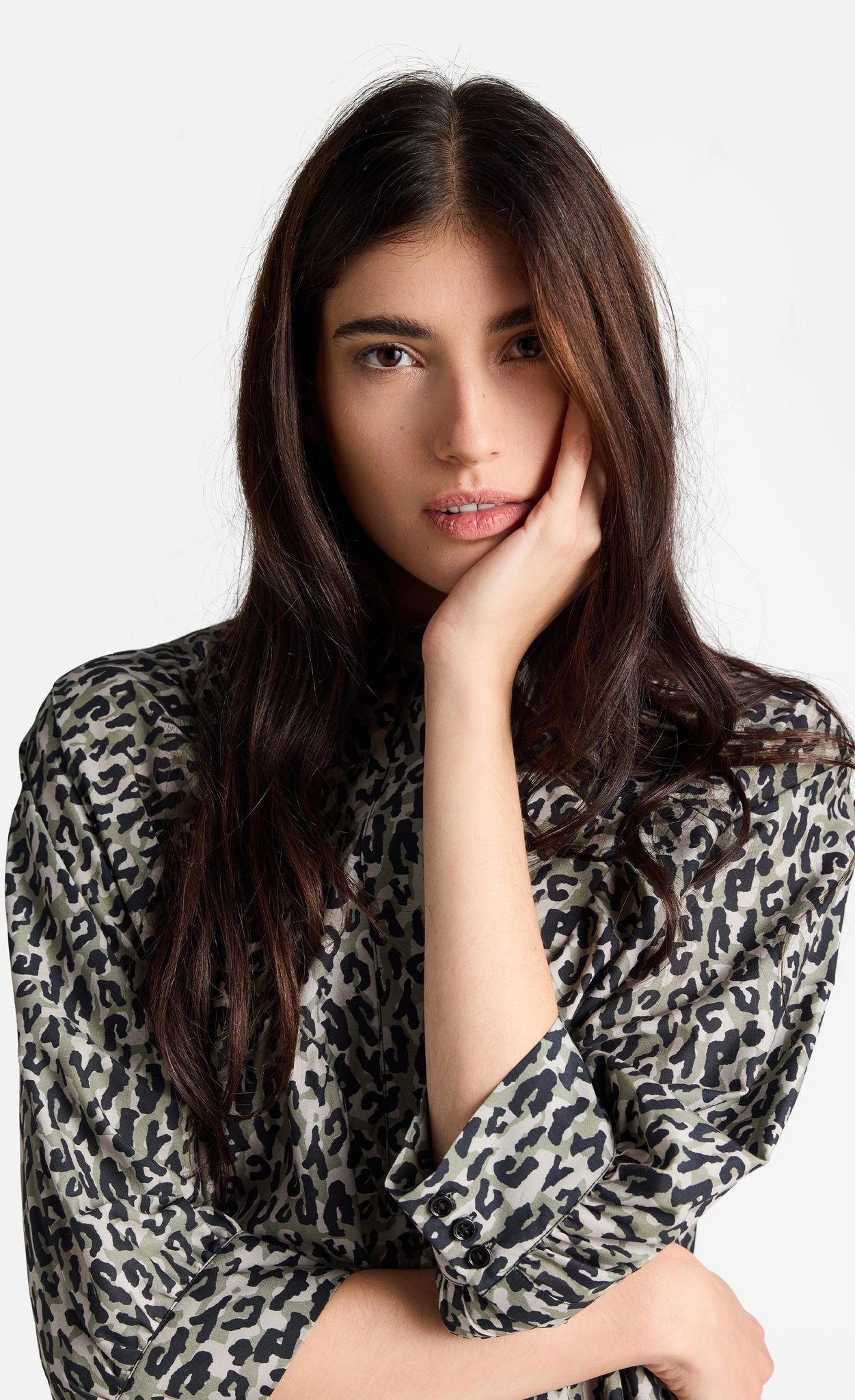 Dieses Kleid wurde aus hochwertigem Baumoll-Seidenmaterial hergestellt und mit einem modernen Leoprint versehen.