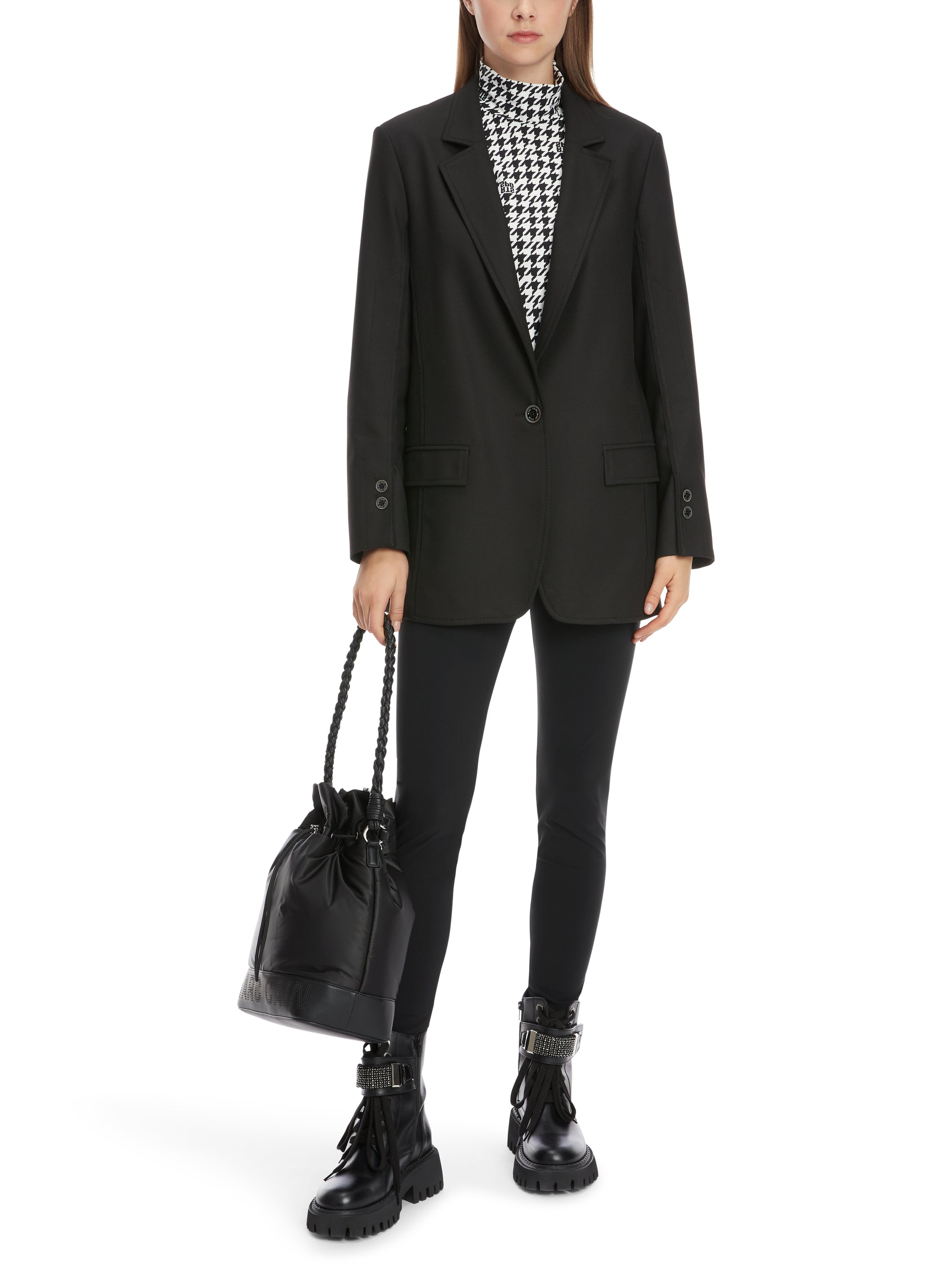Als modernes Update eines Alltime-Klassikers präsentiert sich dieser Blazer mit seinen extravaganten Details. So besitzt er Knöpfe auf dem Vorderarm und die formenden Teilungsnähte sind mit Ziersteppungen betont. Der Einreiher kommt mit Revers und Klappentaschen. Die softe Materialmischung mit Wolle hält warm, der Elasthananteil sorgt für Tragekomfort.