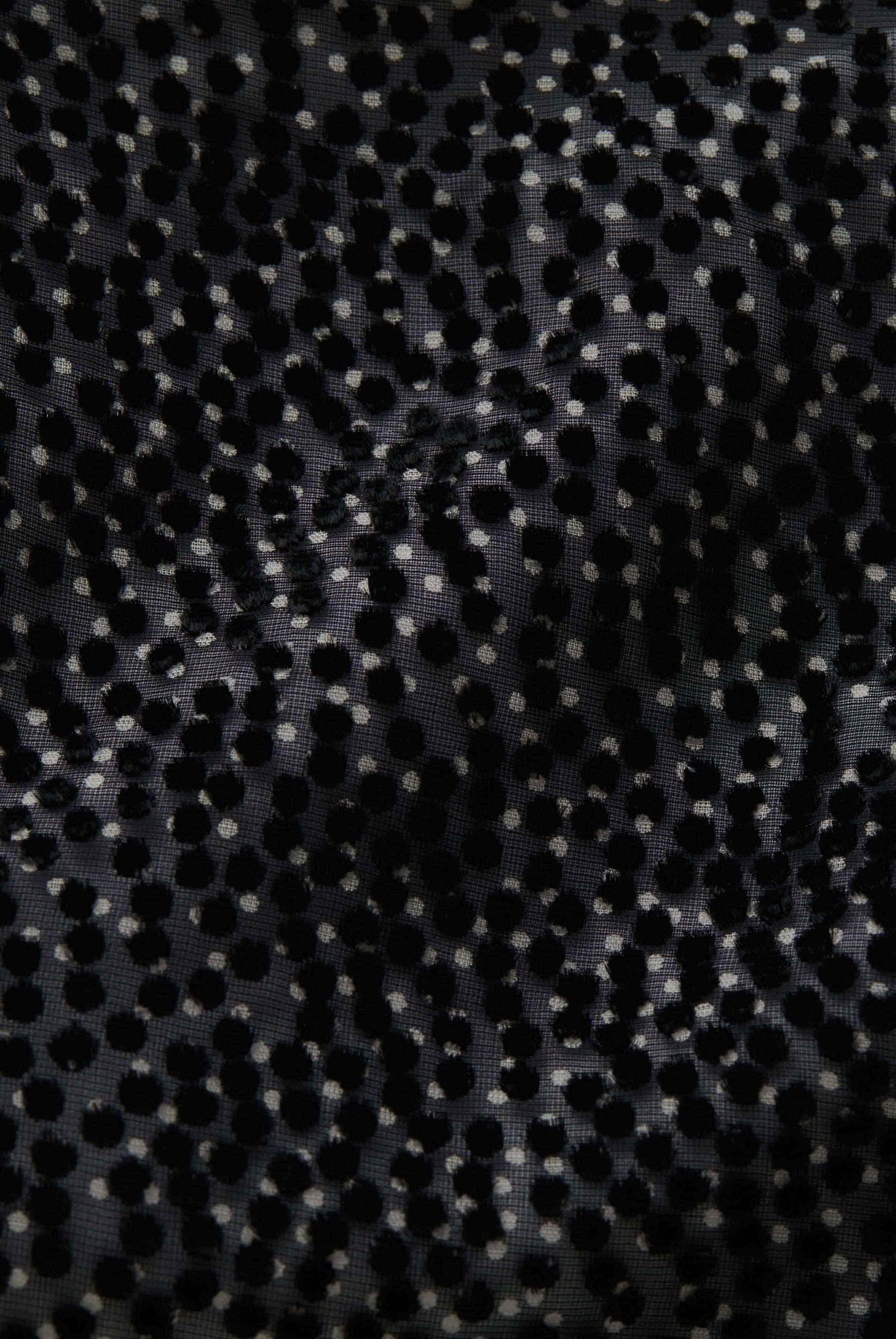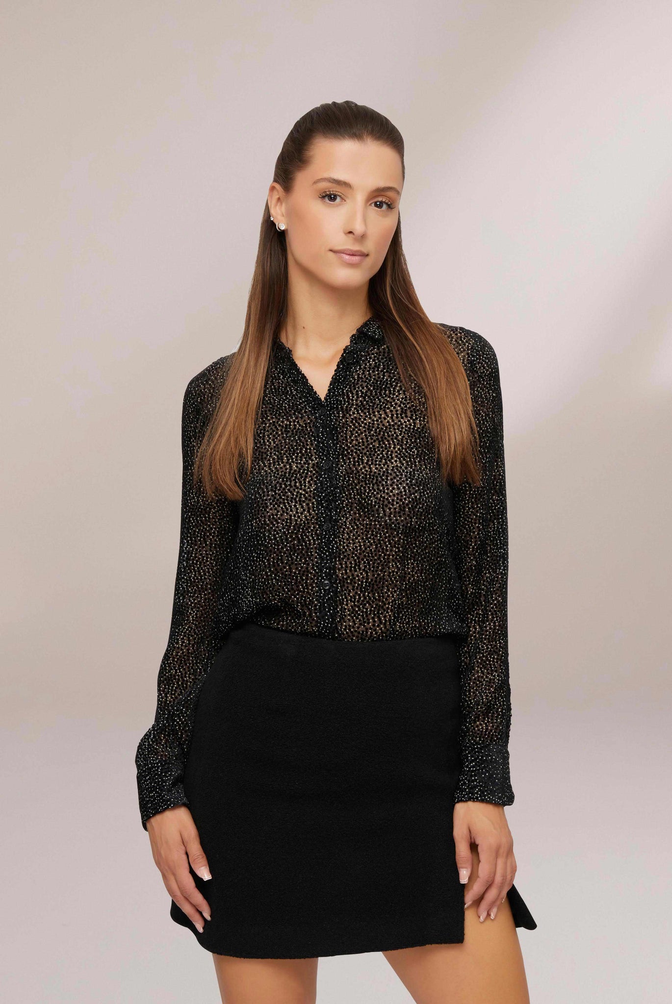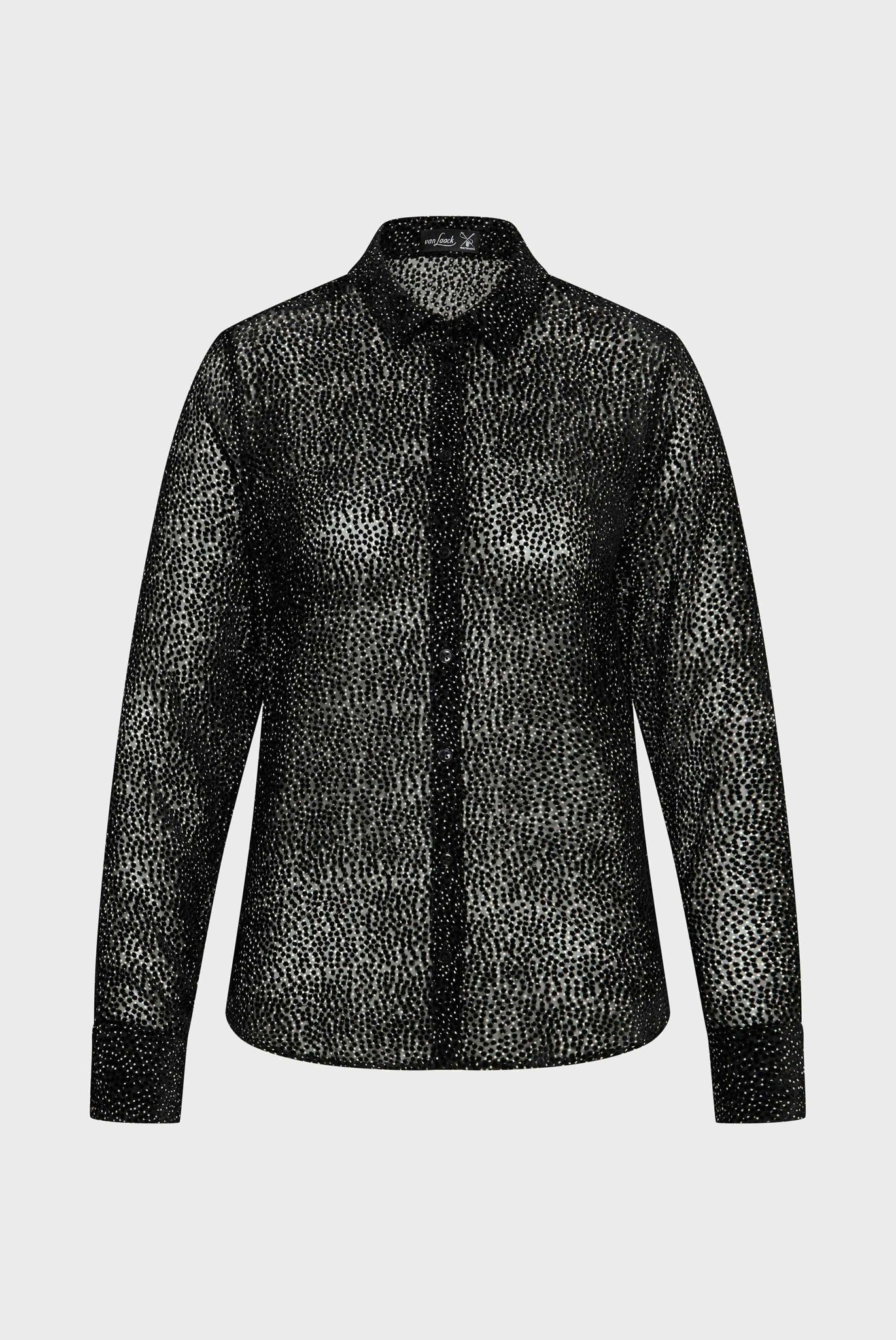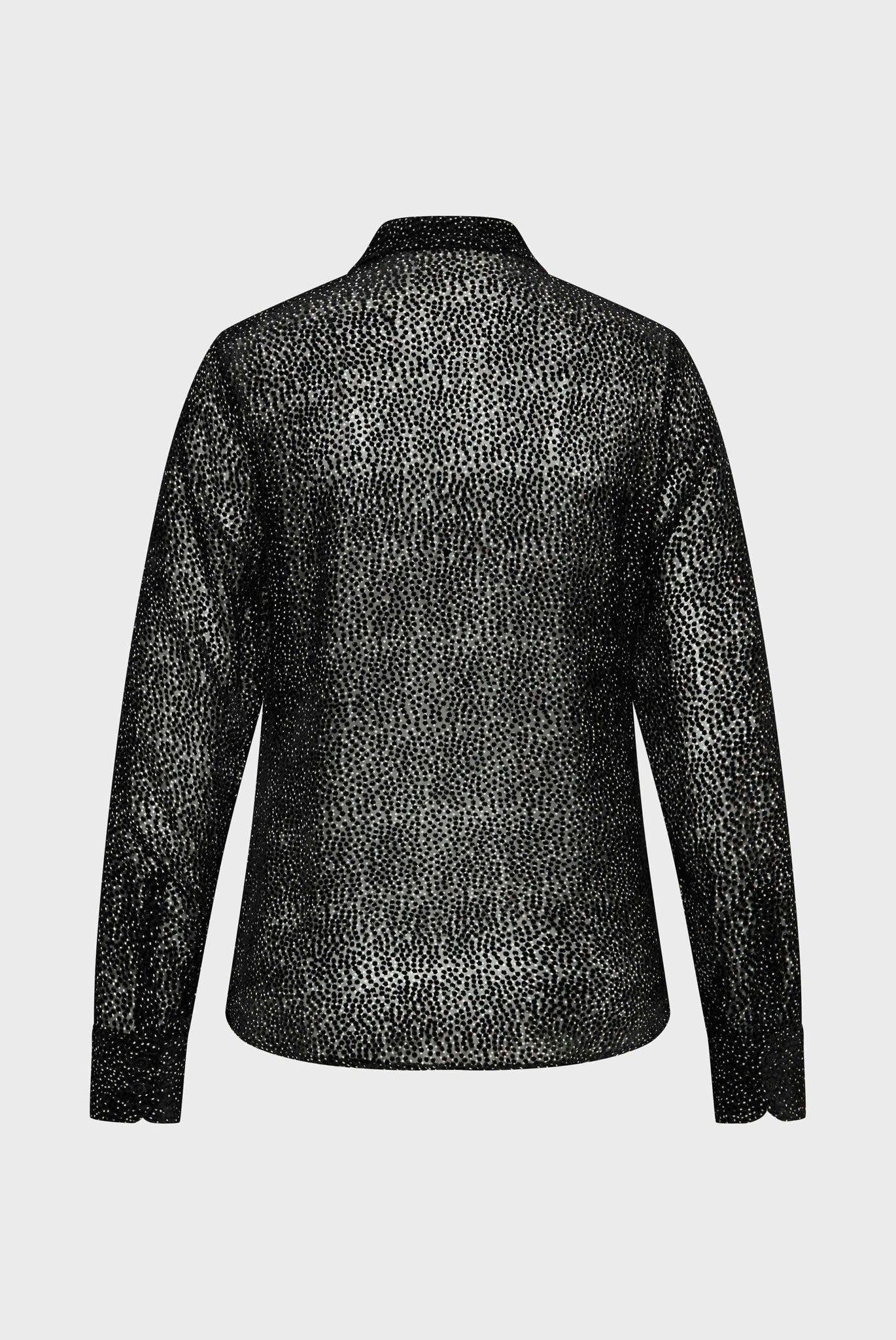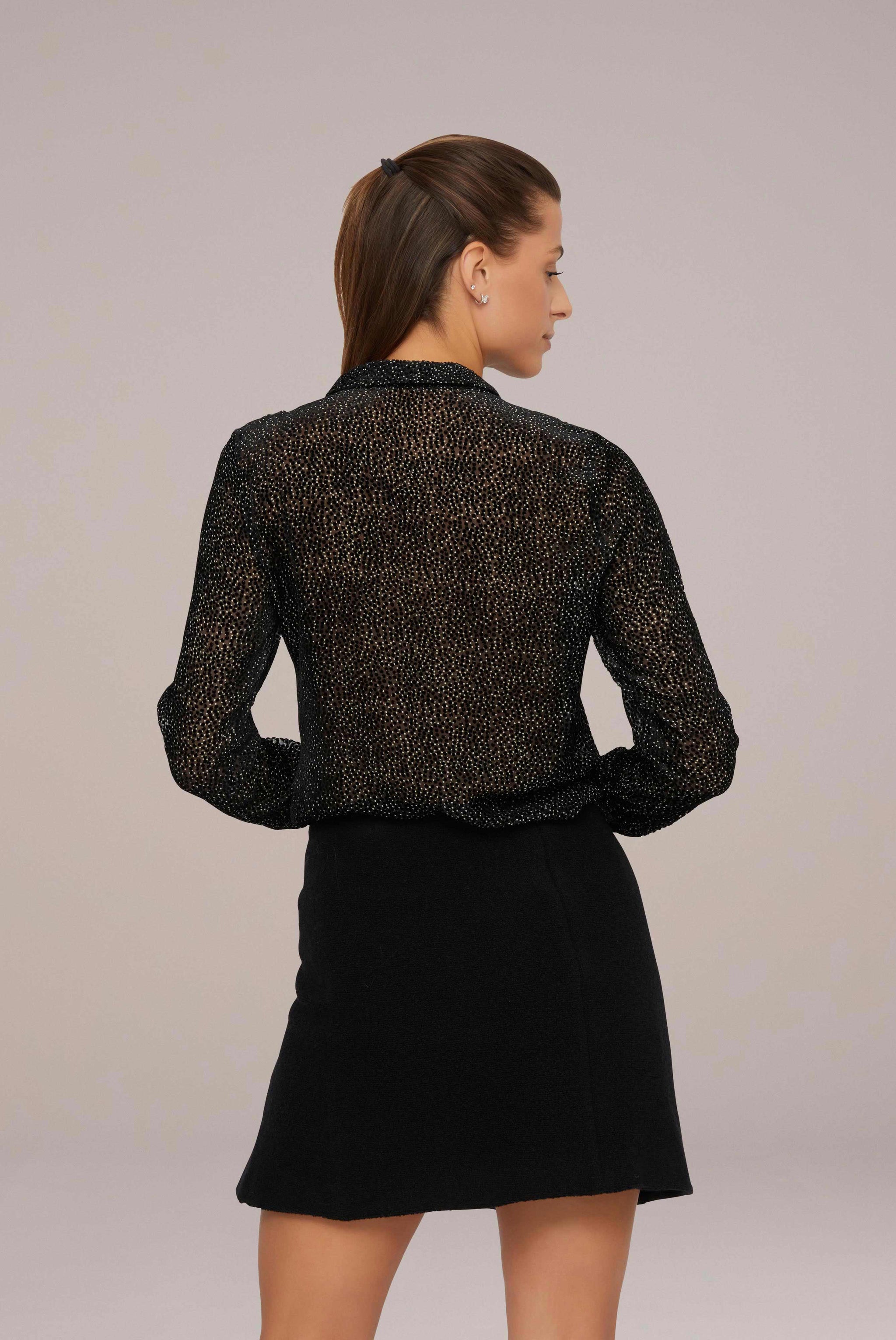 Edle Devoré Hemdbluse, bedruckt mit schwarz/-weißem Mikro-Tupfen. Leicht durchsichtige Optik aus Seide-Viskose Mix