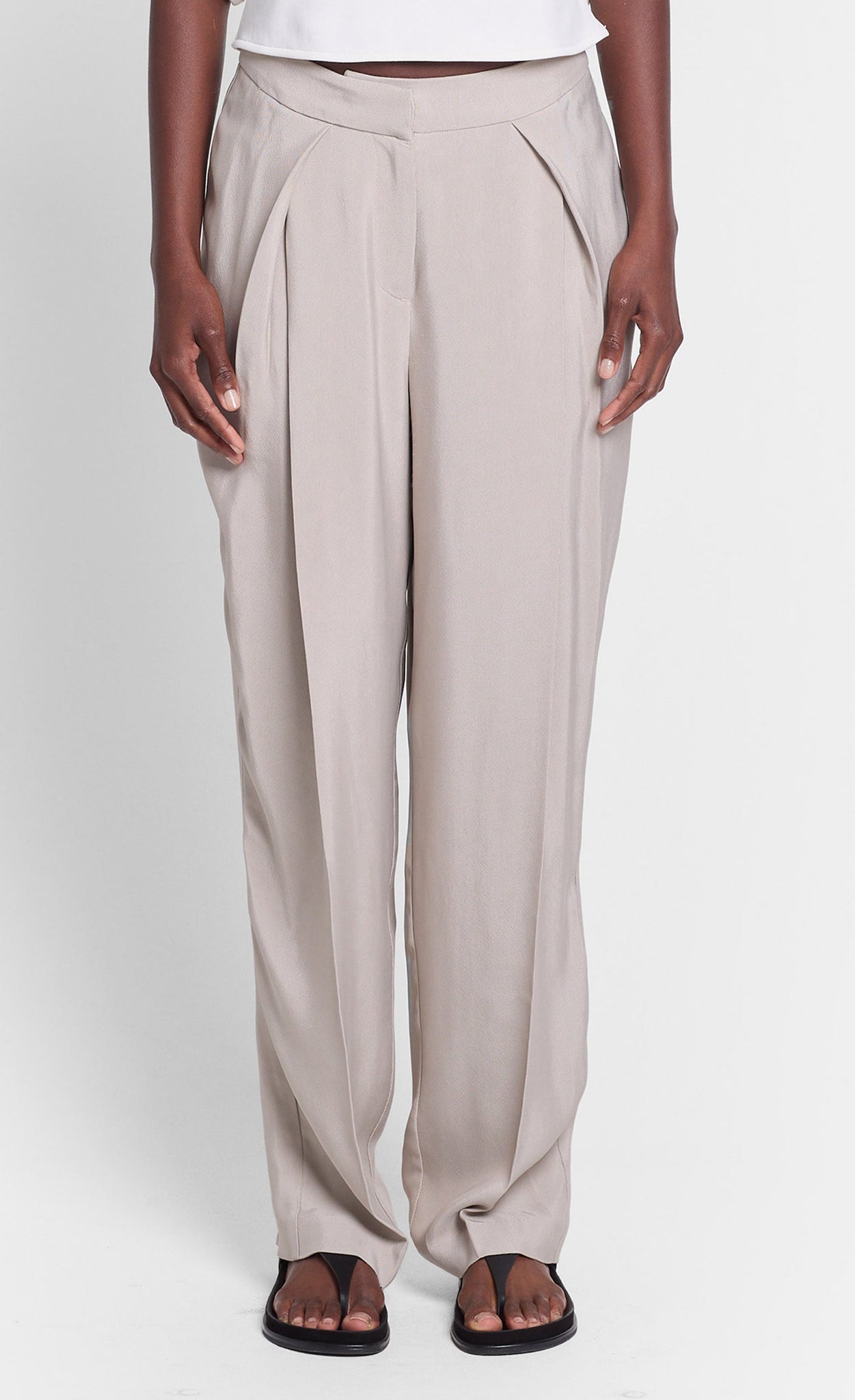 Diese Hose ist in mehrfacher Hinsicht etwas Besonderes. Zum einen besticht sie durch ein glänzendes, satt fallendes Viskosematerial. Zum anderen unterscheidet sich die Hose durch die vordere Faltenlösung von anderen Hosen. Hier werden pro Seite zwei Falten übereinander gelegt, wodurch nicht nur ein lässiges Volumen, sondern auch eine neue Faltentechnik entsteht.