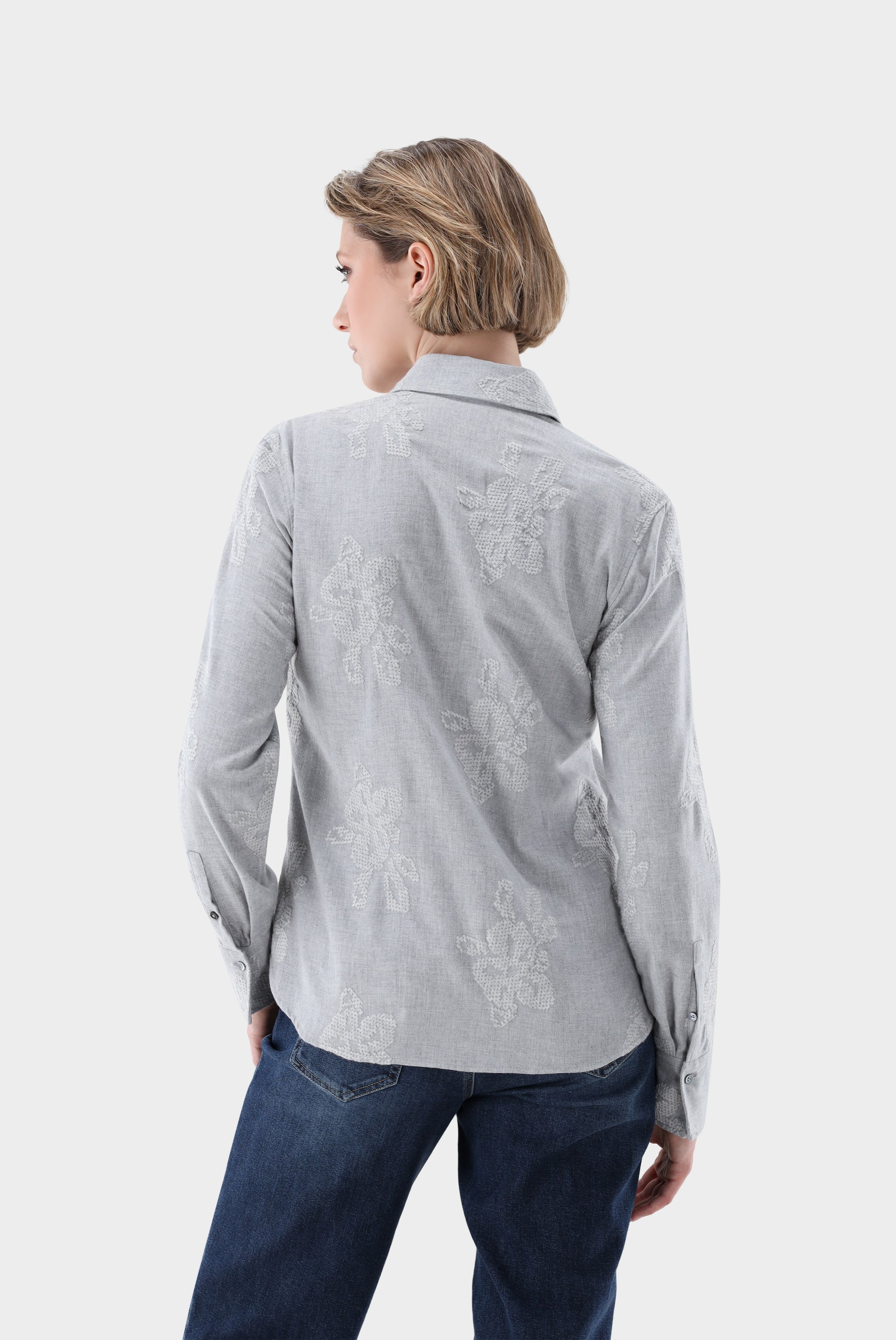 Figurbetonte Bluse mit langen Ärmeln aus gebürstetem Baumwoll-Flanell, verziert mit floralen Kreuzstichstickereien aus Wolle. Die elegante Hemdbluse bietet einen raffinierten Schnitt, lange Ärmel mit Manschetten und einen leicht geschwungenen Saumverlauf. Ideal für lässige oder geschäftliche Anlässe.
