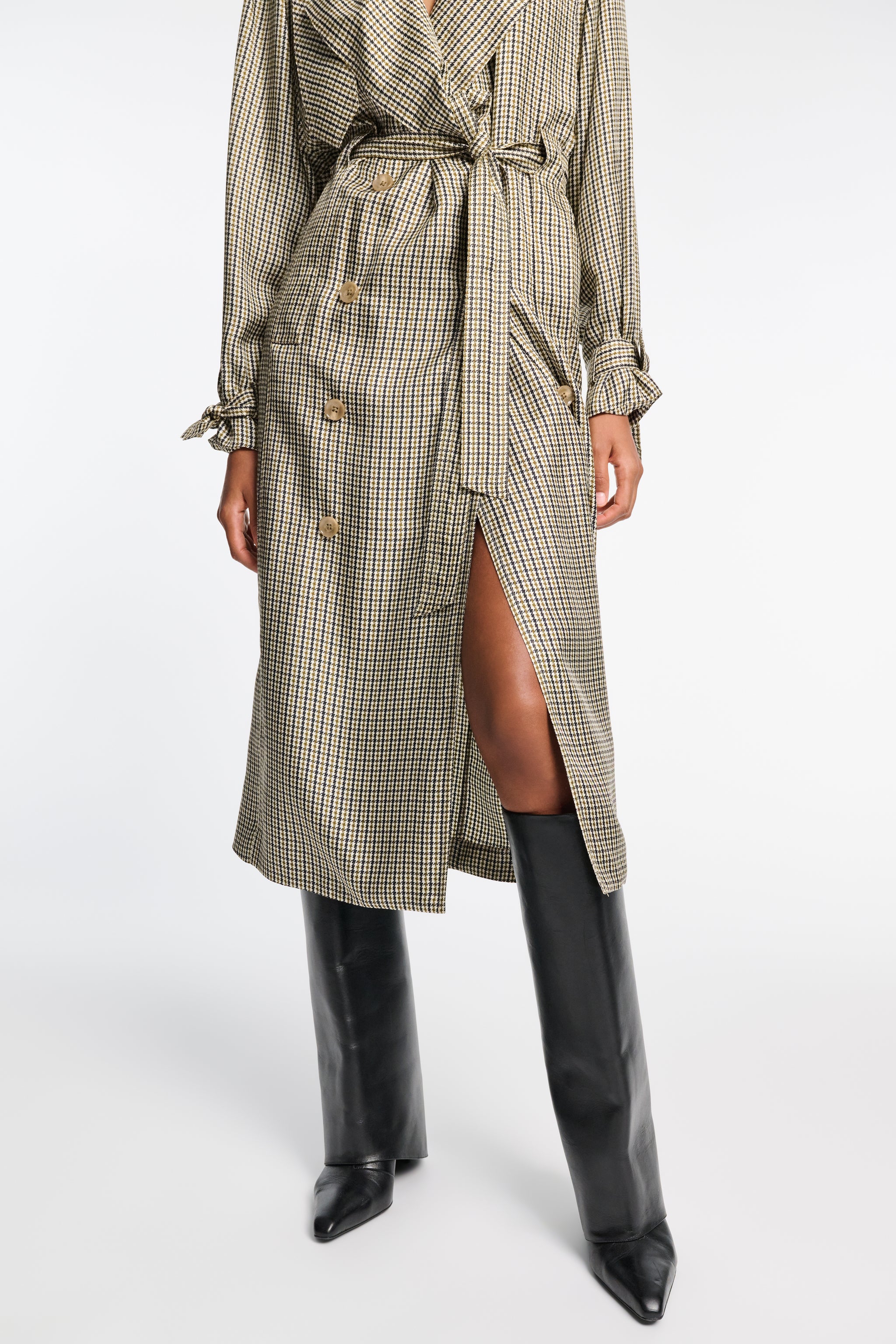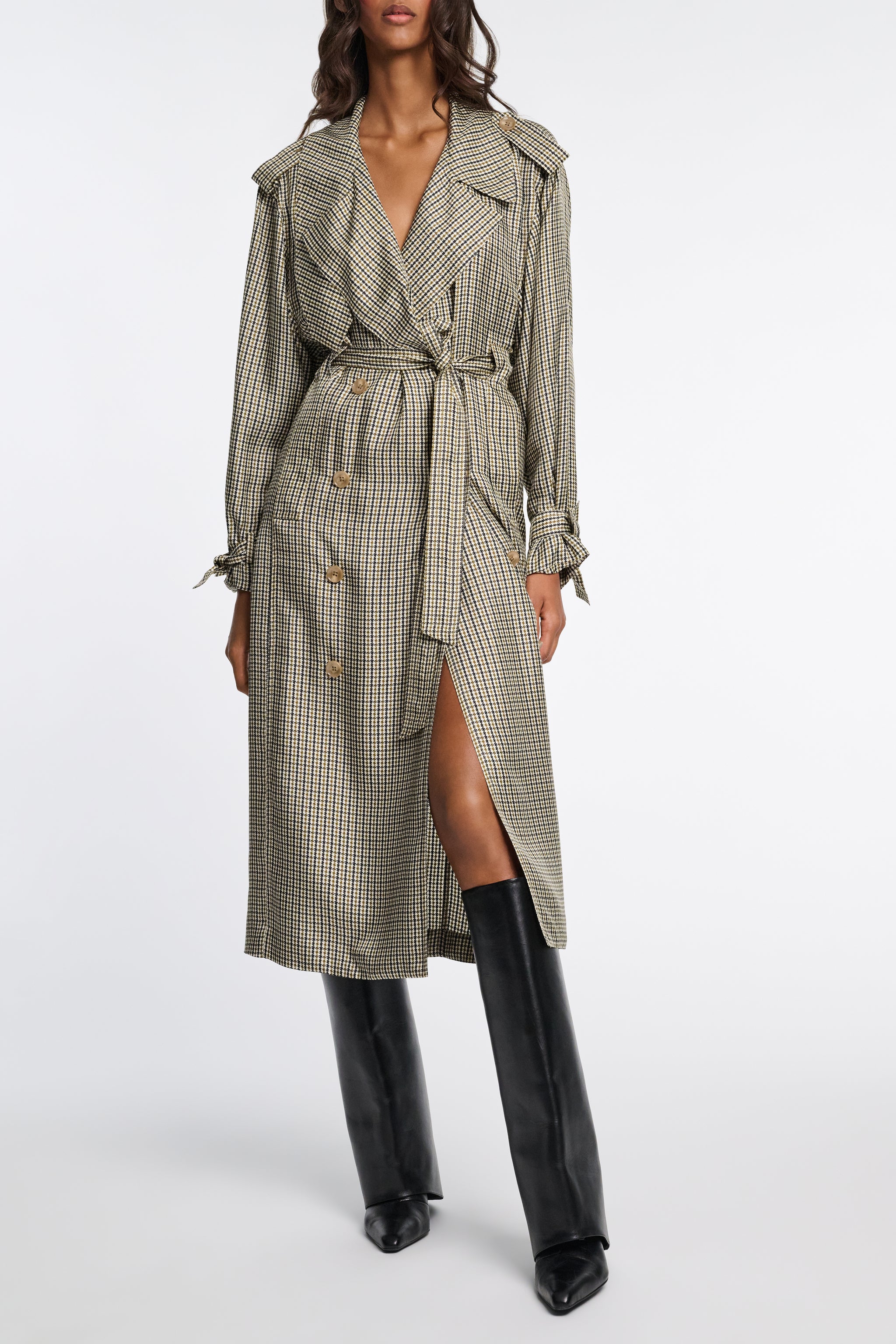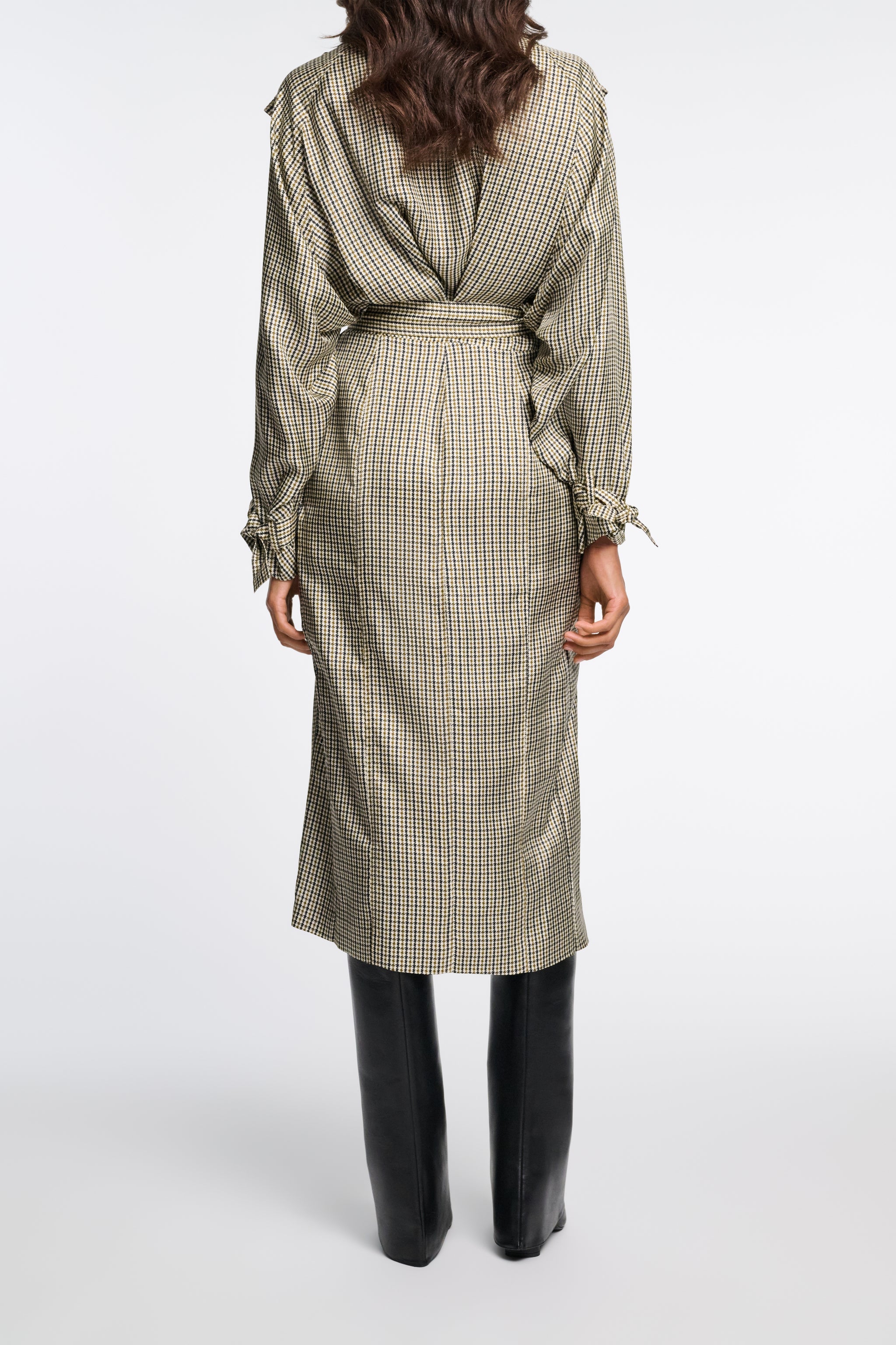 Dresscode: Dress Coat. Das Kleid ist aus fließendem Seidentwill gefertigt und hat eine klassische Trenchcoat-Silhouette. Allover Karo trifft auf einen Bindegürtel, Schulterklappen und Binde-Details am Ärmel.