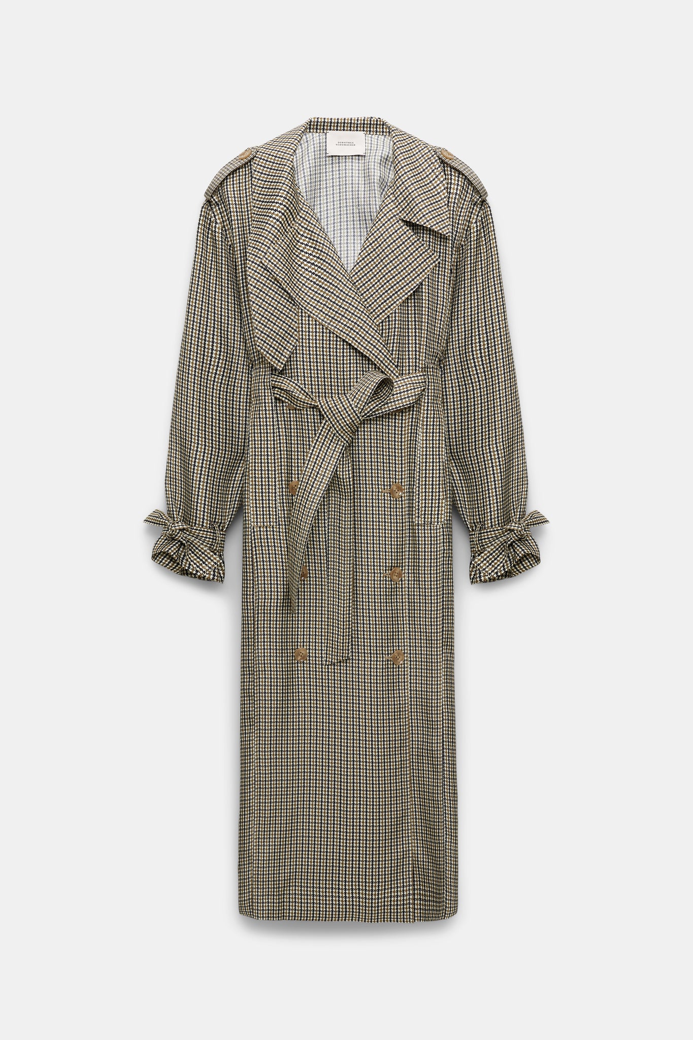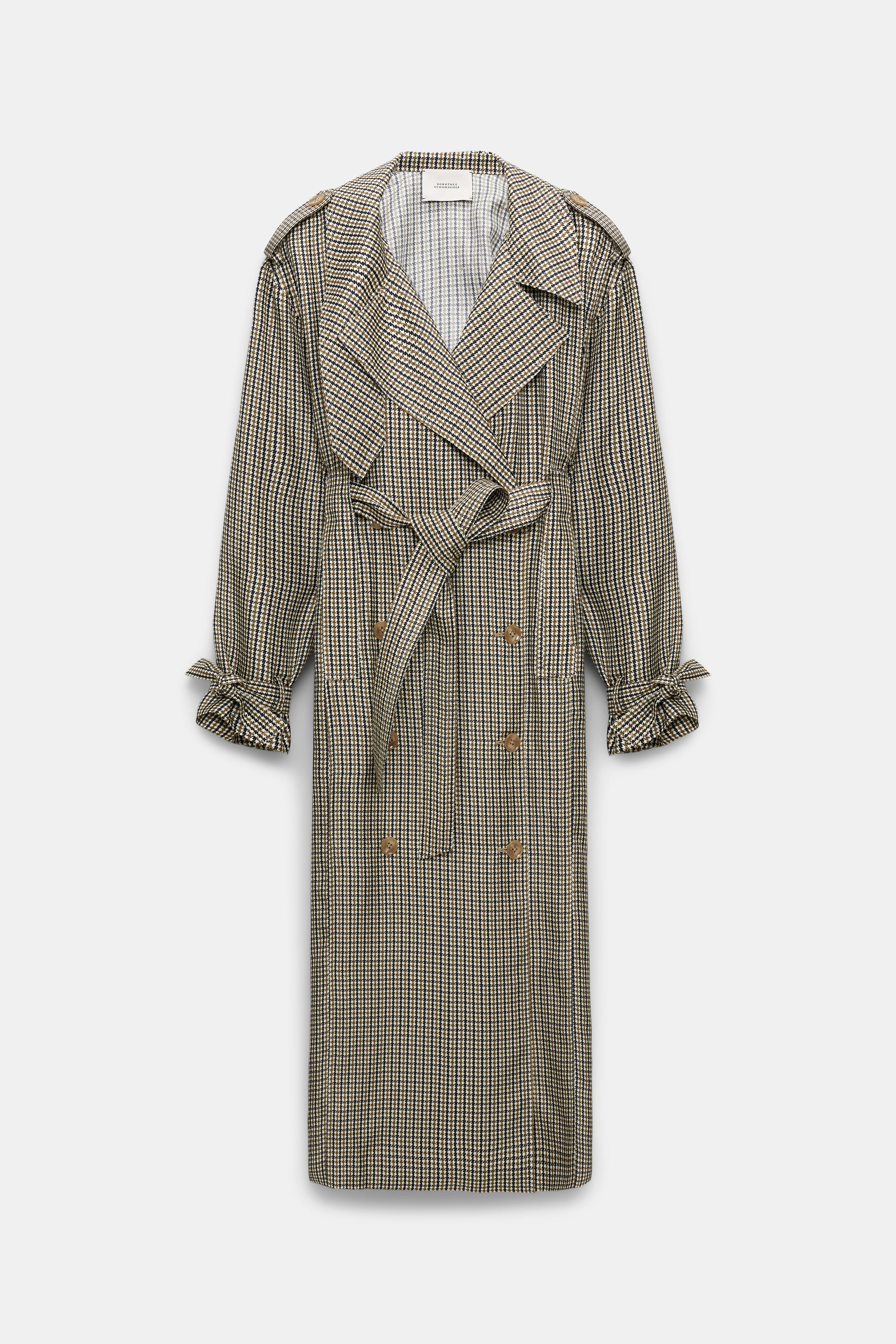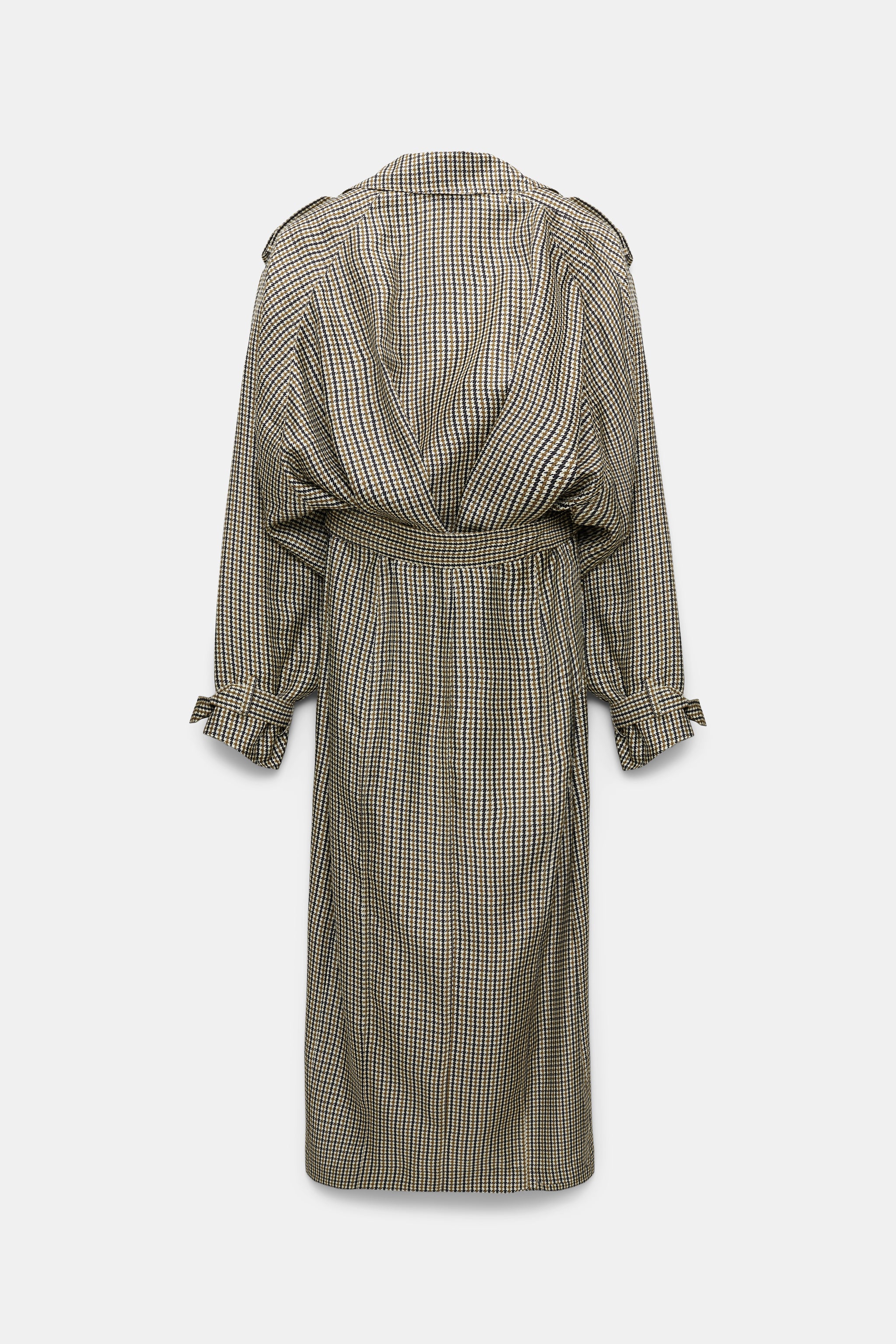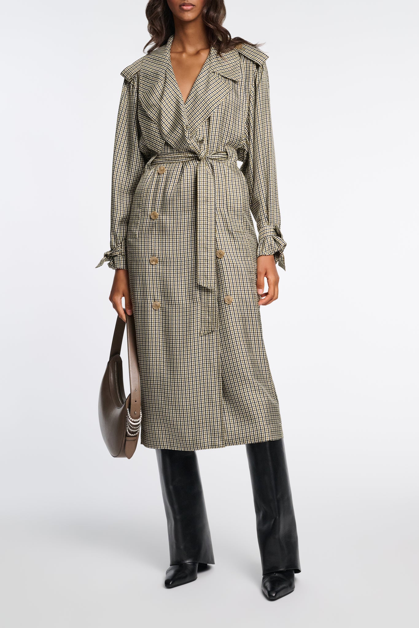 Dresscode: Dress Coat. Das Kleid ist aus fließendem Seidentwill gefertigt und hat eine klassische Trenchcoat-Silhouette. Allover Karo trifft auf einen Bindegürtel, Schulterklappen und Binde-Details am Ärmel.