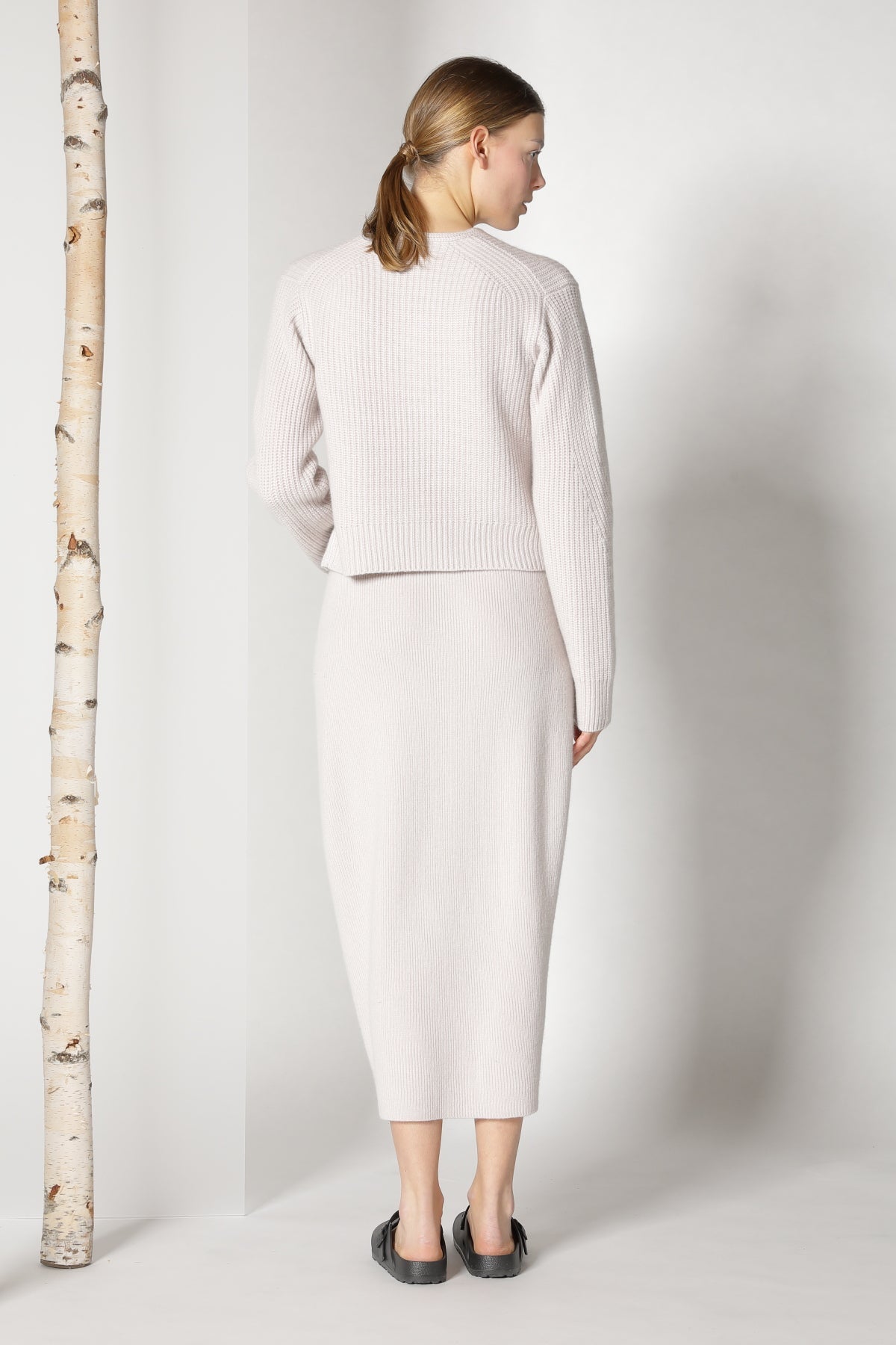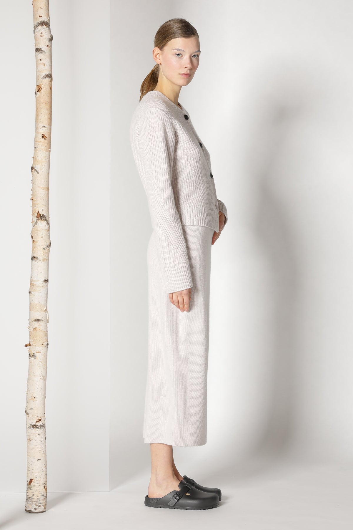 2-ply all needle maxi skirt in tulip shape by fully fashion next to side seam, 1x1 rib waistband-tunnel with elastic inside.