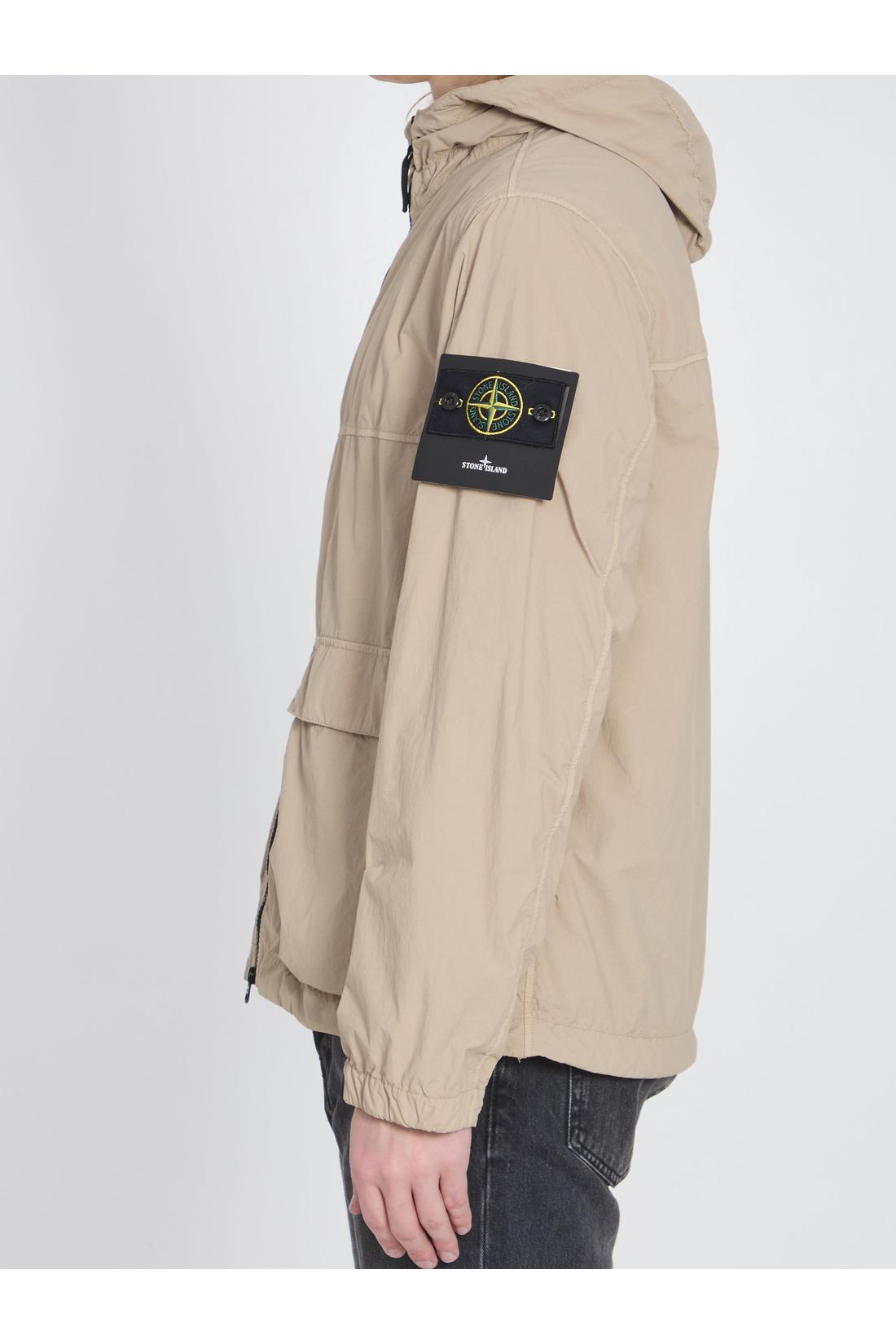 Beige nylon jacket. It features an adjustable hood with an internal drawcord, a zip front closure, two flap button pockets on the front, long sleeves, an iconic badge on the sleeve, and elasticated cuffs and hem. Regular fit.