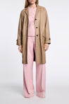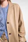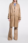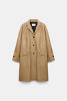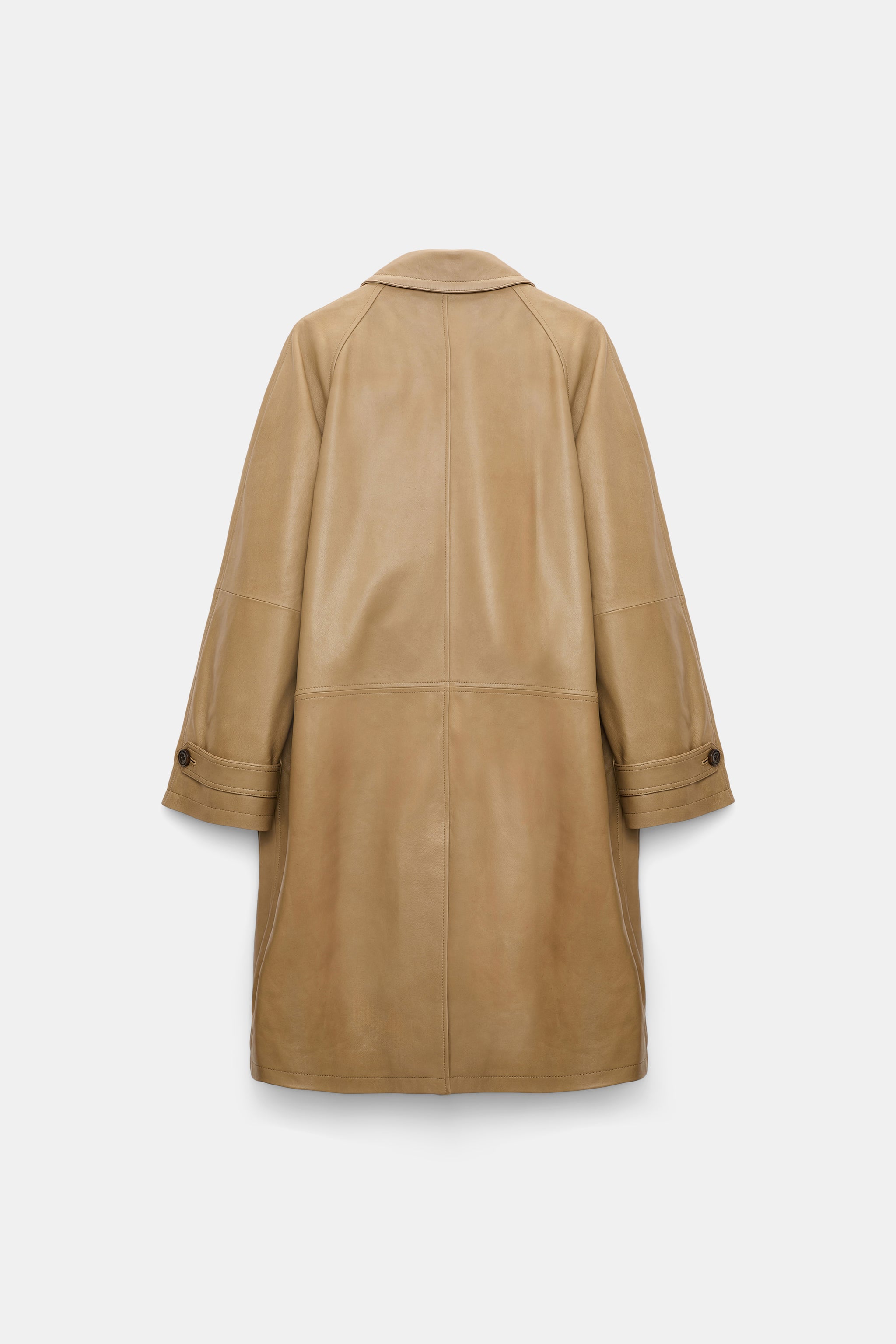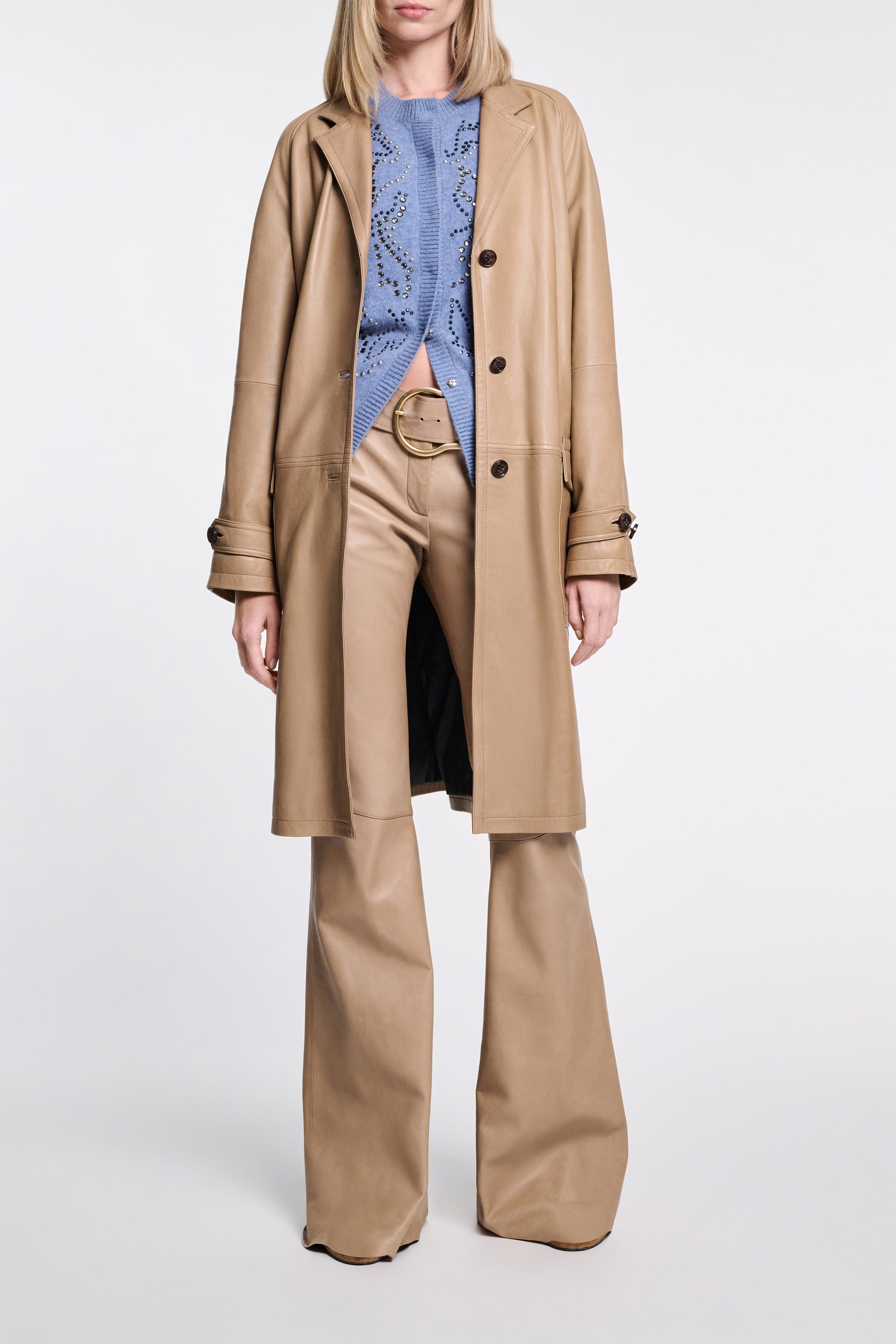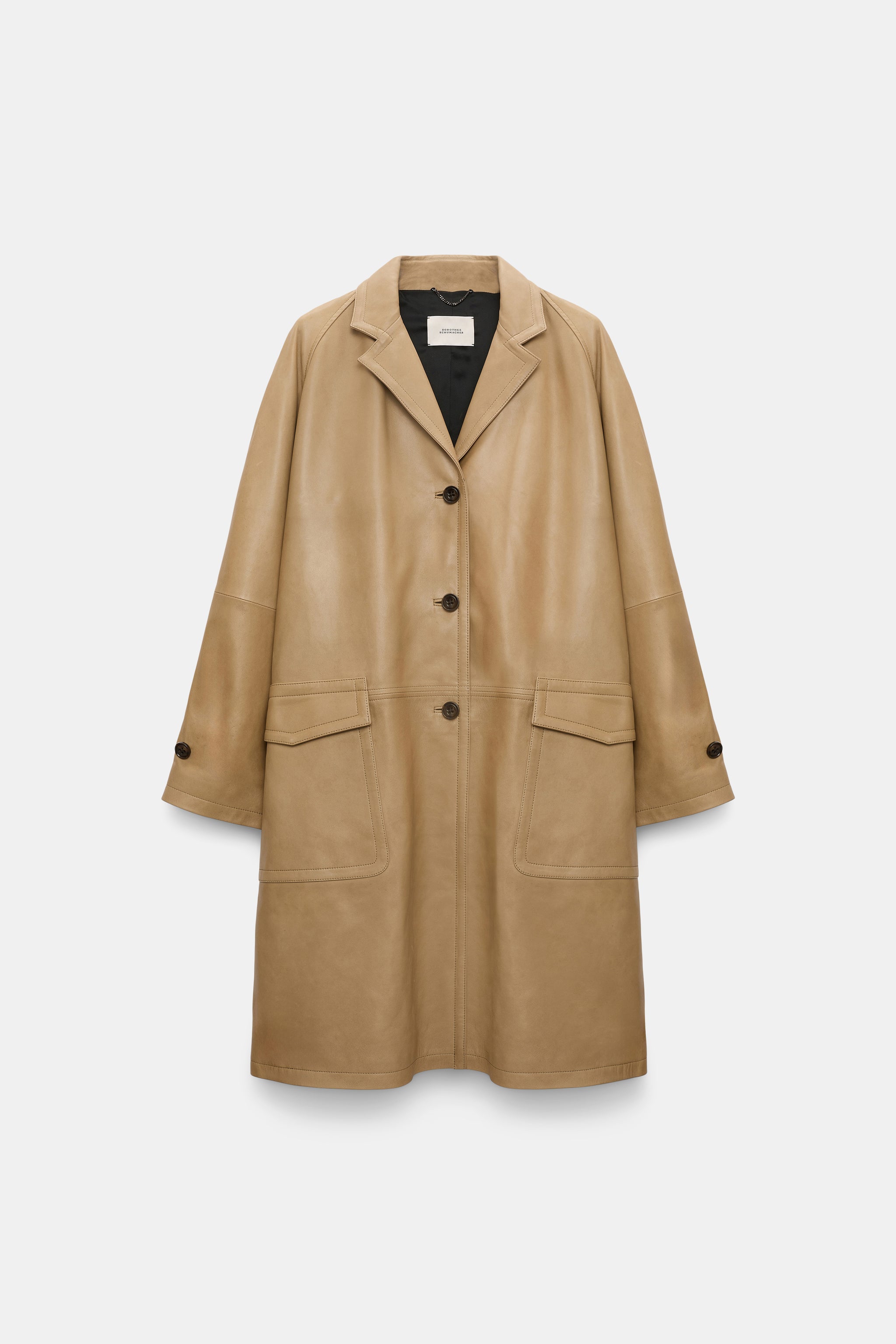 Der Mantel ist aus softem Lammleder gefertigt und hat eine elegante Silhouette. Raglanärmel und ein klassischer Reverskragen sorgen für einen zeitlosen Look. Nahttaschen, Leistentaschen und Riegel-Details verleihen dem Design einen lässigen Touch.