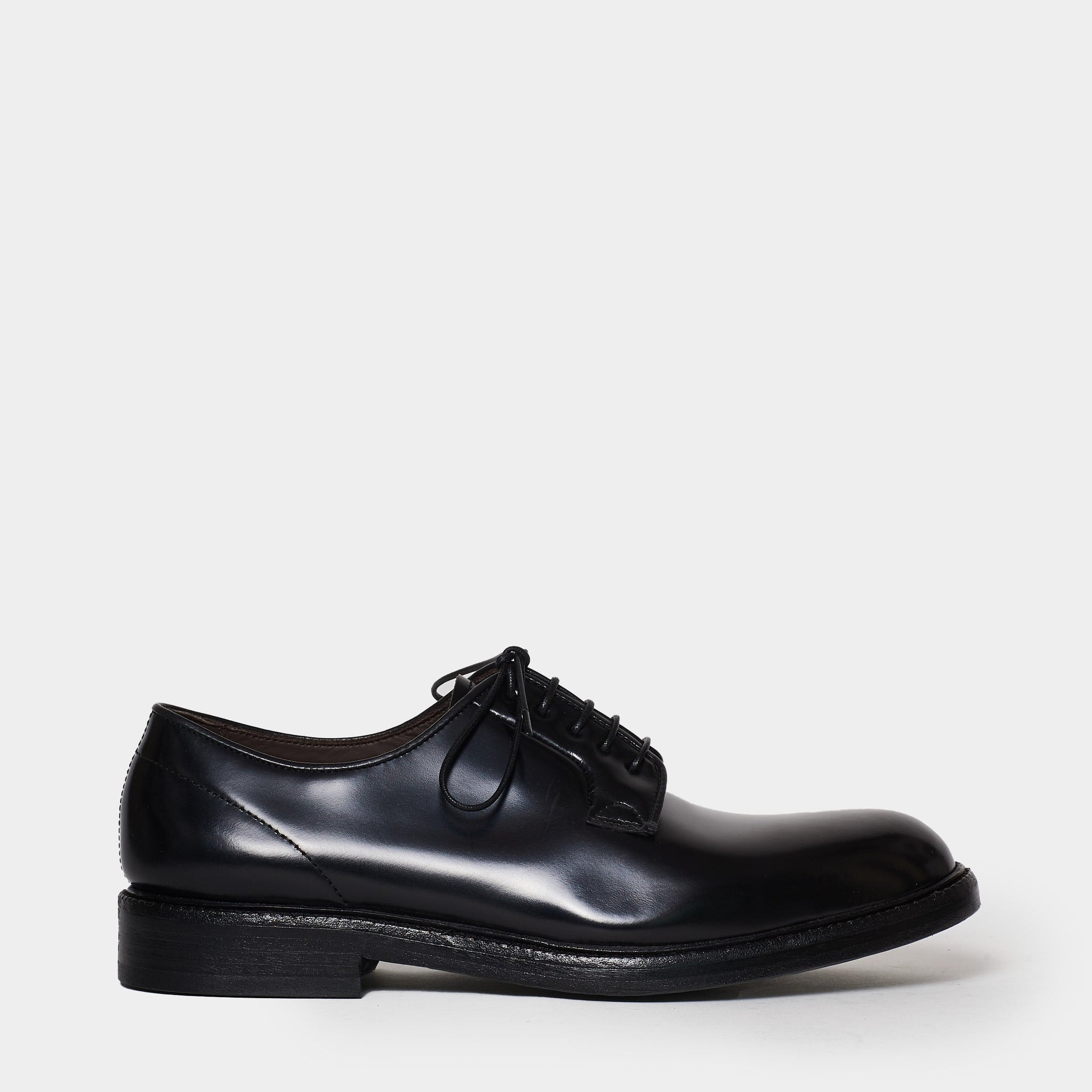 Step up your shoe game with these black polished leather derby shoes from GREEN GEORGE. Expertly handcrafted from full-grain leather, these shoes are durable and stylish. Featuring a double leather sole with non-slip rubber pads, they provide both comfort and stability. Perfect for any occasion, these shoes are a must-have for any fashion-conscious man. Order now and step out in style!
