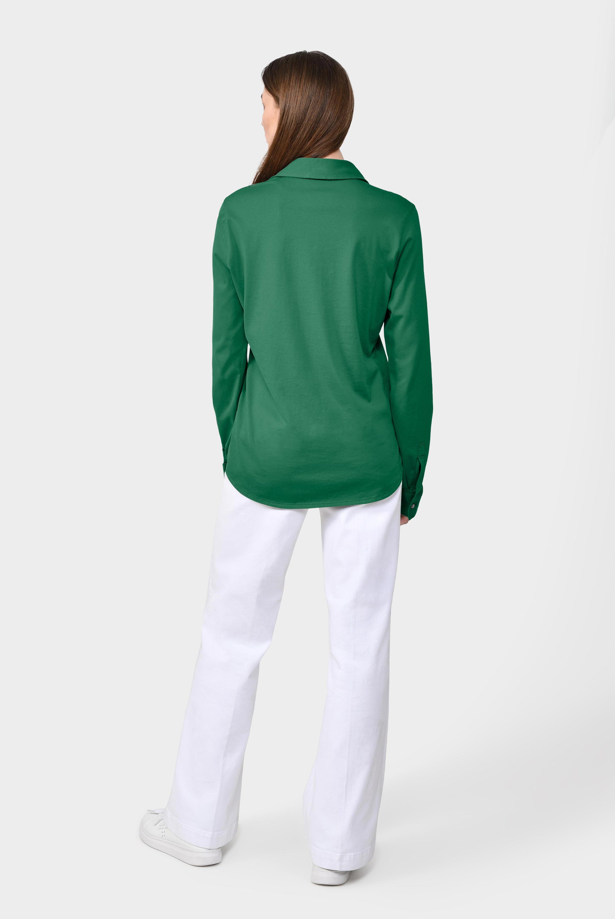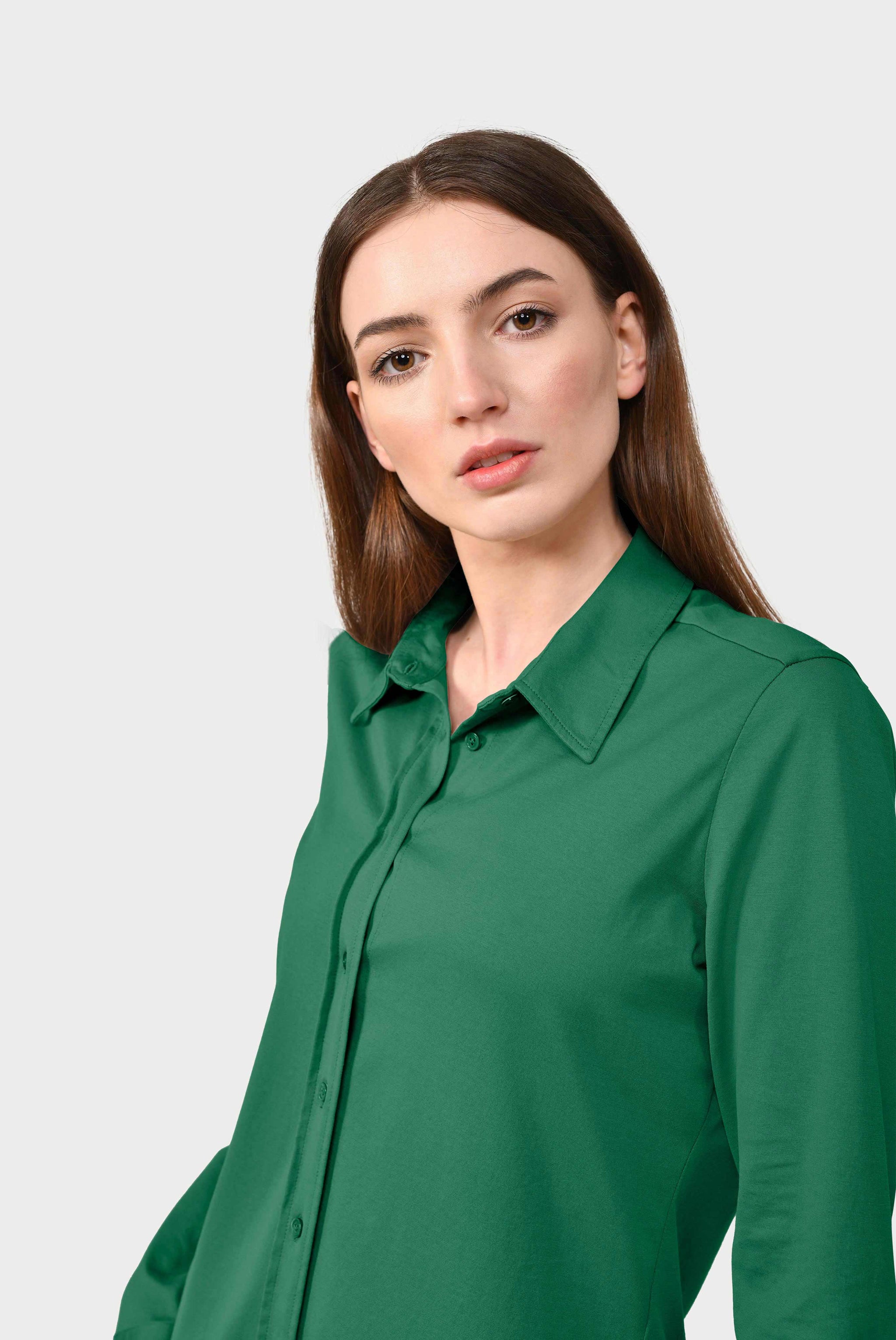 Die langärmlige Hemdbluse präsentiert sich in einem zeitlosen Design und ist perfekt für einen Casual Look! Das Oberteil besteht aus einem feinen Baumwolljersey, was diesem Modell einen zarten und edlen Glanz verleiht. Darüber hinaus ist durch den Materialmix ein idealer Tragekomfort gegeben.