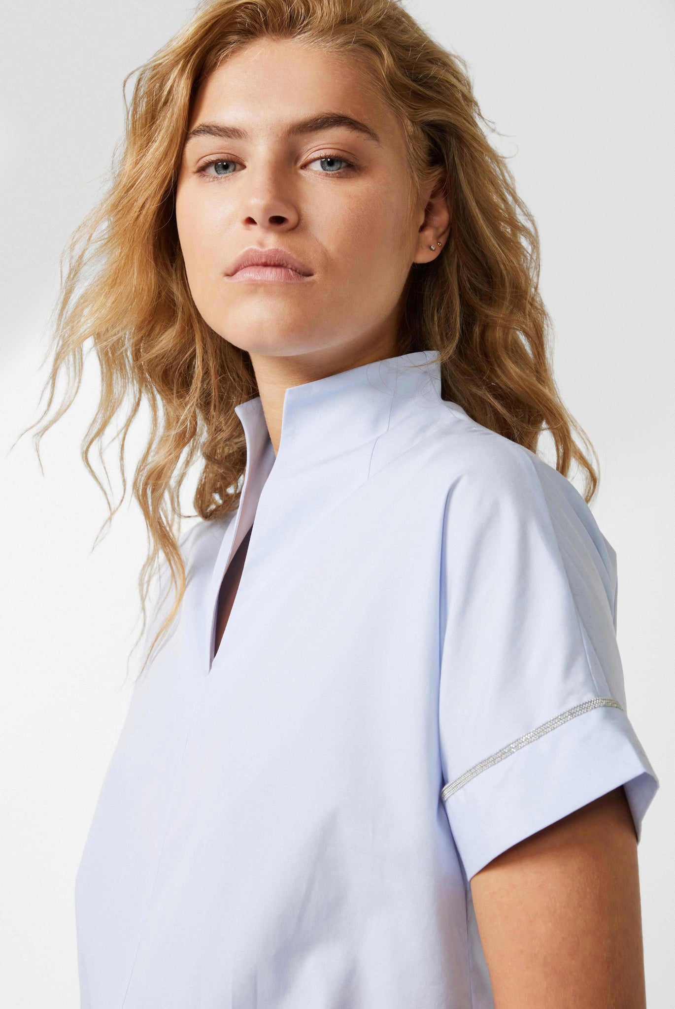 In die tailliert geschnittene Bluse aus fein texturierter Baumwoll-Popeline kann man sich nur verlieben! Dank ihres puristischen Looks ist sie ein facettenreich kombinierbares Talent, das mit genau der richtigen Portion Raffinesse auftrumpft. Mit ihrem mondän anmutenden Kelchkragen und den Zierbanddetails an den Ärmeln versinnbildlicht die Damen-Bluse die label-typische Schneiderkunst. Mit dieser Bluse kreiren Sie moderne und ausdrucksstarke Outfits. Die exklusive Qualität sorgt für ein komfortables Tragegefühl, das Sie den ganzen Tag über begleitet.
