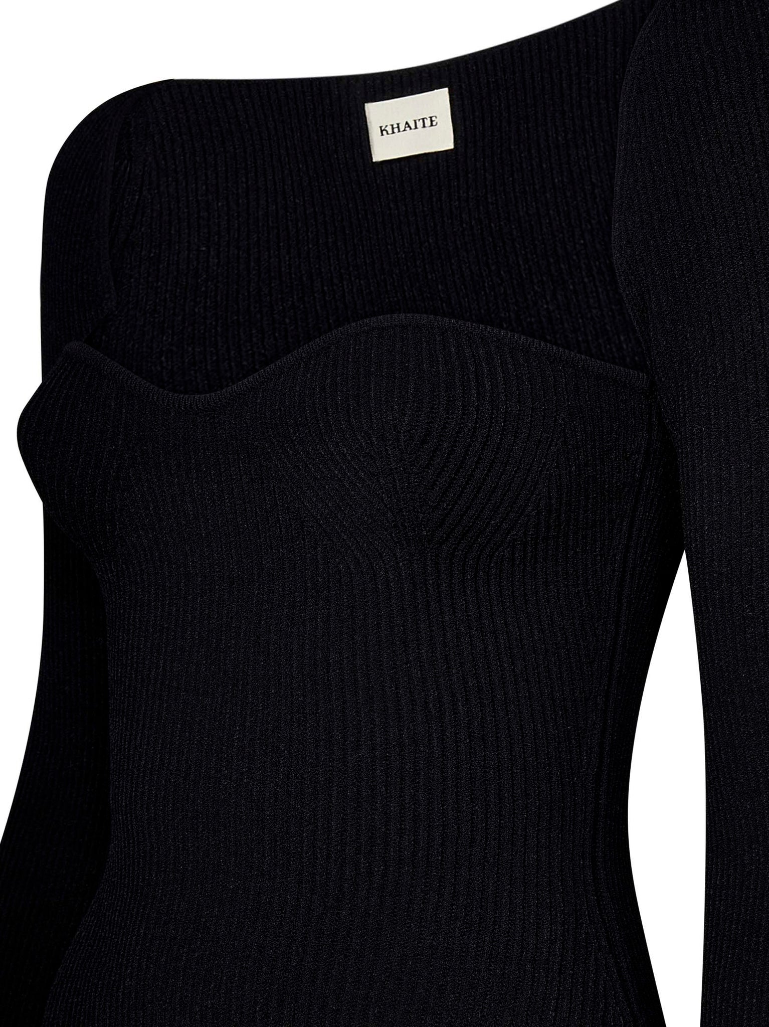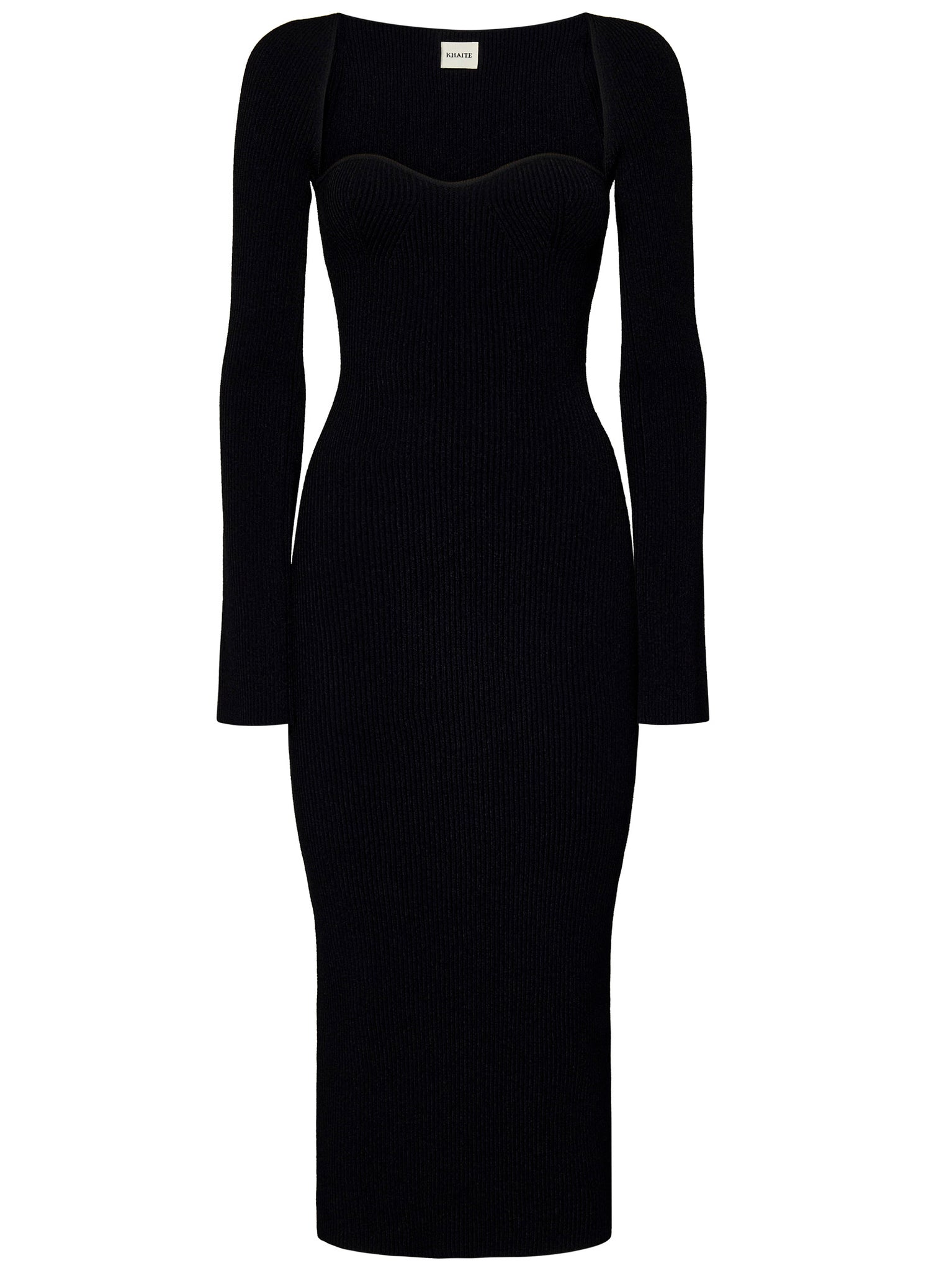 This Khaite NY black bustier-style midi dress features a sweetheart neckline and is crafted from a stretchy matte viscose ribbed knit. Designed for a fitted look, it flatters with a body-hugging silhouette.