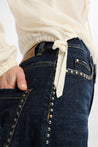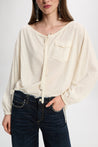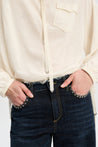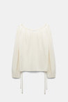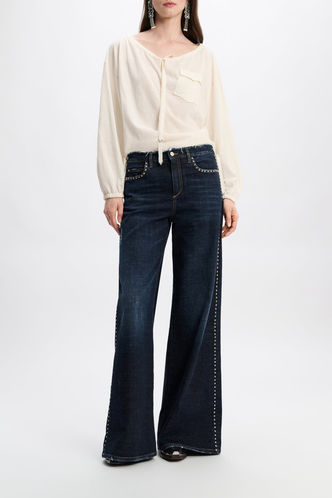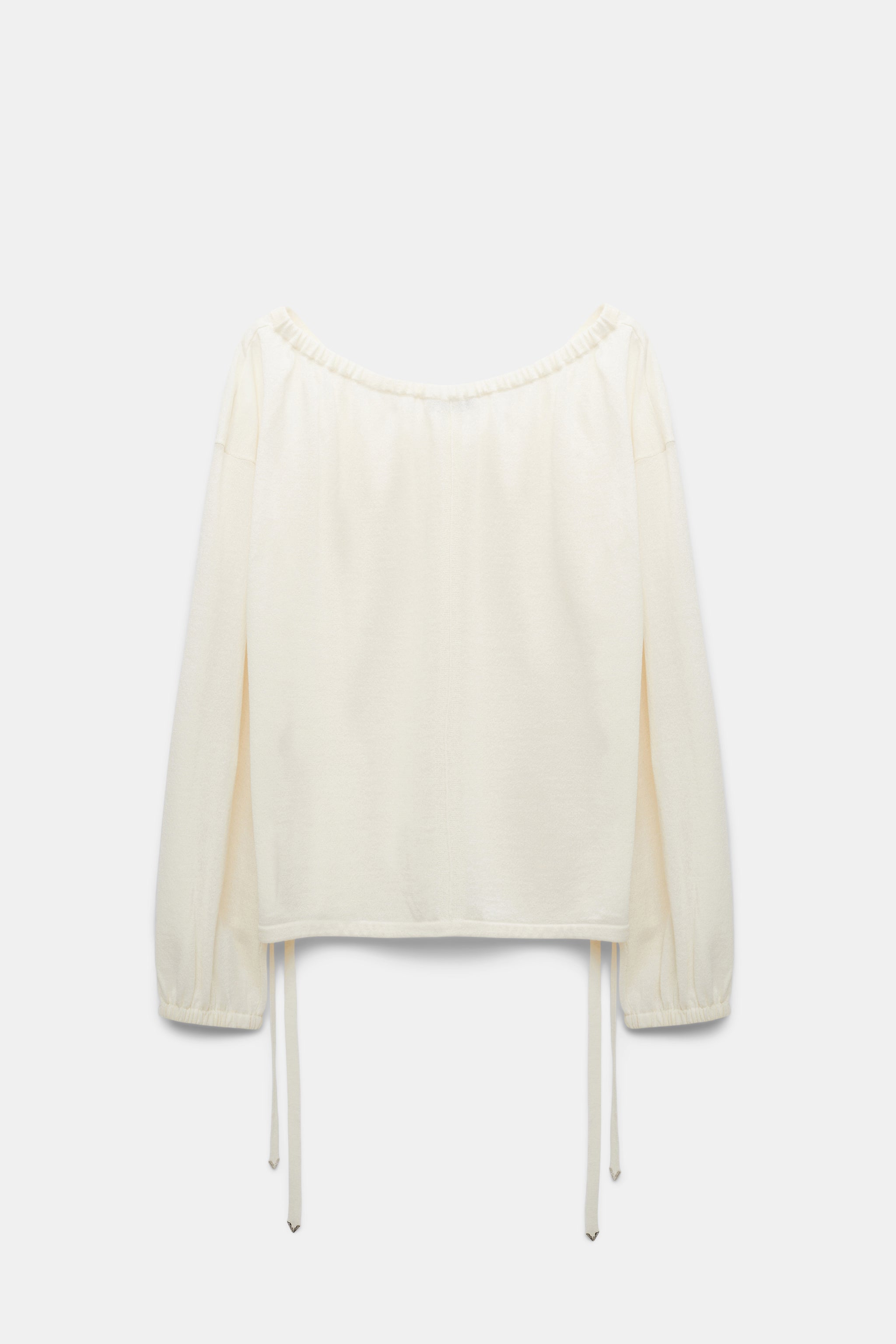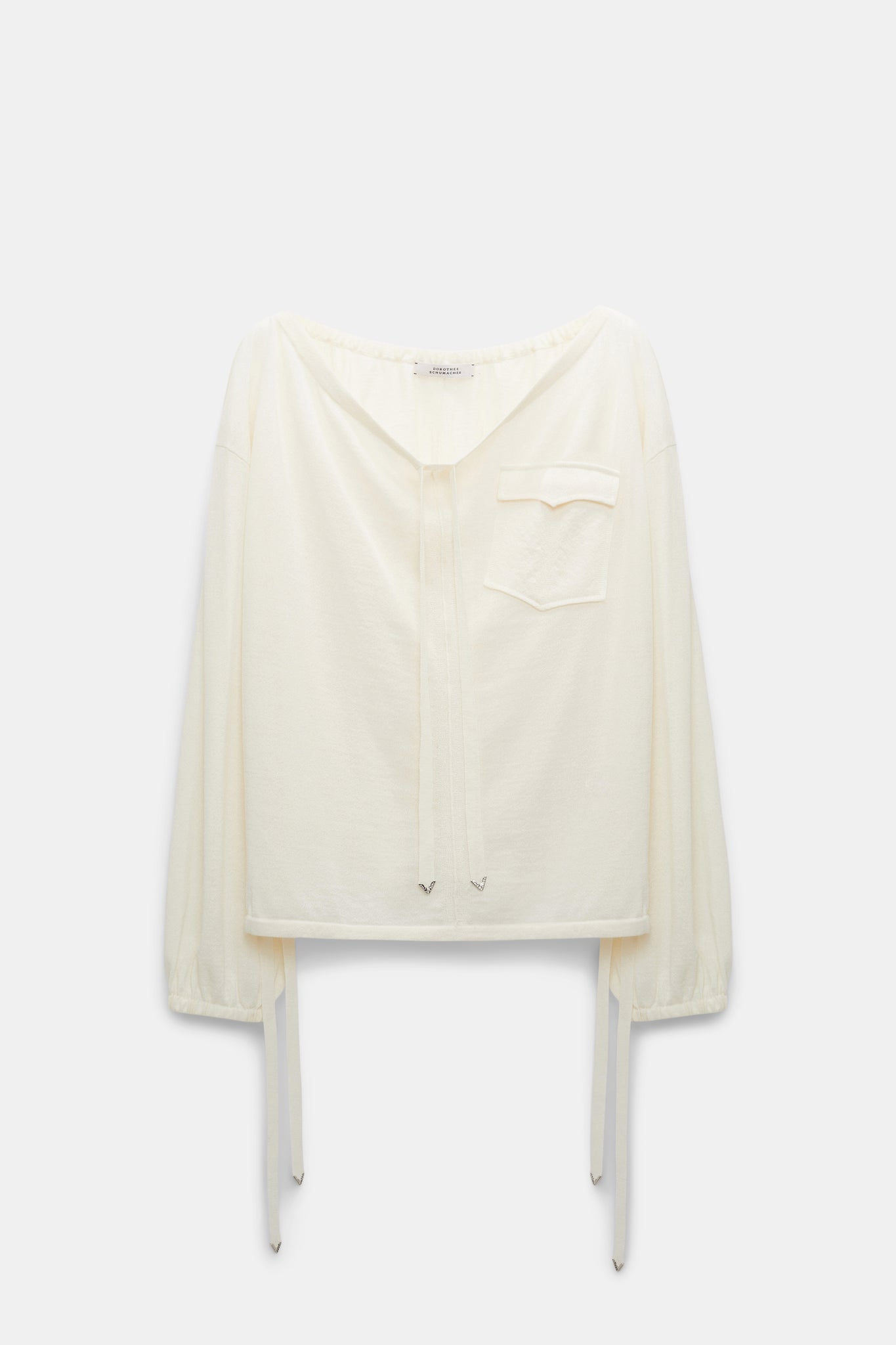 Der Pullover hat einen weiten Rundhalssauschnitt, der durch den Tunnelzug variabel angepasst werden kann. Der Woll-Baumwoll-Mix fühlt sich auf der Haut angenehm leicht an. Das Modell hat Western-inspirierte Details und geraffte Ärmelbündchen.