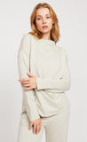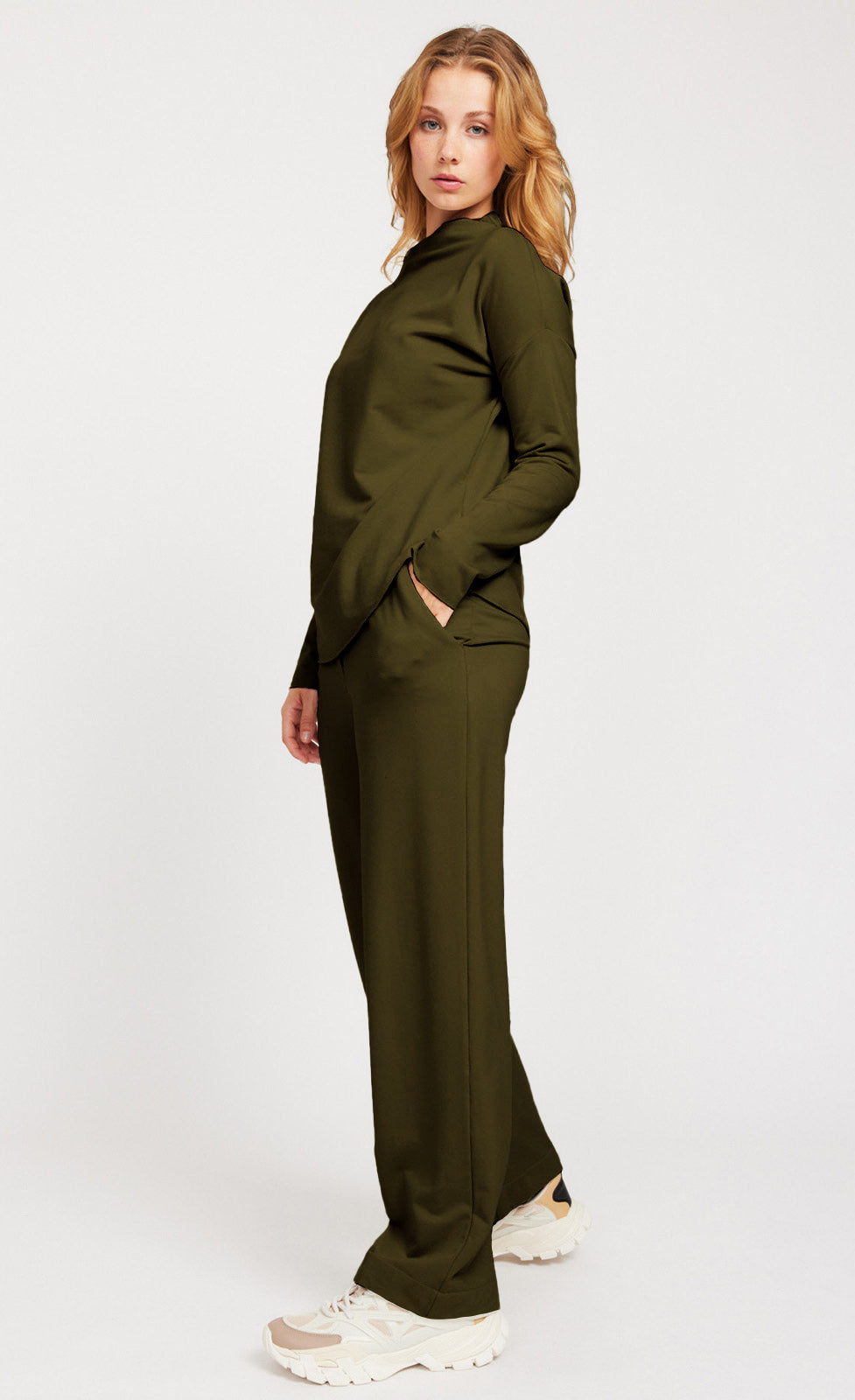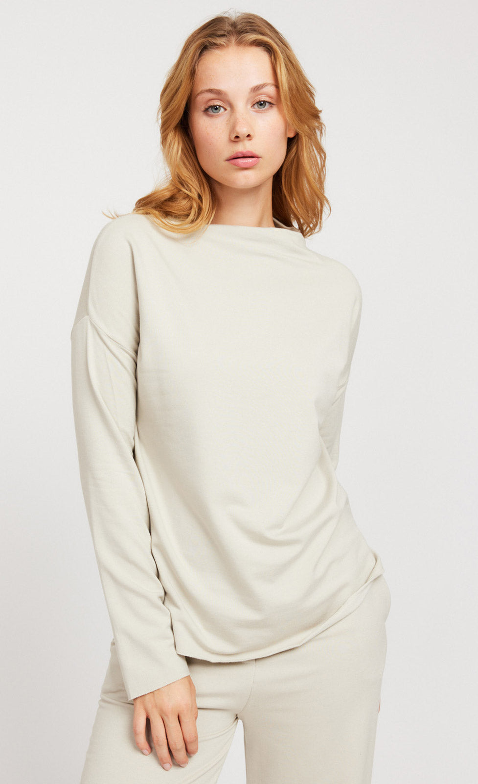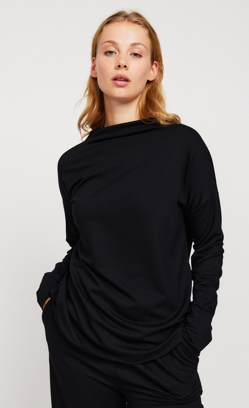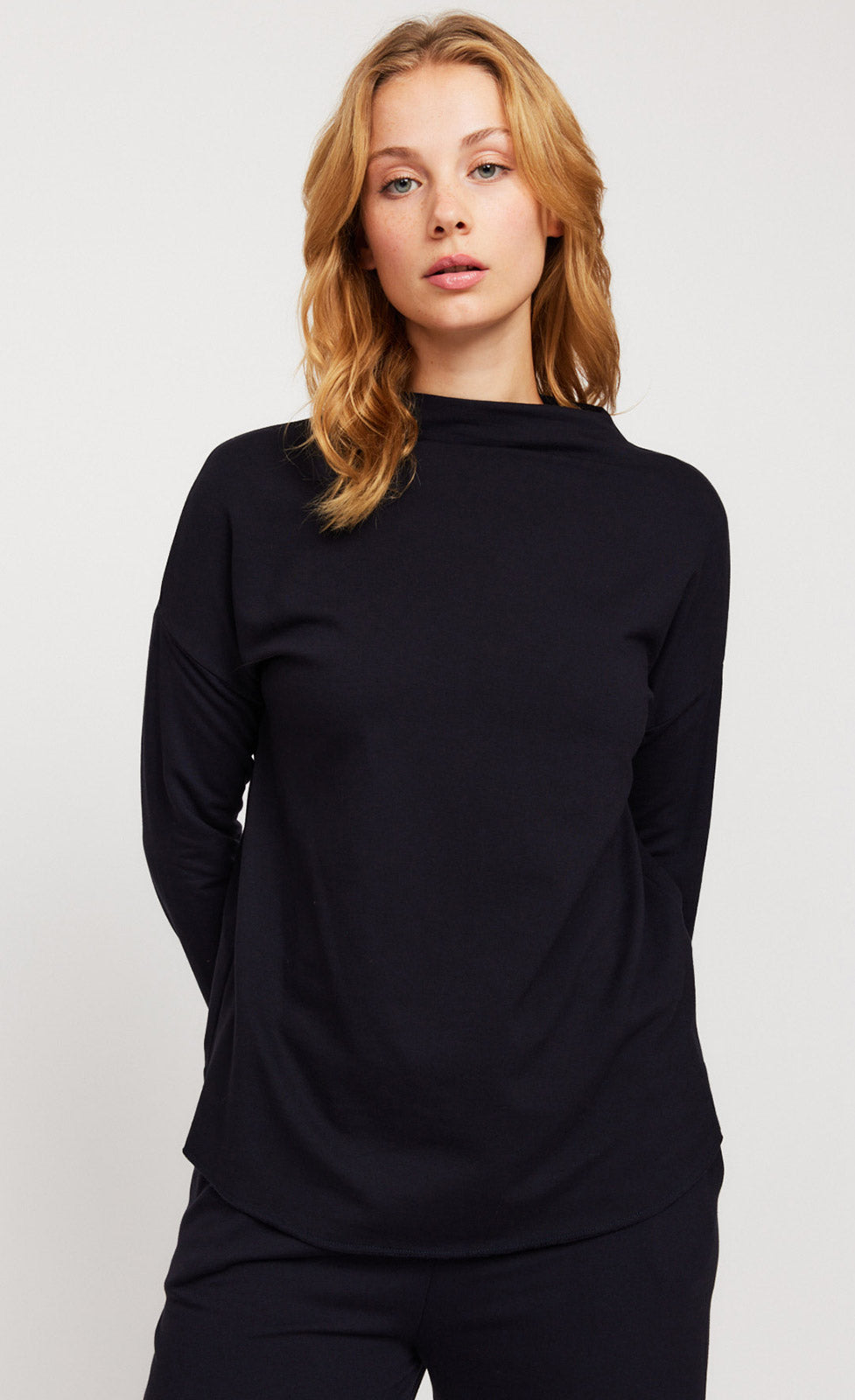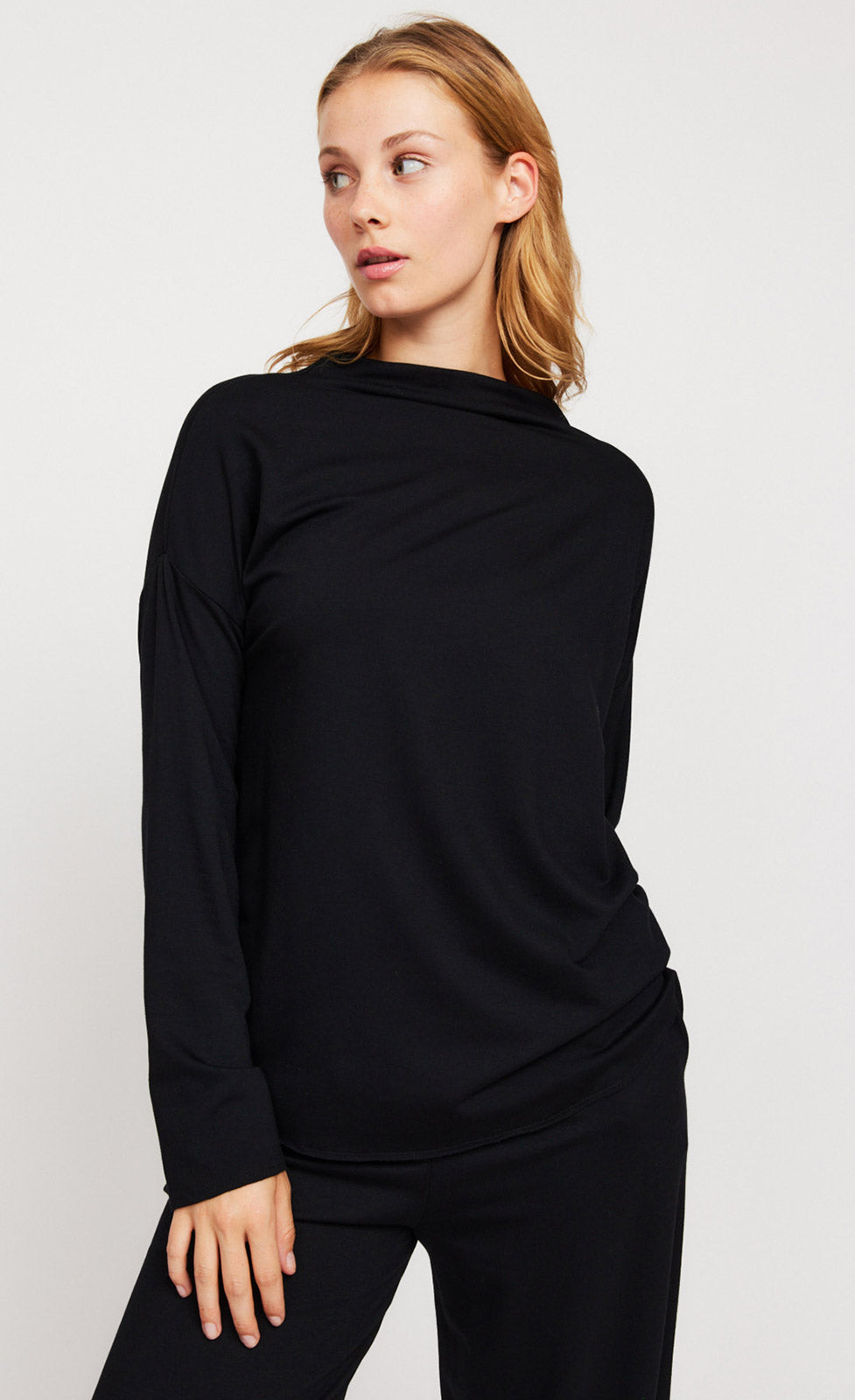 Dieses lässig geschnittene Langarmshirt mit angeschnittenem Stehkragen ist aus einem weichen Viskosegemisch hergestellt.
