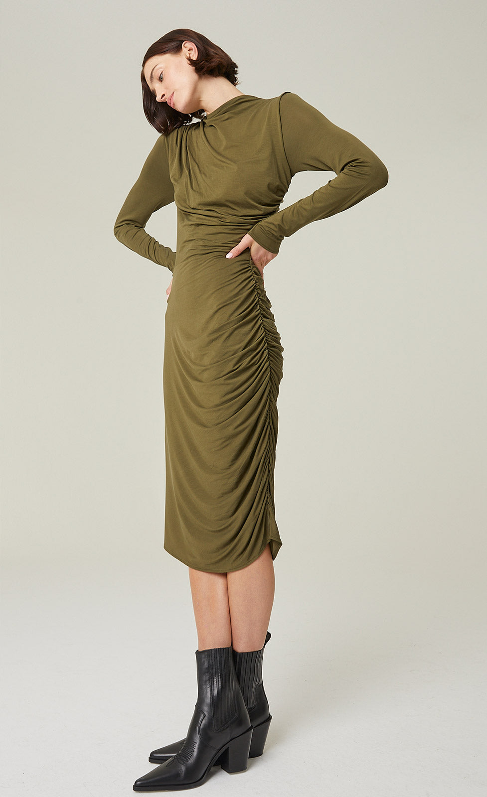 Dieses Kleid wurde aus hochwertigem, fließendem Lyocell-Jersey gefertigt und überzeugt durch sein einseitiges, gerafftes Design entlang der Seitennaht und an der Schulter. Der figurbetonte Schnitt unterstreicht den femininen Look dieses Kleides.