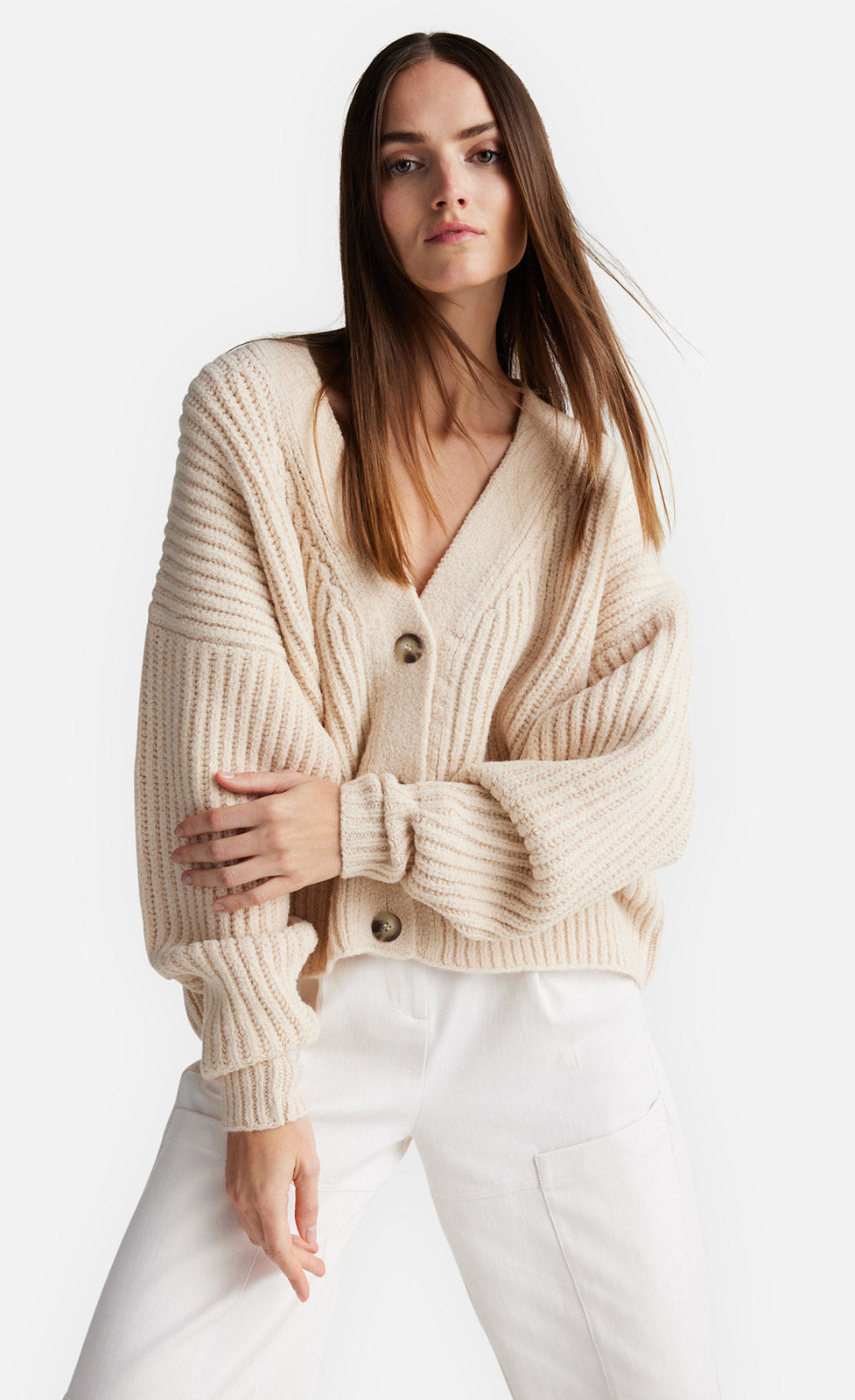 Dieser grob gestrickte Cardigan mit V-Ausschnitt erhält durch die besondere Abstrickung in Perlfang und den lockeren Schnitt einen neuen Twist.