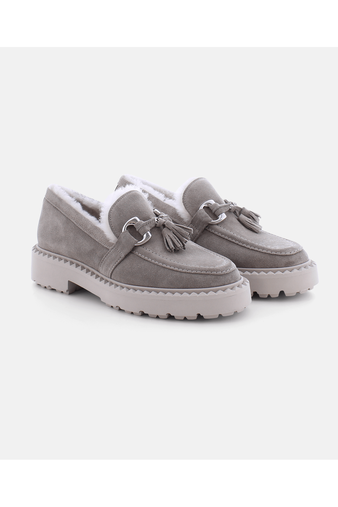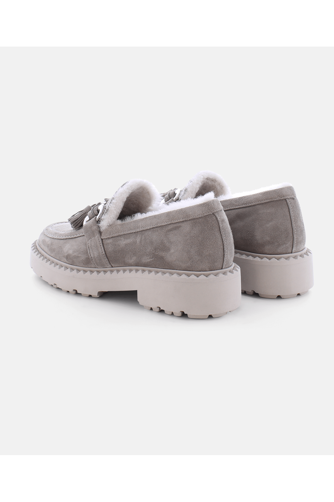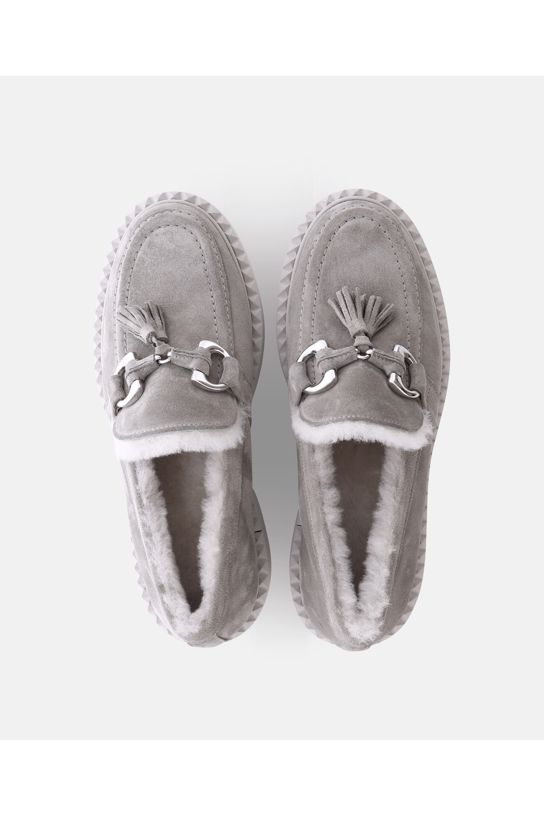 Der stylische Slipper ALEA L sorgt für moderne Akzente in Ihren Looks. Dank des kuscheligen Lammfellfutters können Sie das charmante Modell auch an kühleren Tagen noch mühelos tragen. Das hochwertige Veloursleder in hellem graubeige sorgt für einen stilvollen Look.