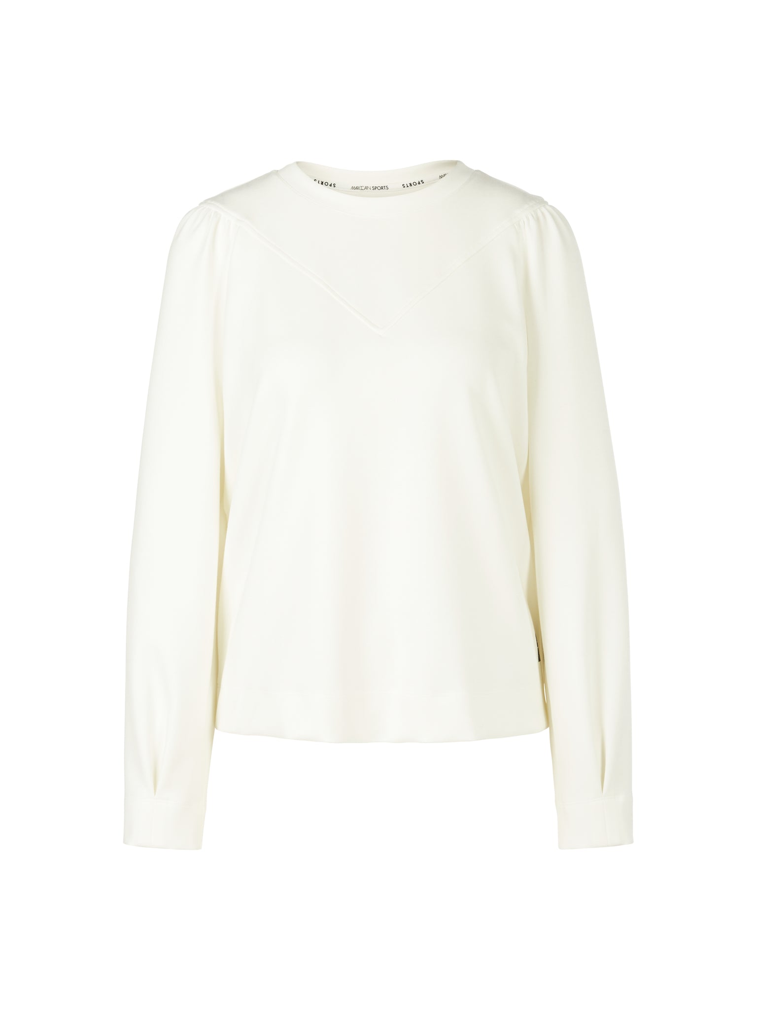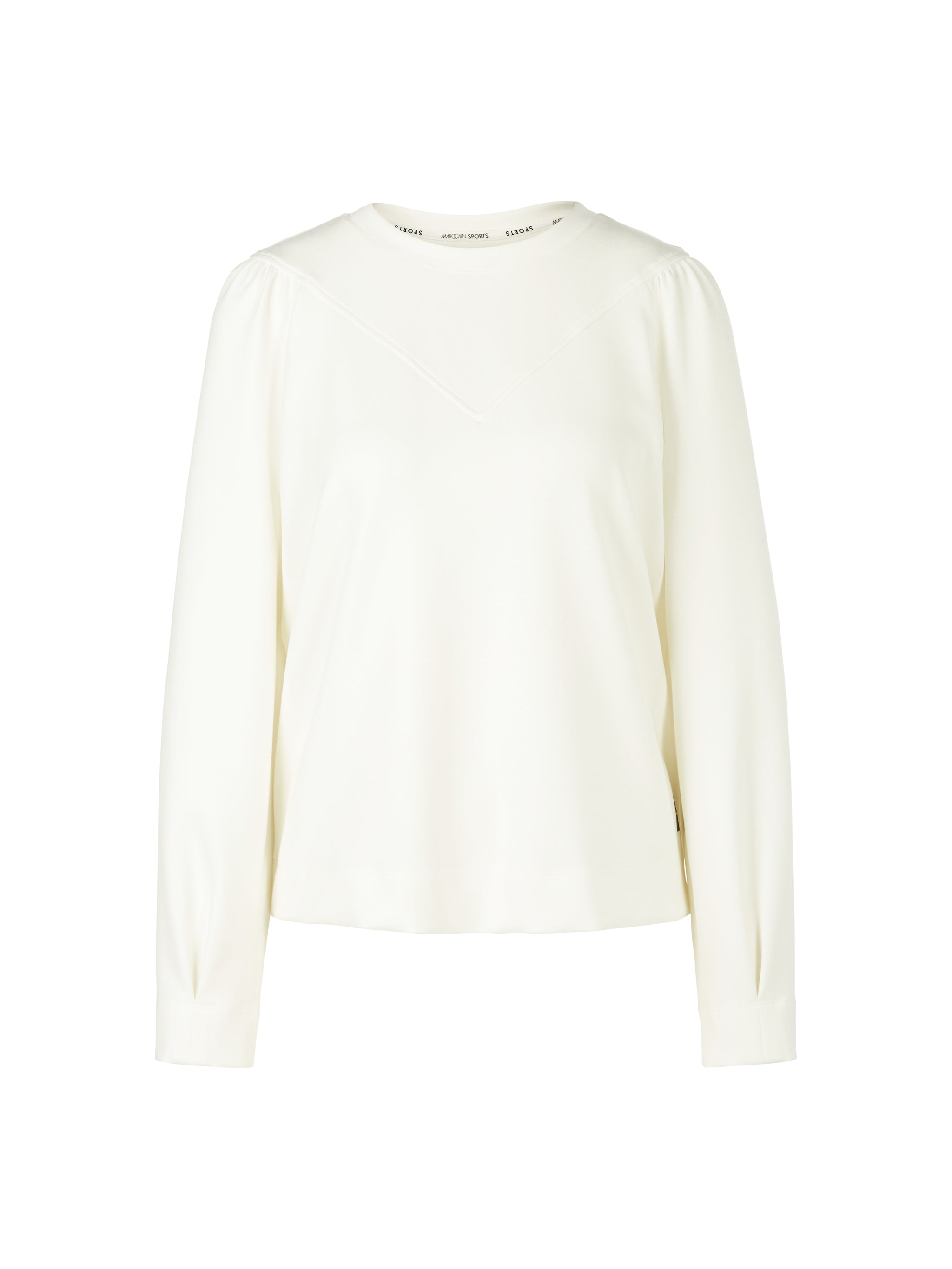 Sweatshirt aus weichfließendem Jersey. Die Schulterpartie ist schmal und durch eine dreieckige Form definiert. Der Raglanärmel ist an der Schulter gekräuselt und im Saum mit einer Kellerfalte gearbeitet. Vorder- und Rückenteil sind weit. Sportiver Schick für Office und Freizeit.