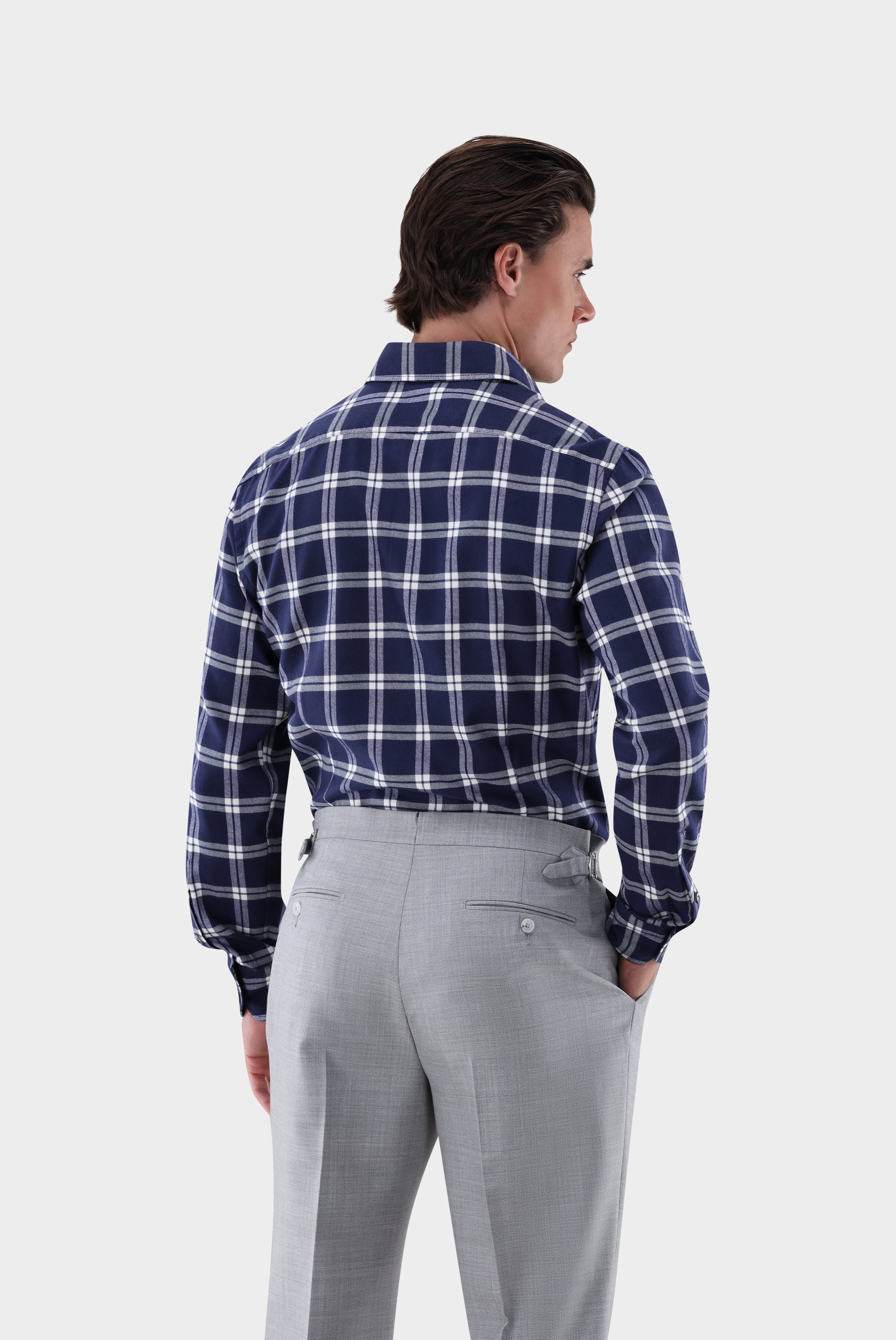 Dieses weiche Luxus-Flanellhemd besticht durch seine edle Materialqualität mit Kaschmir-Touch und angenehmer Haptik. Das karierte Design wird durch feine Paspelierungen und Perlmuttknöpfe elegant ergänzt. Der markante Haifischkragen sowie die glatte Knopfleiste unterstreichen das hochwertige, stilvolle Erscheinungsbild. Das Hemd bietet hohen Tragekomfort und eine zeitlose Optik, die sich vielseitig kombinieren lässt – ideal für elegante Freizeit-Outfits oder gehobene Casual-Looks.