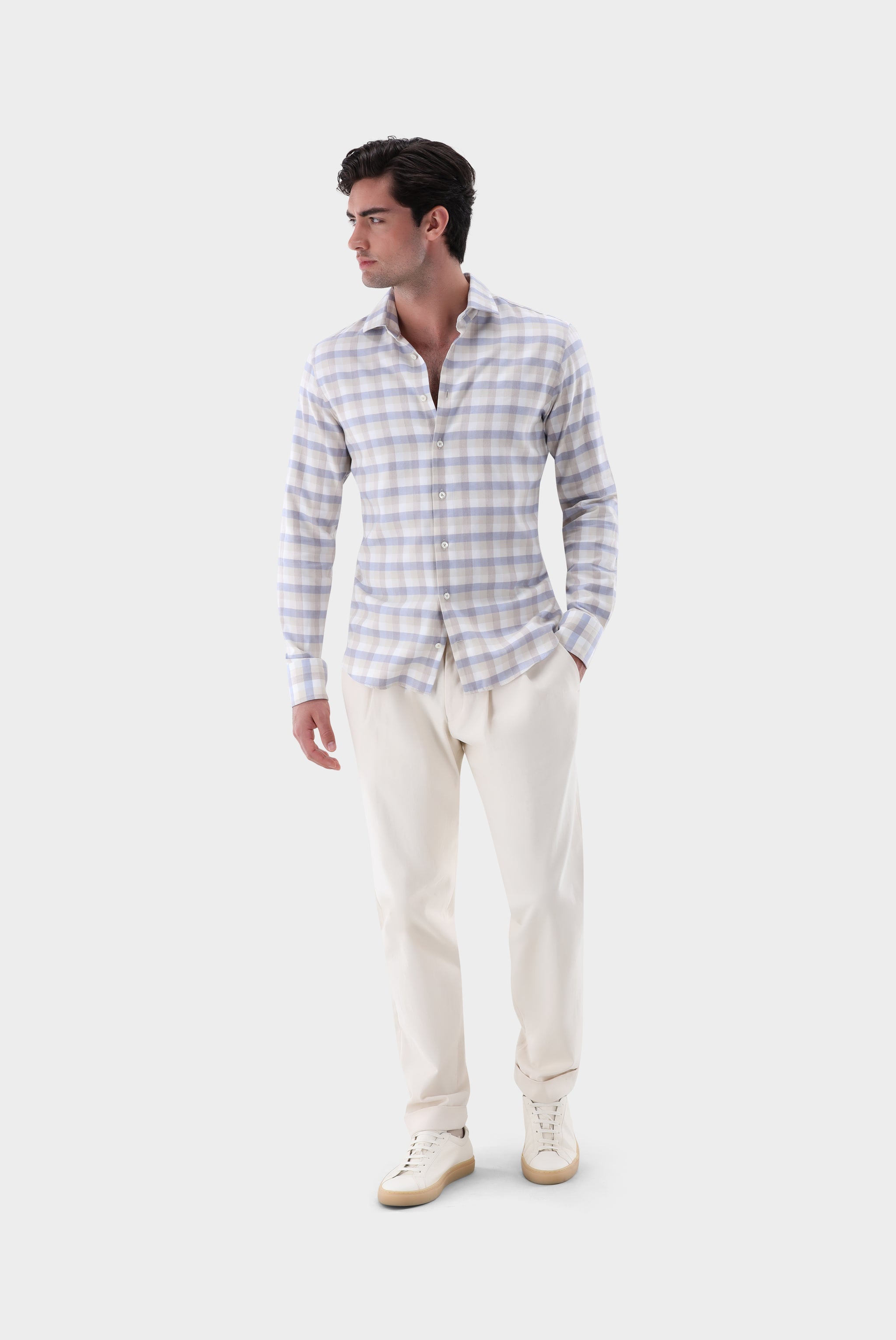 Dieses großkarierte Luxus-Flanellhemd begeistert mit besonders weicher Qualität und edlem Kaschmir-Touch. Der markante Haifischkragen verleiht dem Design eine moderne, elegante Note. Feine Paspelierungen setzen dezente Akzente und unterstreichen die hochwertige Verarbeitung. Abgerundet wird das Modell durch exklusive Perlmuttknöpfe, die den luxuriösen Charakter zusätzlich hervorheben. Das Hemd bietet höchsten Tragekomfort und eignet sich ideal für stilvolle Business- und Freizeit-Looks.