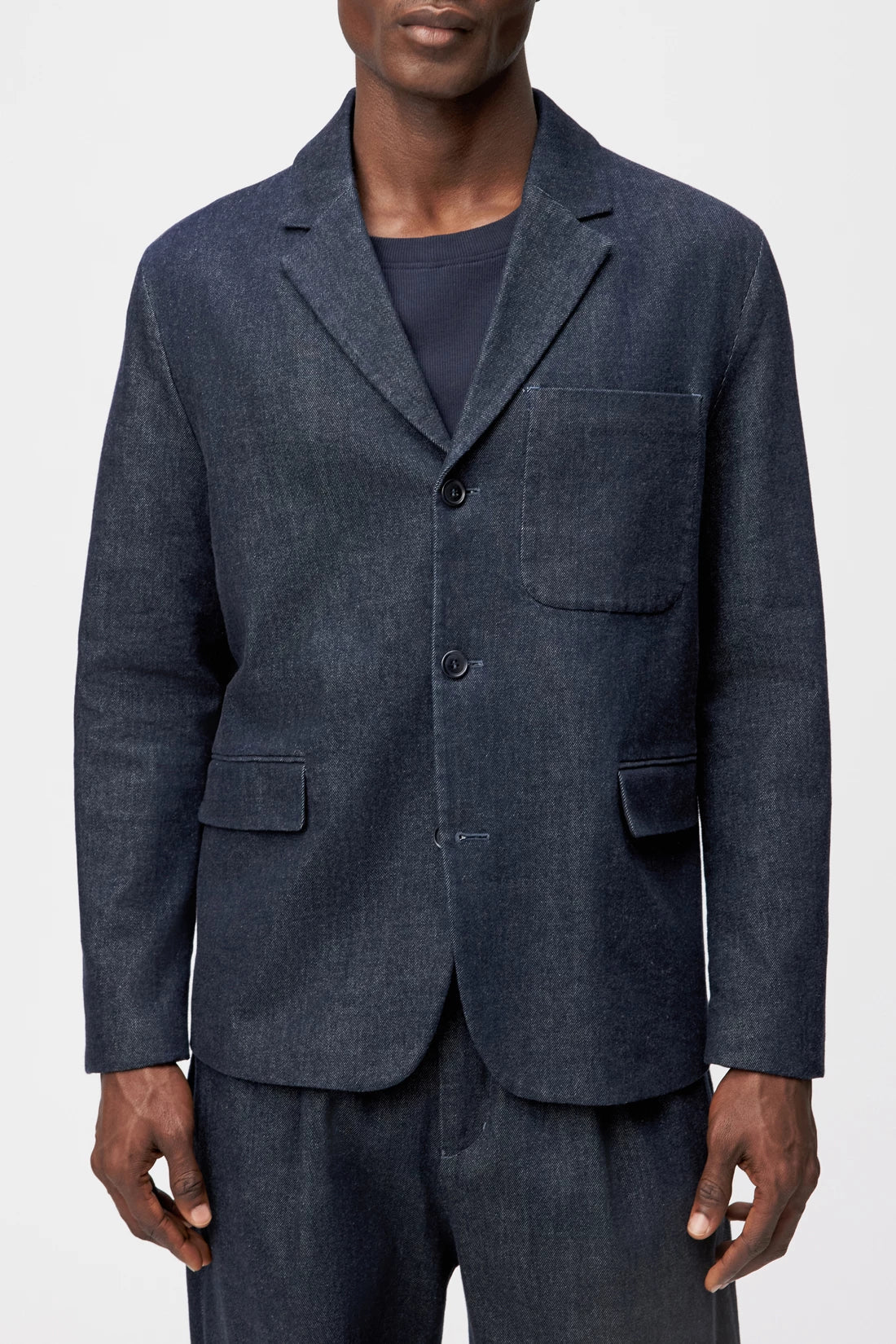 SAMICO is a workwear-inspired jacket with a short, falling lapel and distinctive breast pocket. Two flap pockets emphasise the functional look. The unlined finish ensures exceptional comfort and a relaxed silhouette. The indigo denim has a deep colour and a slight wash effect, making it a real everyday essential.