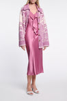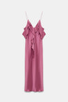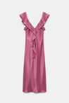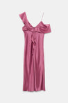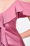 Das Kleid ist aus Seiden-Satin gefertigt. Die Volantärmel, die mit einem eingearbeiteten Silikontape versehen sind, ermöglichen es, das Kleid off-shoulder oder auf der Schulter zu tragen. Der Body hat ein glänzendes Finish, während die Volants mit