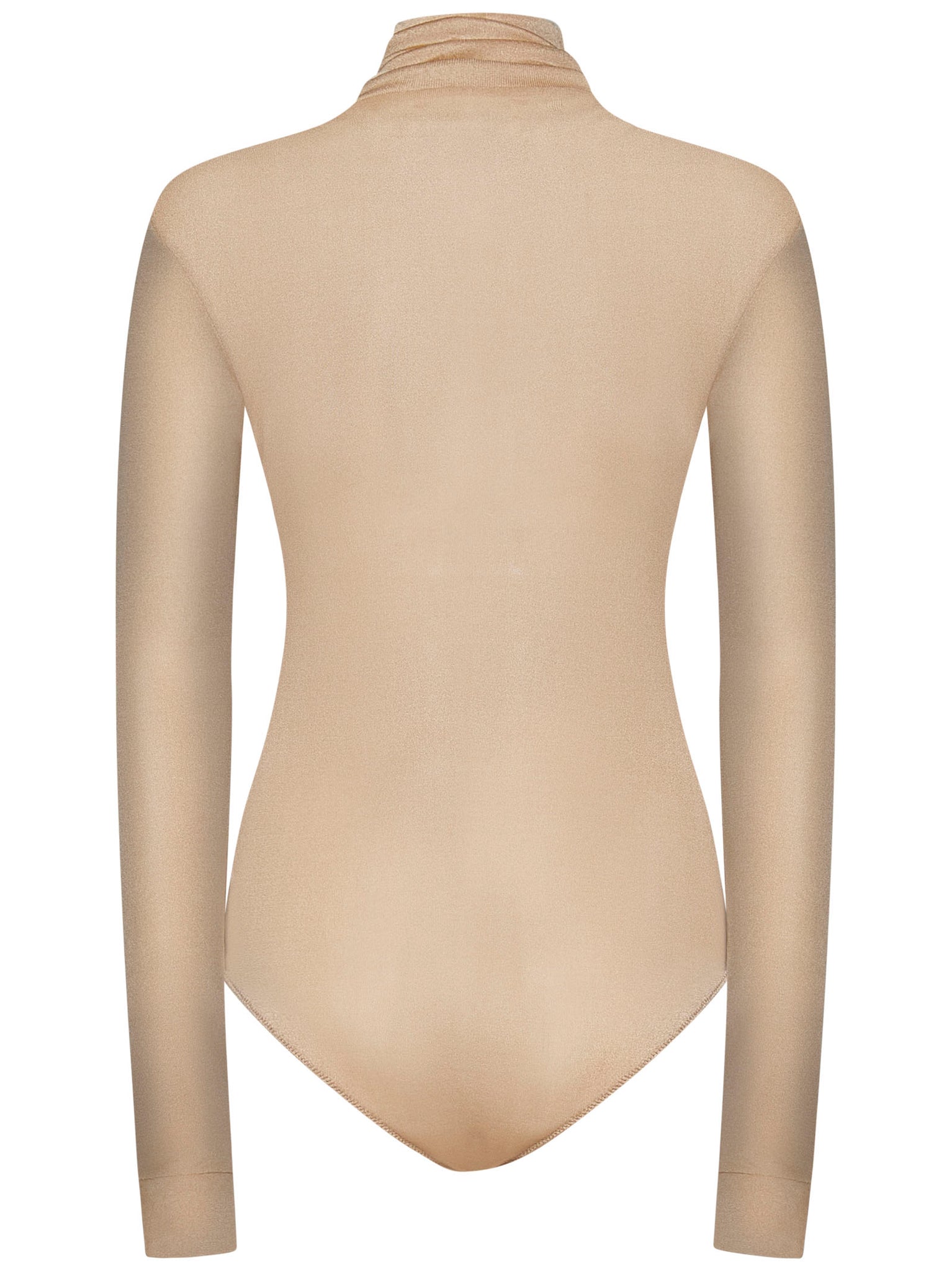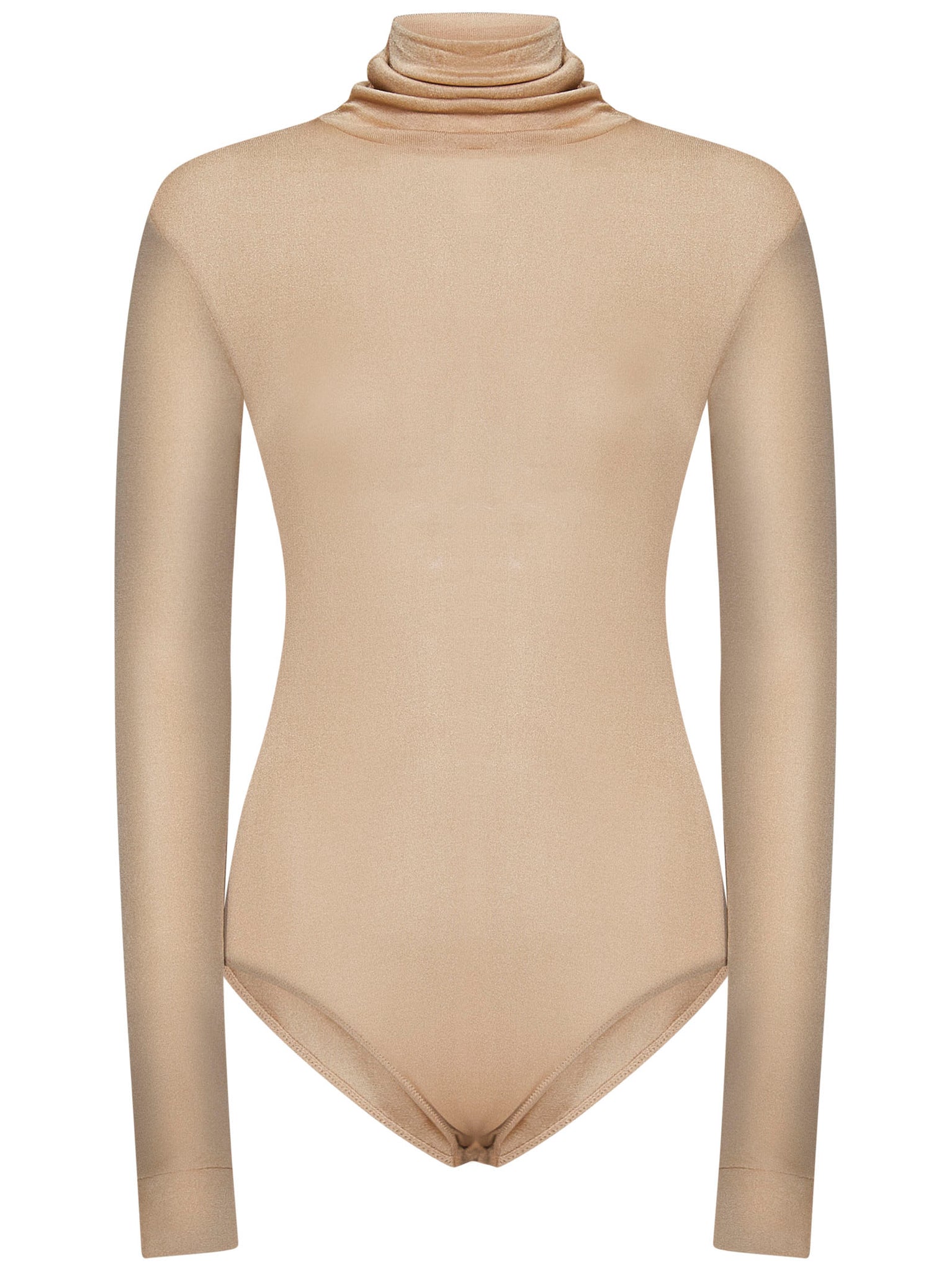 This Maison Margiela bodysuit features a long-sleeved nude design and a stylish turtleneck. The fitted silhouette highlights your figure, while the four stitches detail adds a unique touch. Perfect for layering or wearing alone.