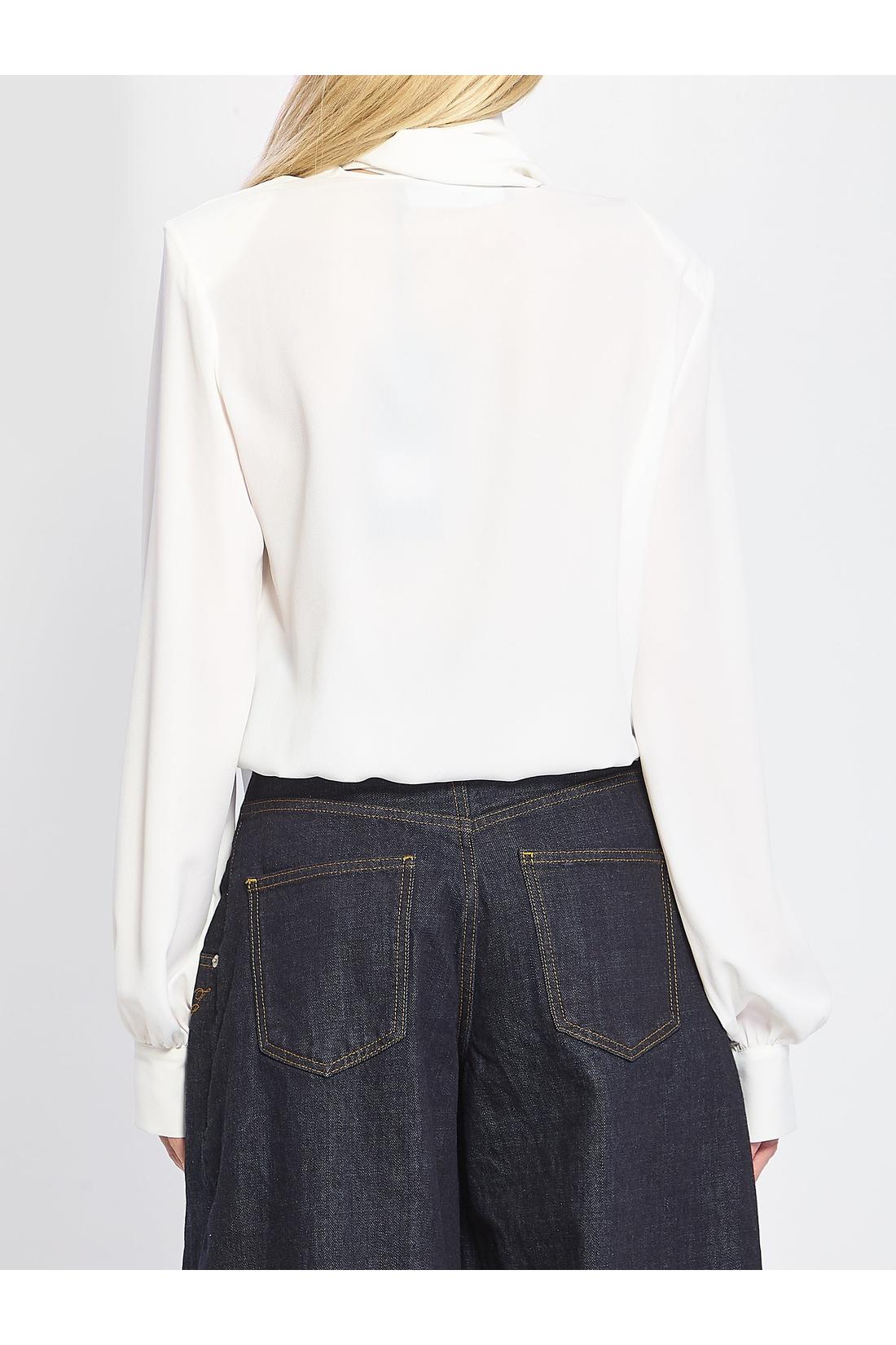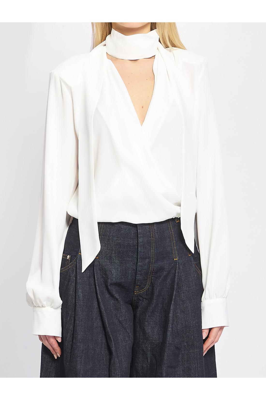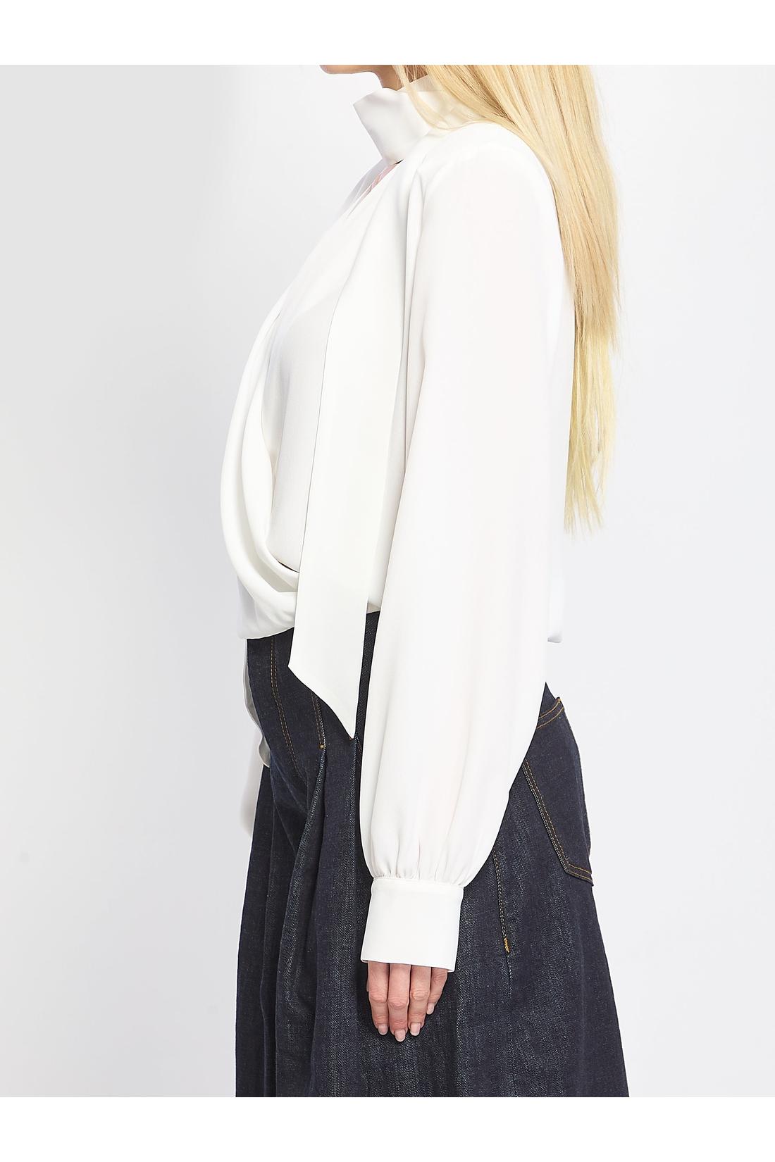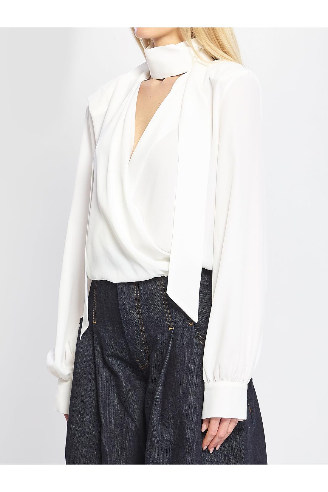 Blusa a portafoglio in acetato e seta bianca. Presenta scollo profondo, spalline imbottite, maniche lunghe con spacchi sui polsini, coulisse sul fondo, sciarpina coordinata rimovibile con bottone. Vestibilità regular.