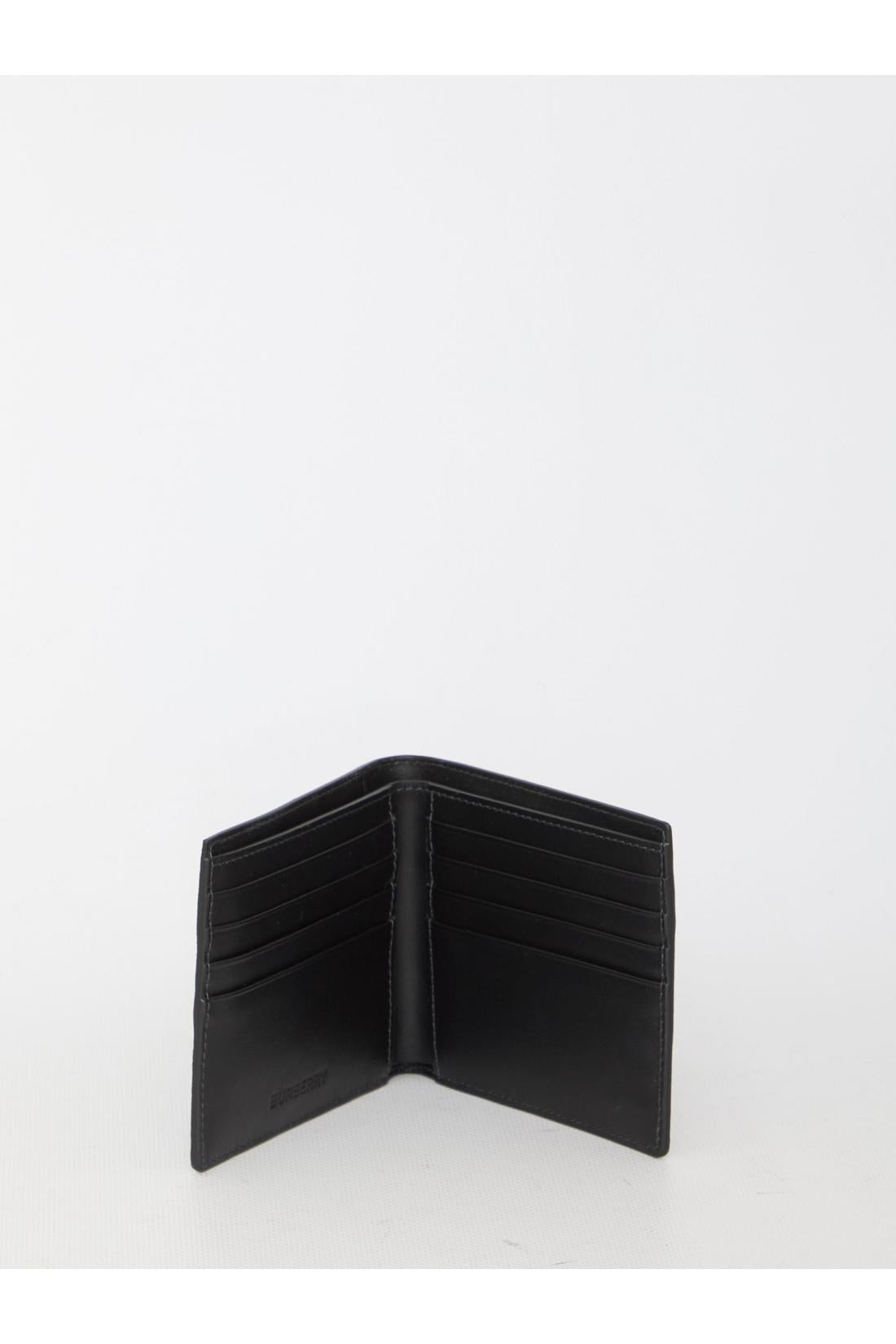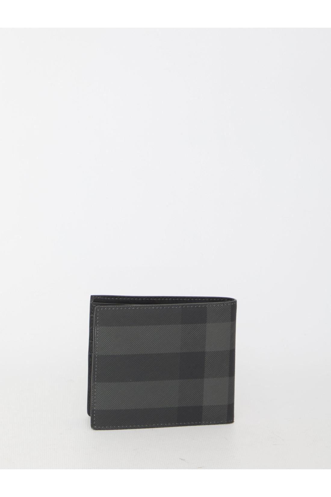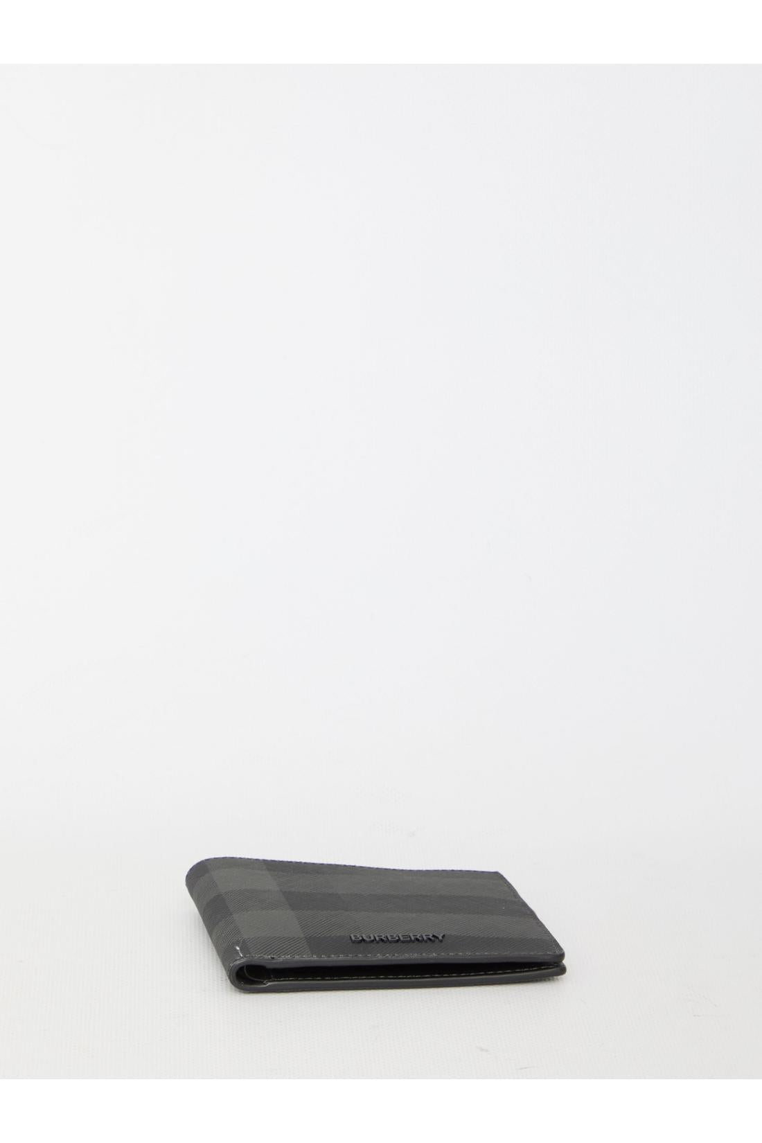 Bi-fold wallet in grey Check fabric with Burberry logo on the front. It features two bill compartments, eight card slots and two additional slip pockets.