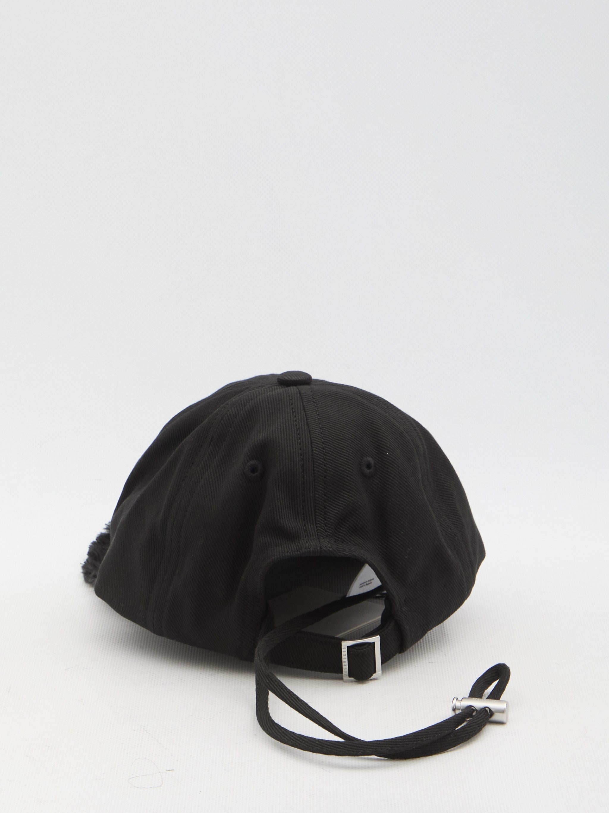 Le Casquette Artichaut baseball hat in black cotton. It features a silver-tone metal logo on the front, a frayed brim, an adjustable buckle at the back, and a long adjustable chin cord.