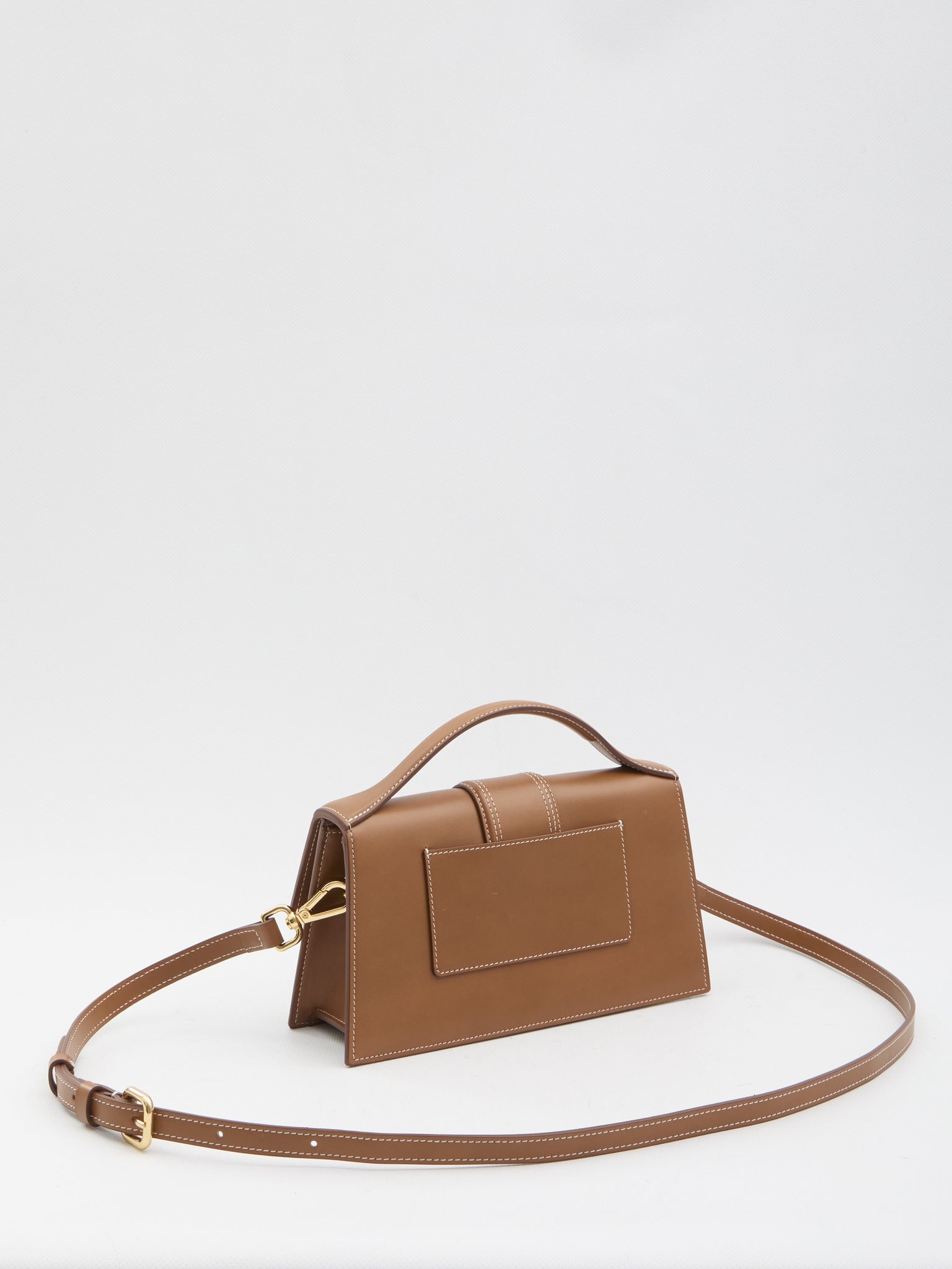 Le Grand Bambino bag in smooth Light Brown leather. It features a fixed top handle, visible stitching, a gold-tone metal logo on the front, an external flat pocket on the back, a removable and adjustable shoulder strap, a magnetic closure with a flap, one main internal compartment, an internal flat pocket, and a cotton lining. Dust bag included. Any imperfections in the leather should not be considered manufacturing defects, but rather a characteristic of the material.